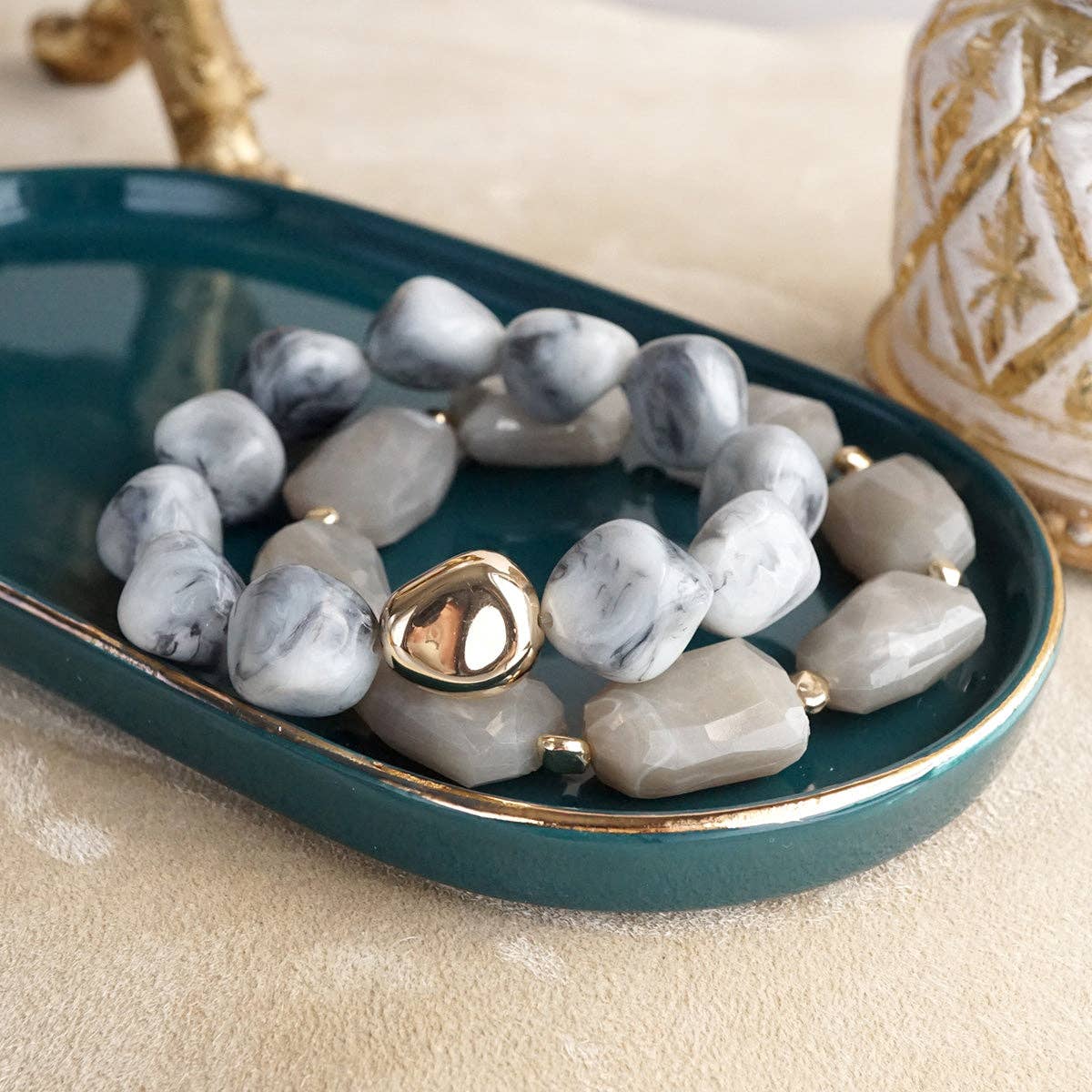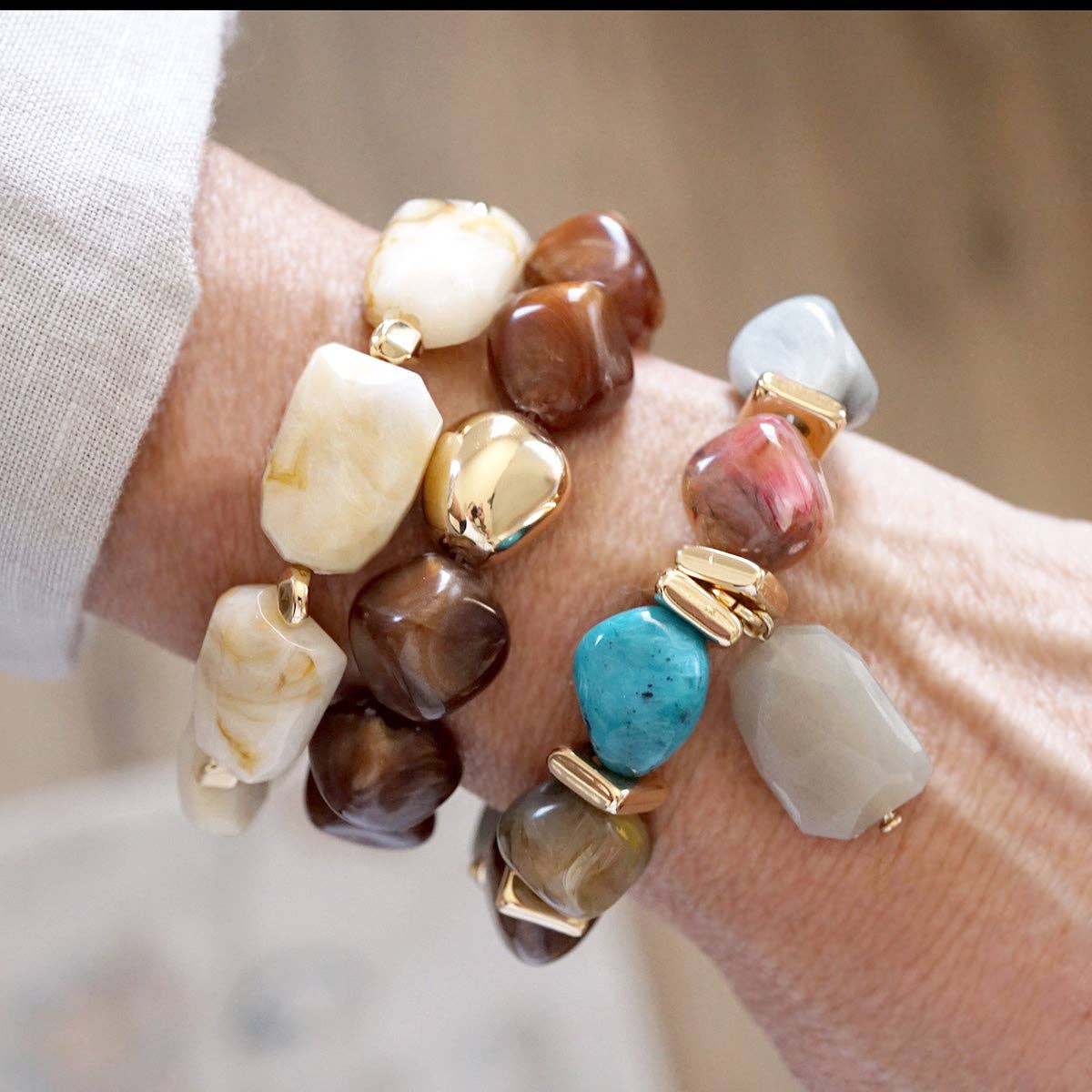 DETAILS * Chunky acrylic beads in organic, freeform shapes * Style 1: Sets of 2 with golden accent beads, available in 3 colorways (gray, neutrals, turquoise) * Style 2: Multicolor single bracelet with golden spacer beads and a dangling gray bead * Stretchy fit: one size fits most