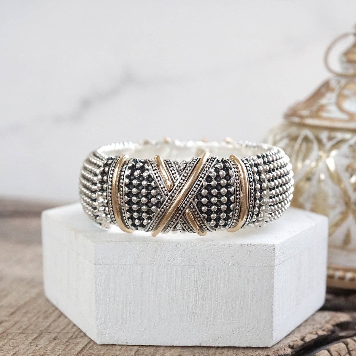 Each 1" wide cuff features a stretchy fit for easy layering, with rich caviar texture and intricate details—twist, chain, X, filigree, and two-tone variations add personality to your stack.