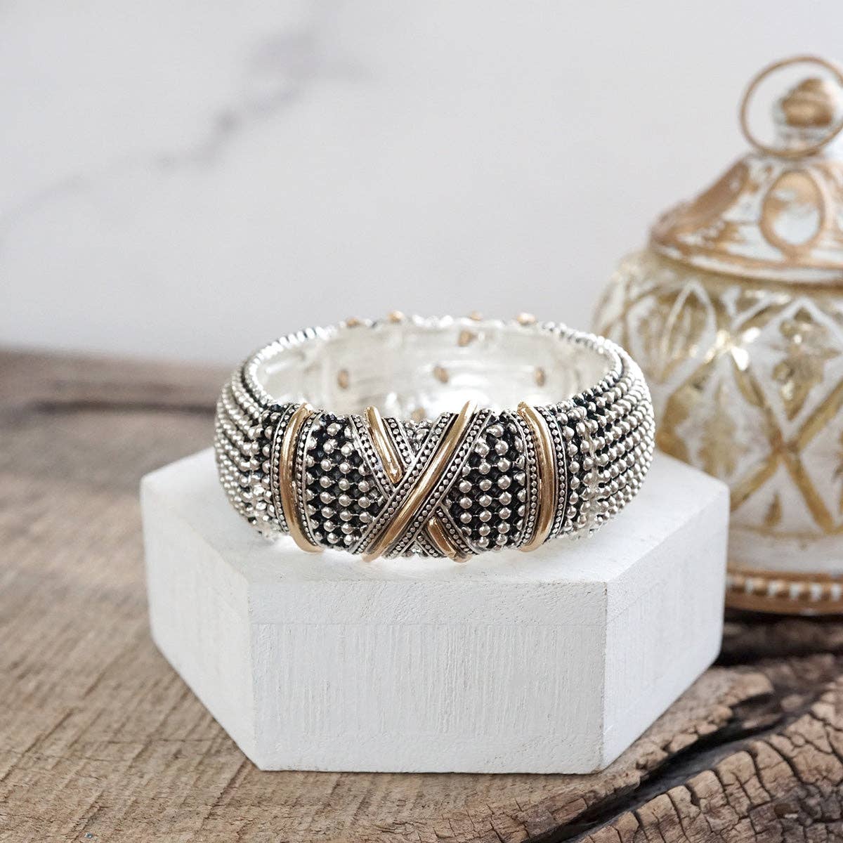 DETAILS • Stretchy wide bangle design • 1" wide with caviar detailed texture • Available in 6 distinct styles: * Twist Detail * Twist - Two Tone * X Detail * X Detail - Two Tone * Chain Detail * Filigree Detail • Classic worn silver tone finish • Boho classic vibe STYLE NOTES Statement • Textured • Layer-Ready