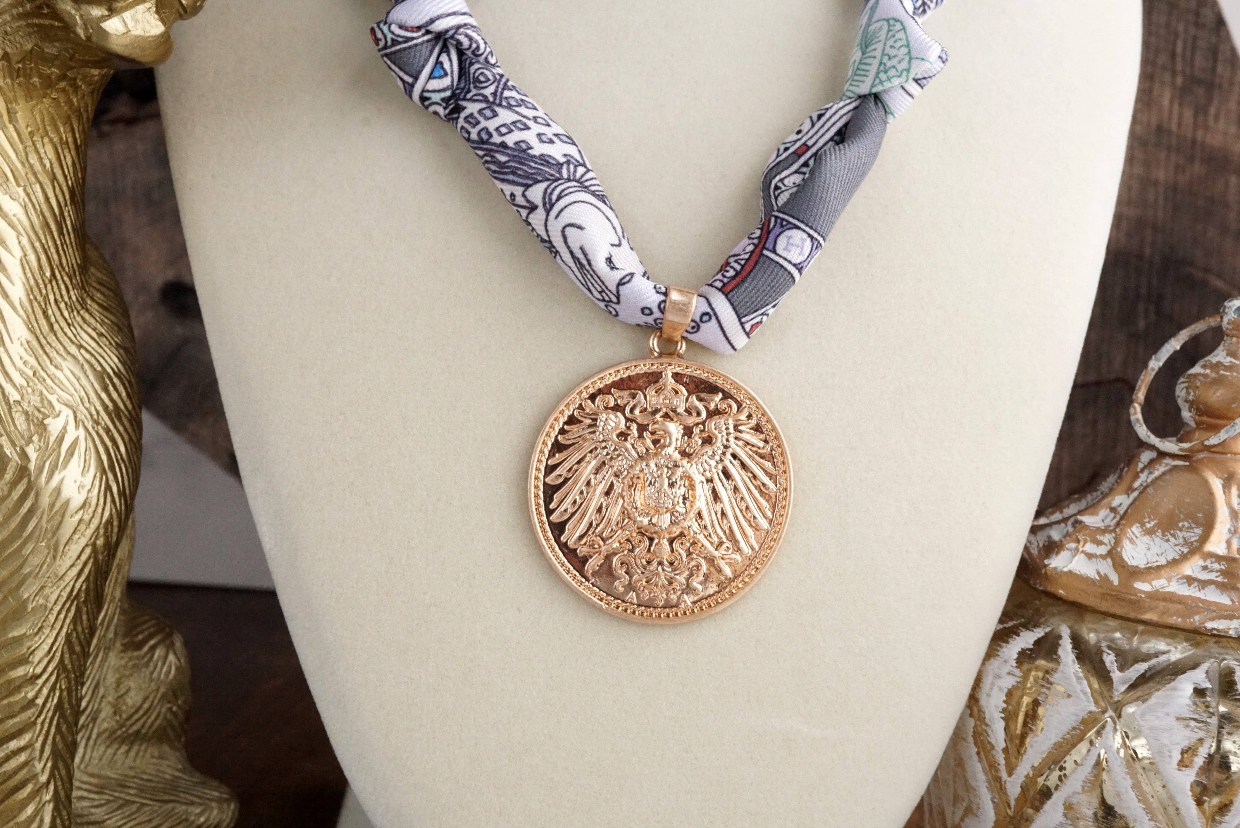 Eagle’s Emblem – Golden Coin Necklace with Gray Scarf Tie Soft woven gray fabric meets a gleaming golden coin pendant etched with an eagle—a symbol of strength and freedom. Designed with an artful scarf tie, this necklace layers texture and meaning in one piece. A quietly bold accent that feels both timeless and unexpected.