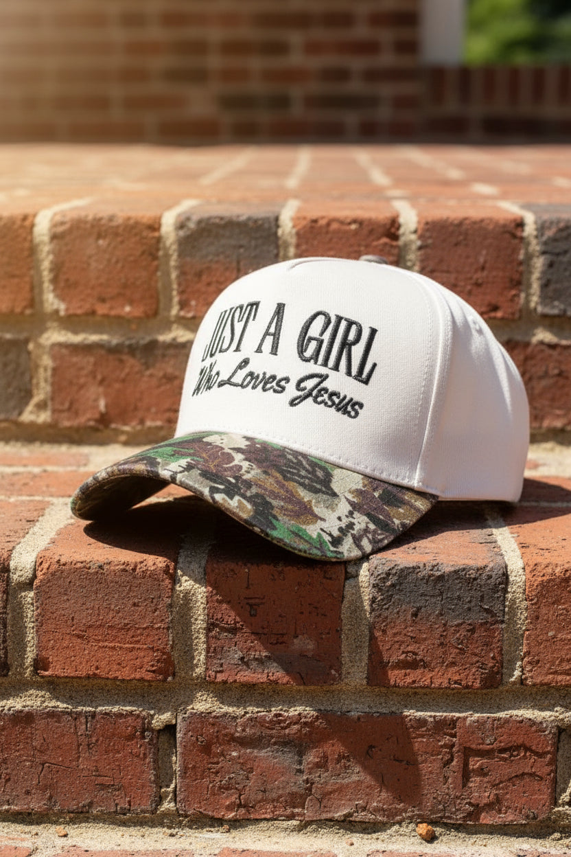 Wear your faith with confidence and a little bit of attitude! Our Just a Girl Ball Cap features the embroidered message “Just a Girl Who Loves Jesus” in a bold script that says it all. Designed with a fun patterned bill — choose camo for a sporty, outdoorsy look or leopard for a fierce and fashionable edge.