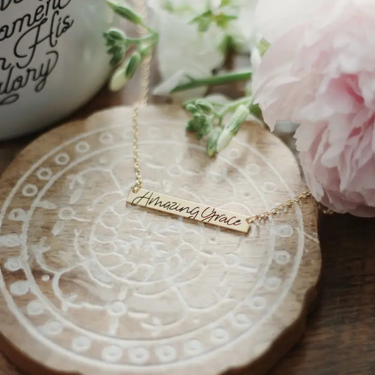 Elevate your style and faith with our exquisite Amazing Grace gold bar necklace, a beautiful symbol of the everlasting grace of God.