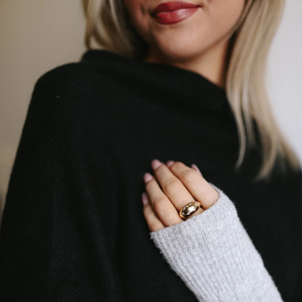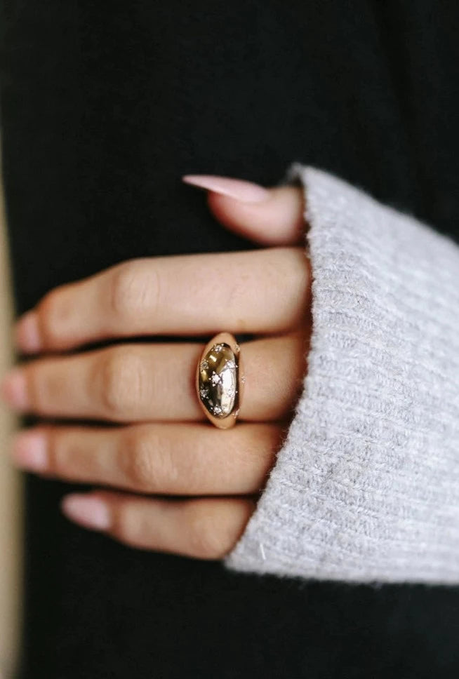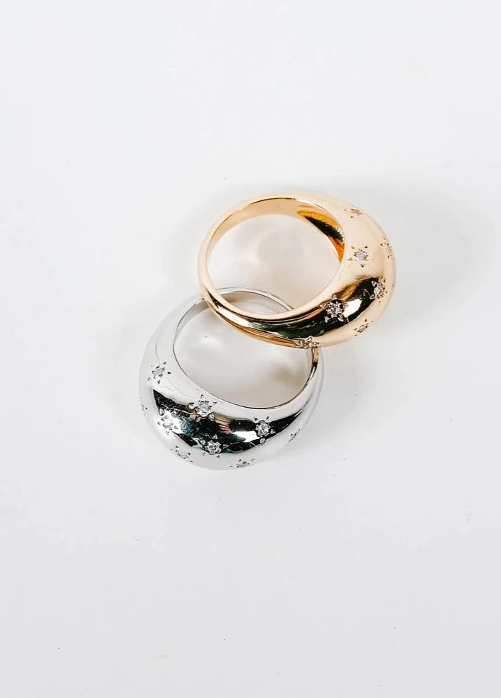 The Dome Sparkle Burst Statement Ring is a trendy new classic ring that's perfect for a statement ring to stack or wear alone! This ring features a simple but elegant dome design with pops of sparkle starbursts in both gold or silver. Fits a size 6 - 7 finger.