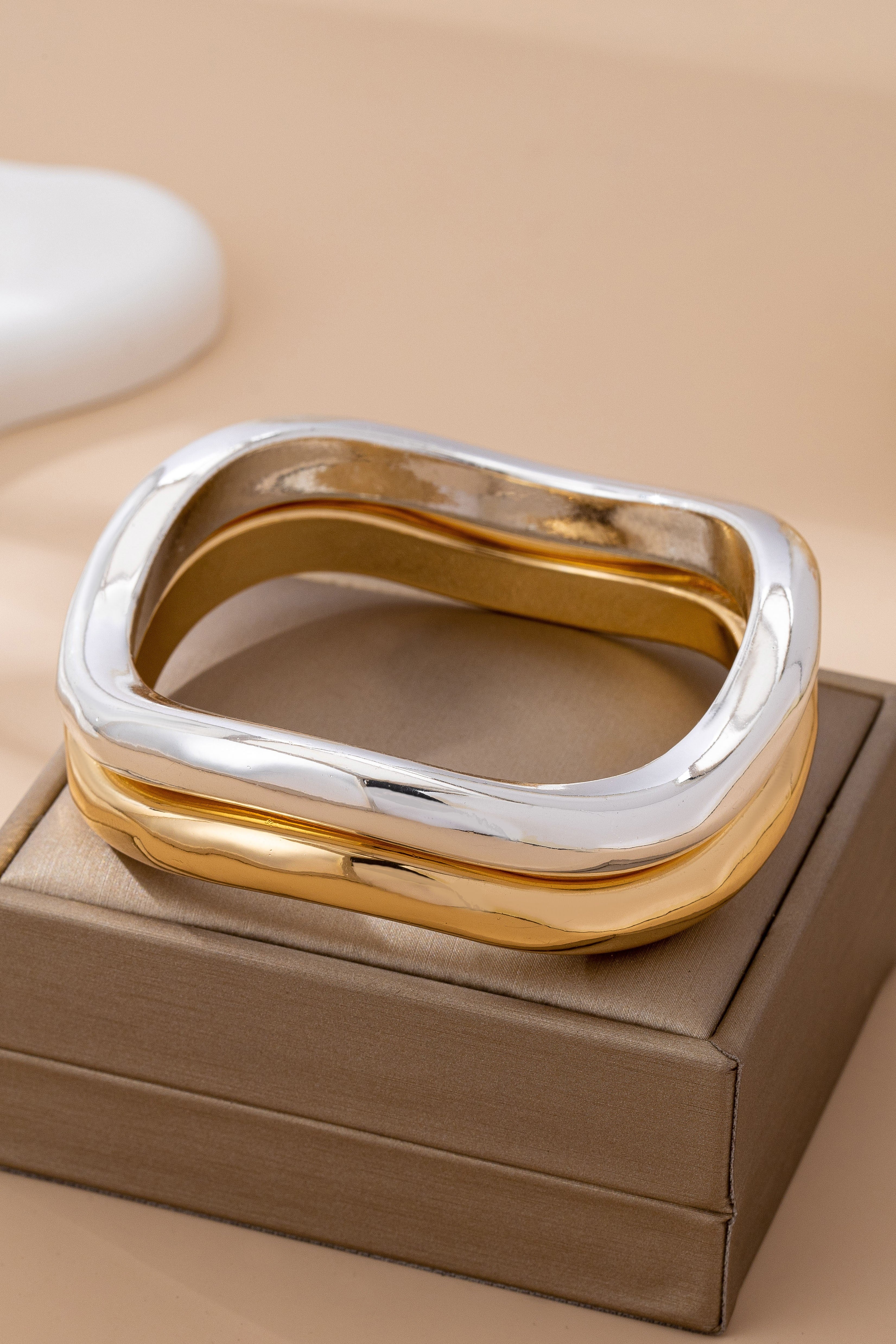 Elevate your accessory game with this dynamic gold and silver bracelet set that transitions seamlessly from solo statement to layered perfection. Designed for comfort, the featherlight construction and smooth hinged slip-on clasp keep you secure through every move.