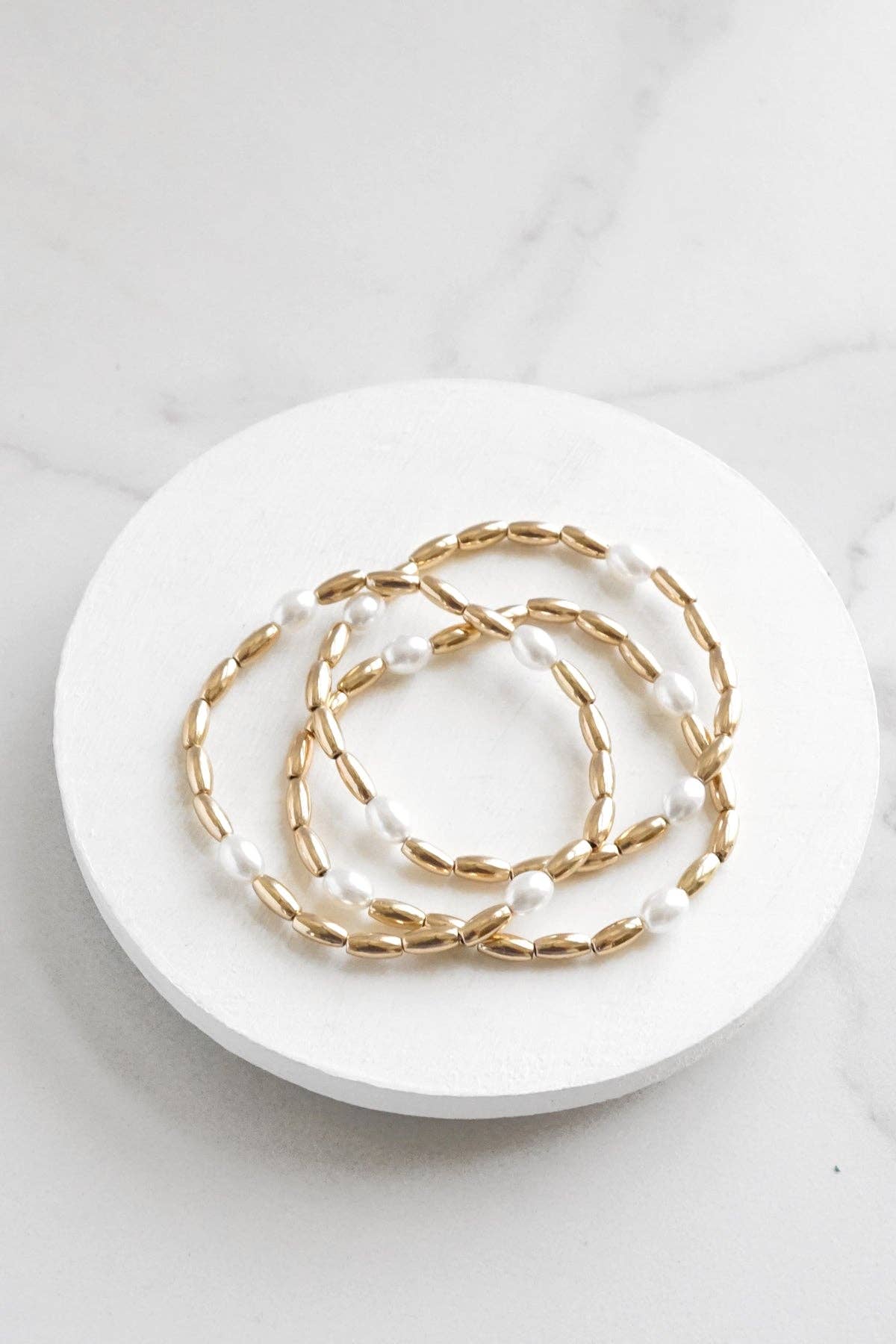 Stack your wrist game with this golden trio of beaded bracelets that totally deliver. Three stretchy pieces loaded with shimmering pearlized rice beads in warm gold tone—mix, match, and layer them however you vibe.