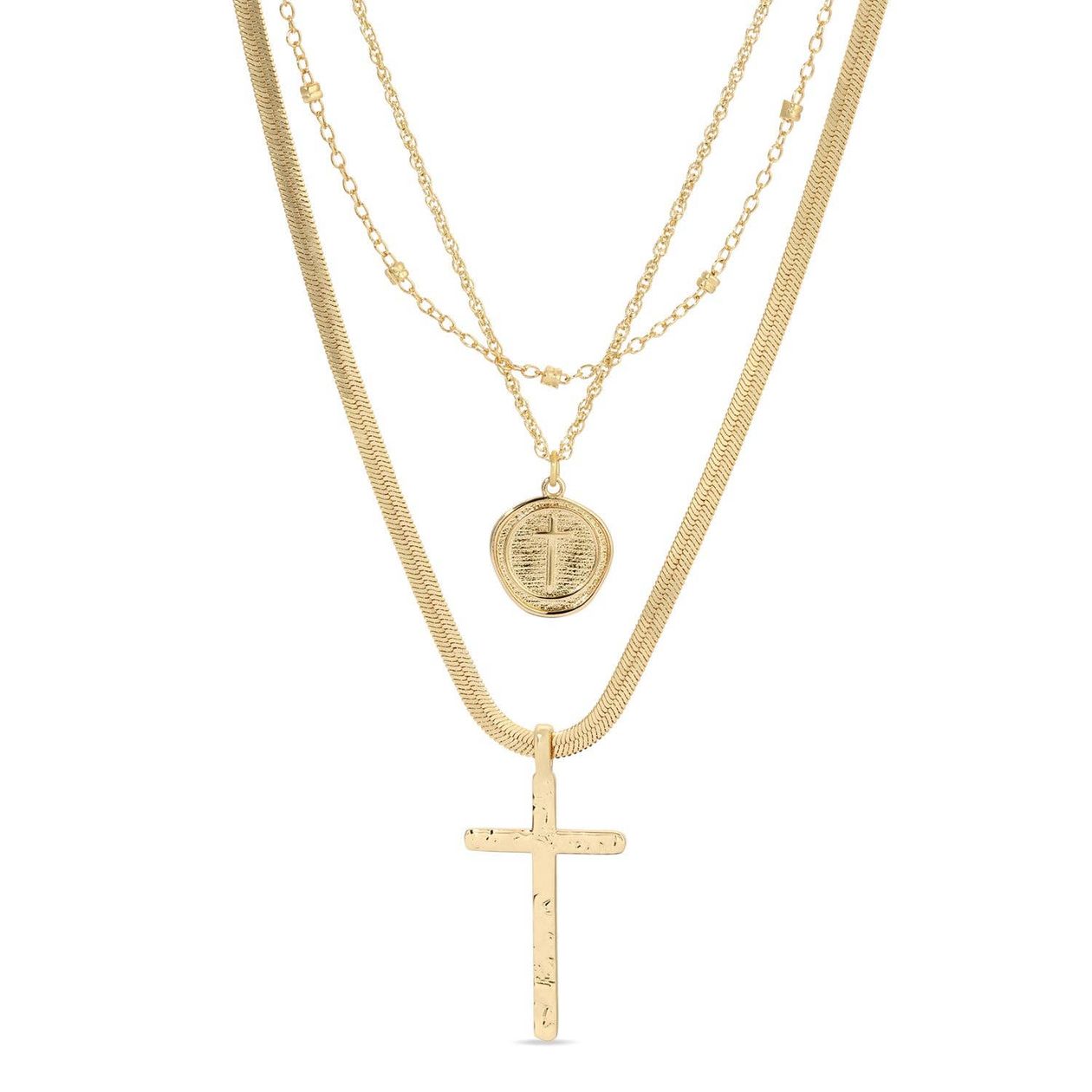 This necklace features three layers: a chain with ball accents, a round cross pendant with texture, and a gilded cross on a herringbone chain. 15.5" + 16.5" + 18" Layered Necklace 18k Gold Plated Brass Base