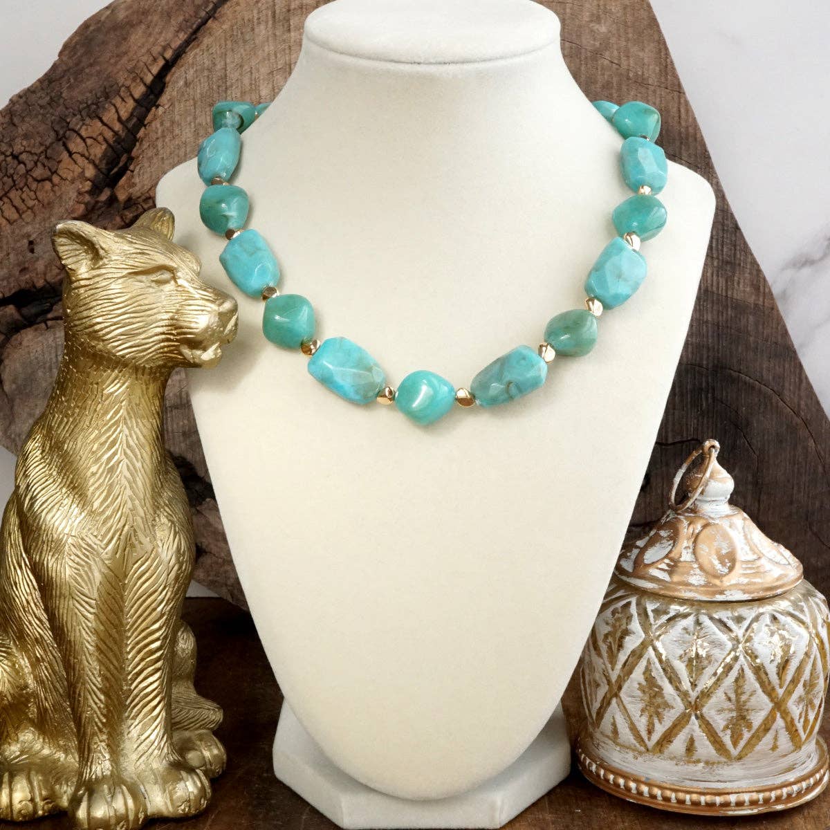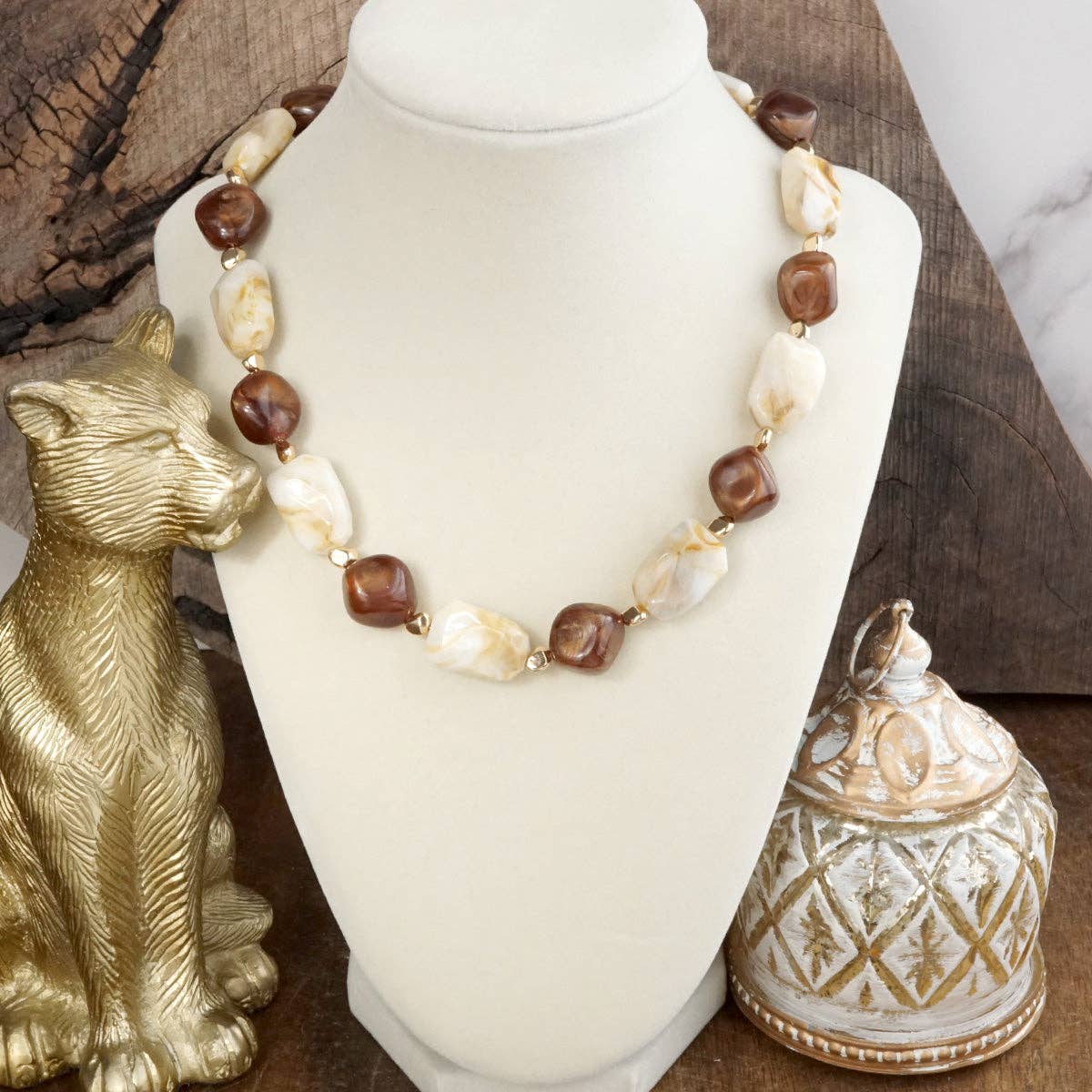 Sunstone Muse – Short Bold Beaded Statement Necklace Radiant energy meets artistic flair in this playful yet grounded statement piece. Chunky asymmetric acrylic beads in mixed sizes flow effortlessly with shimmering gold tone nugget spacers, while a hidden chain lets your beads steal the spotlight.