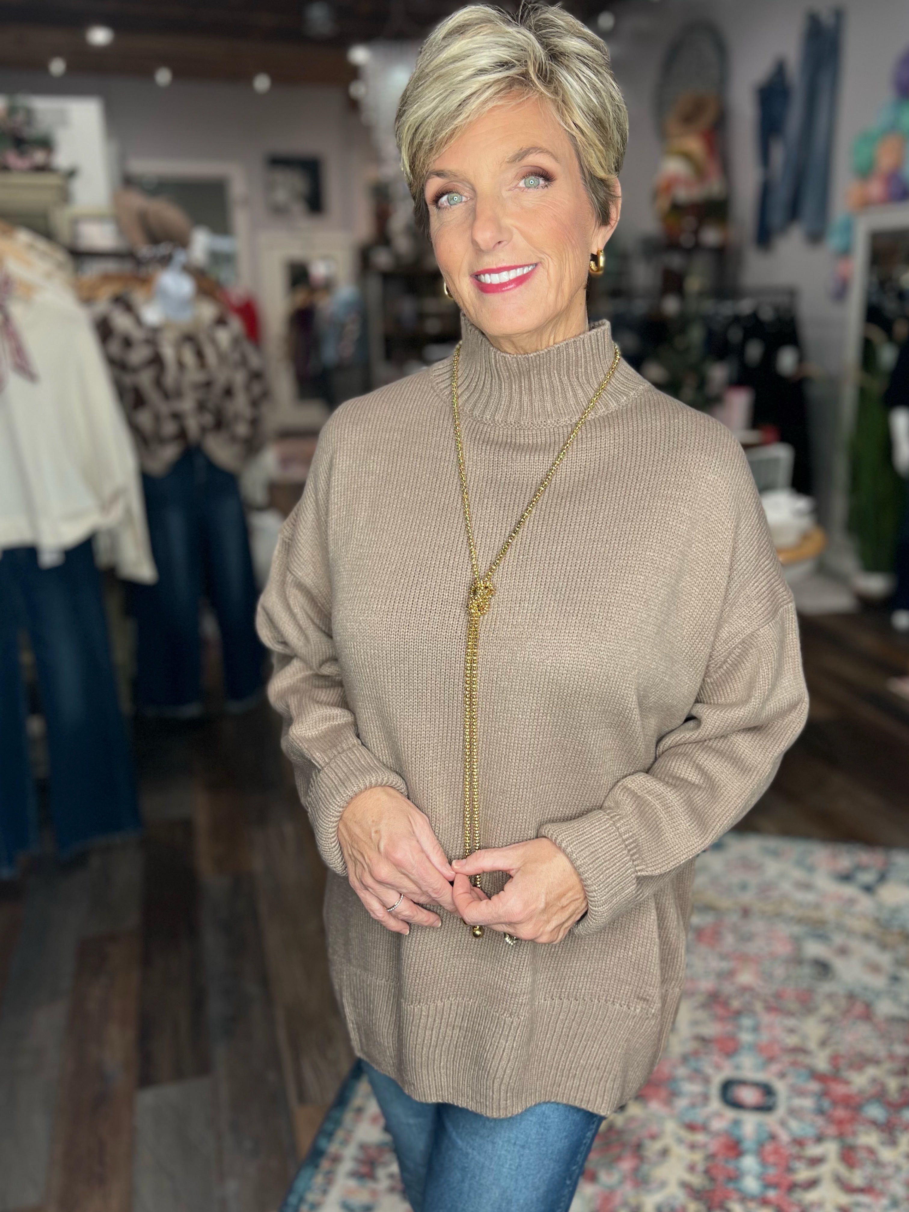 Cozy, chic, and effortlessly versatile—our Oversized Mock Neck Sweater is the sweater you’ll want on repeat this season. Designed in a warm mocha hue, it features a relaxed fit, drop shoulders, and a ribbed mock neckline for that elevated yet laid-back vibe. The ribbed hem and cuffs add subtle structure, while the oversized silhouette keeps it perfectly comfy.