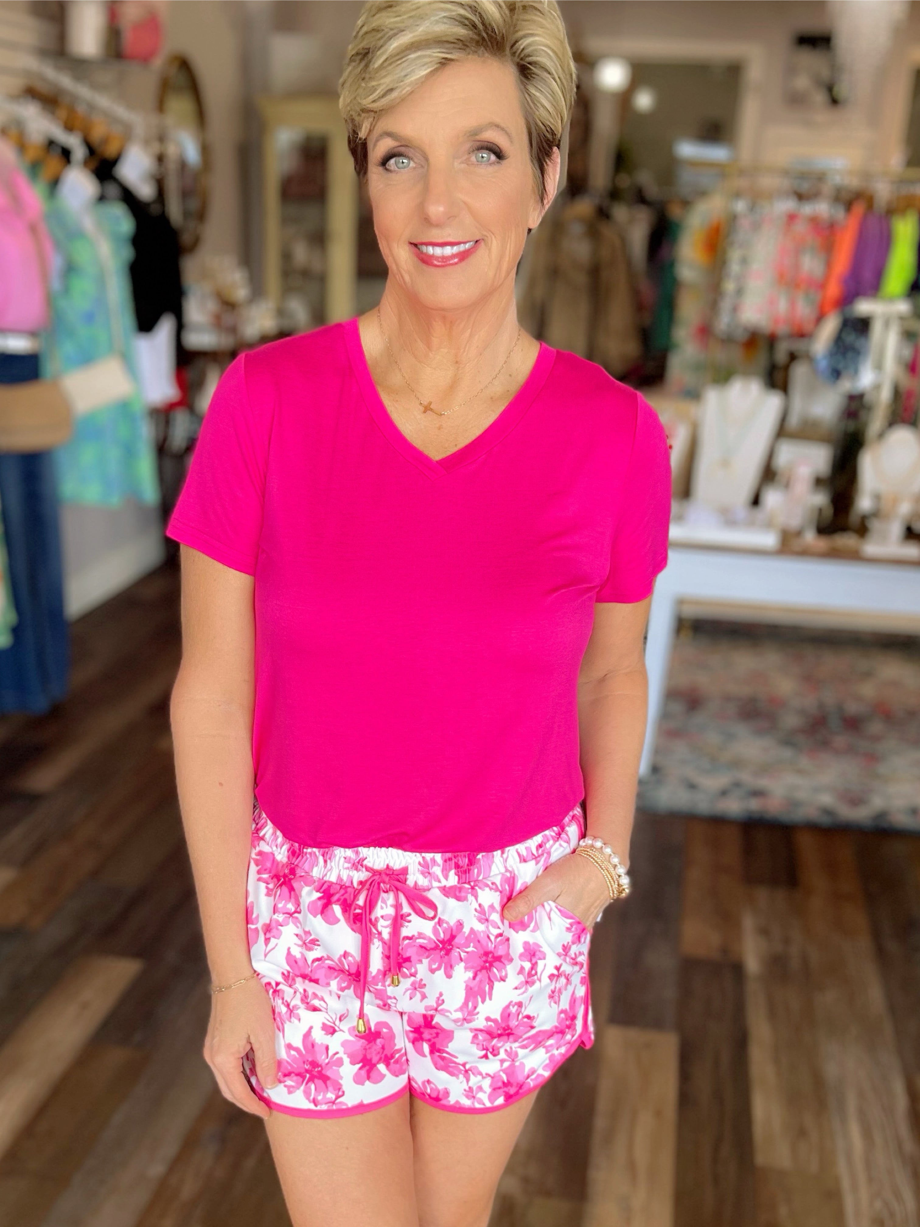 We know we're always on the lookout for a good, comfy basic! This basic tee is definitely one of those pieces! It's comfy and a perfect fit that makes it so easy to wear and the colors make styling and layering it a breeze! This top features short sleeves, a v-neck, and a rounded hemline.