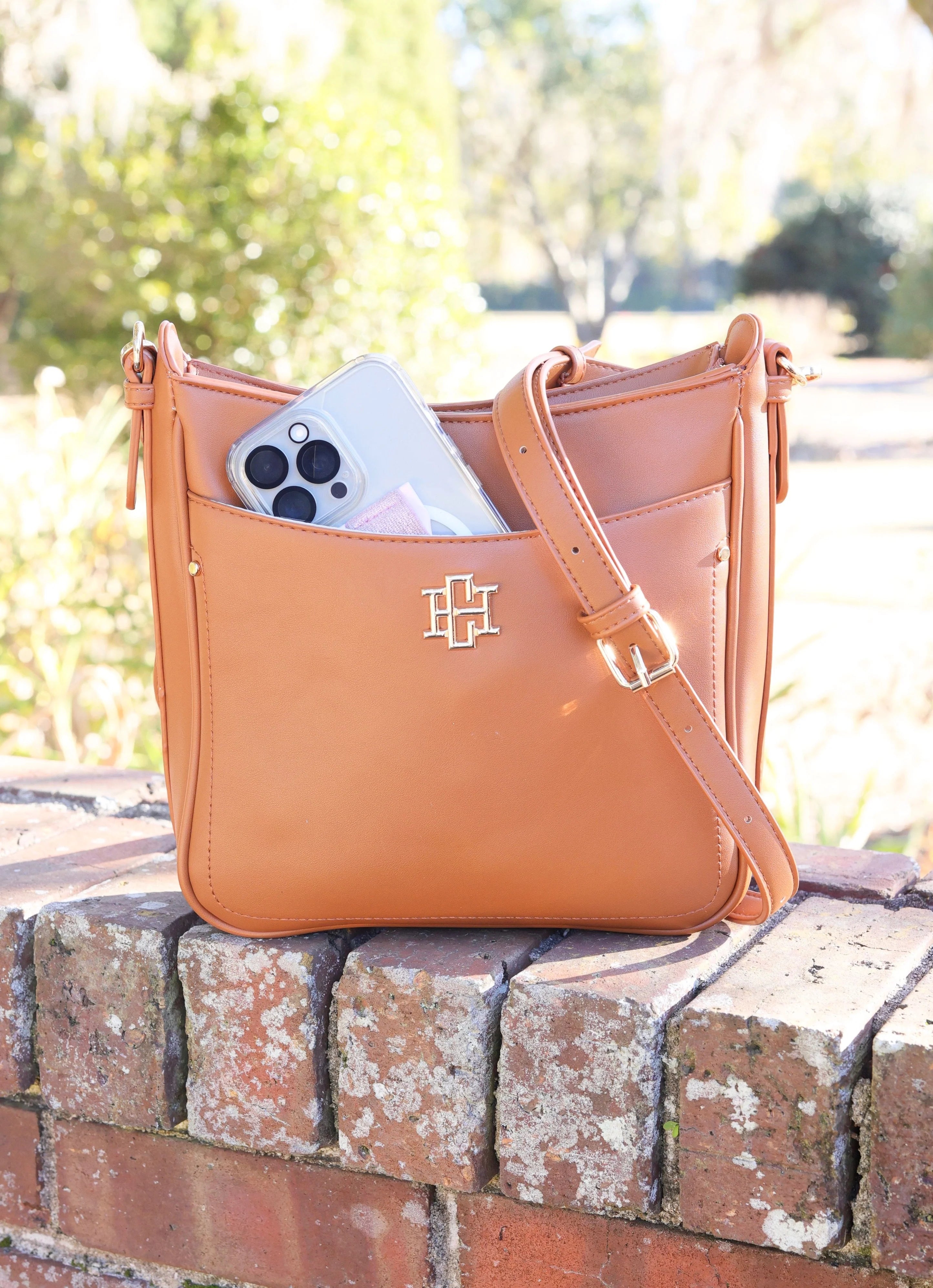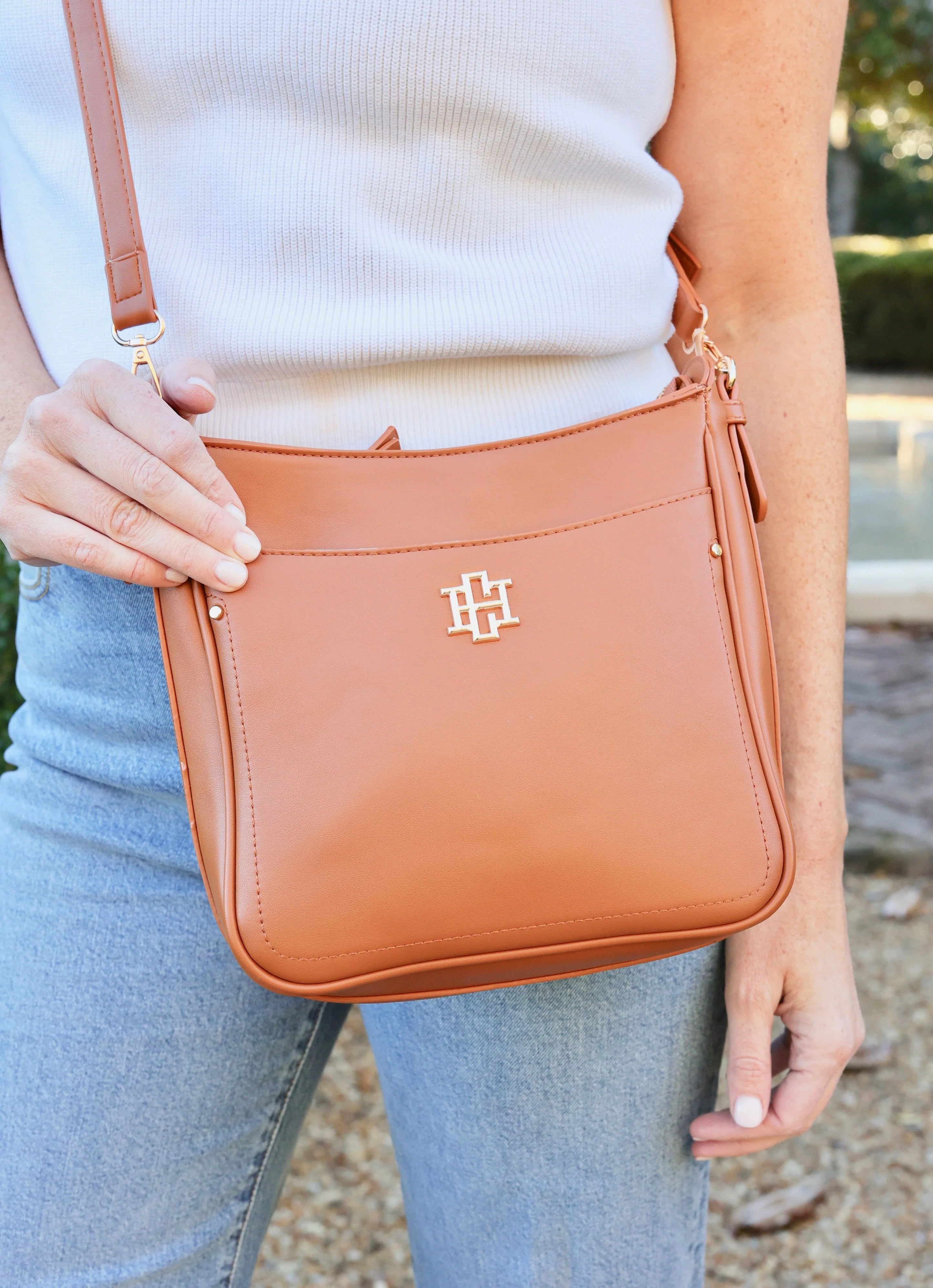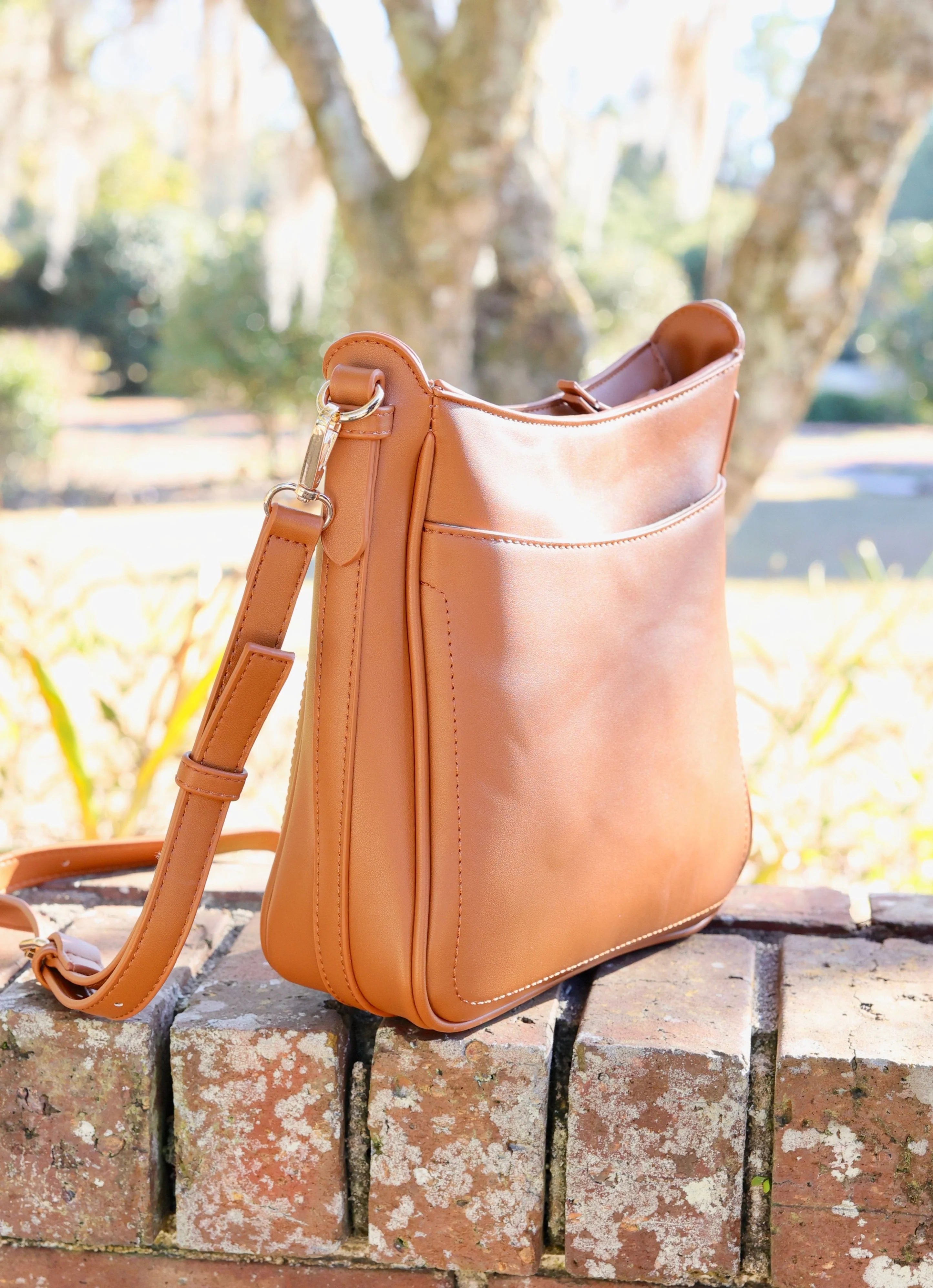 Add a stylish touch to your everyday look with this smooth vegan leather crossbody. It has a classic yet contemporary silhouette designed for the person on the go! There are magnetic front and back pockets to keep a phone, sunglasses, or other important items within reach. This bag has a top zipper closure to keep all your items secure, and the crossbody strap is adjustable for comfortability. It also has an internal zippered pocket and two open pockets to help keep you organized.