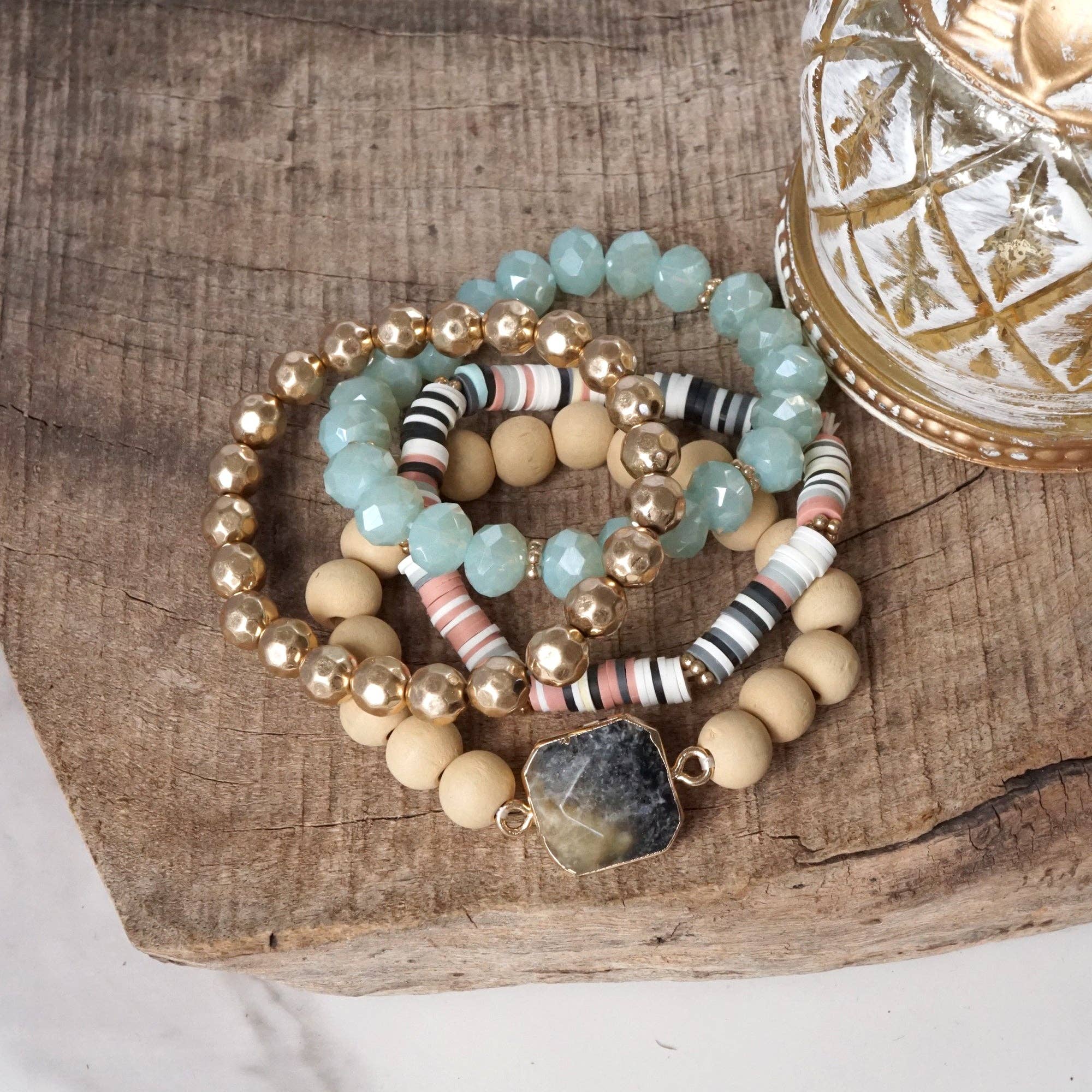 This Boho Beaded Bracelet Set features a beautiful mix of earthy, Aqua blue and neutral tones with a unique square, faceted Labradorite semi-precious center stone. Designed for easy layering, it includes four bracelets that combine natural wood, clay, faceted glass, and metal beads.