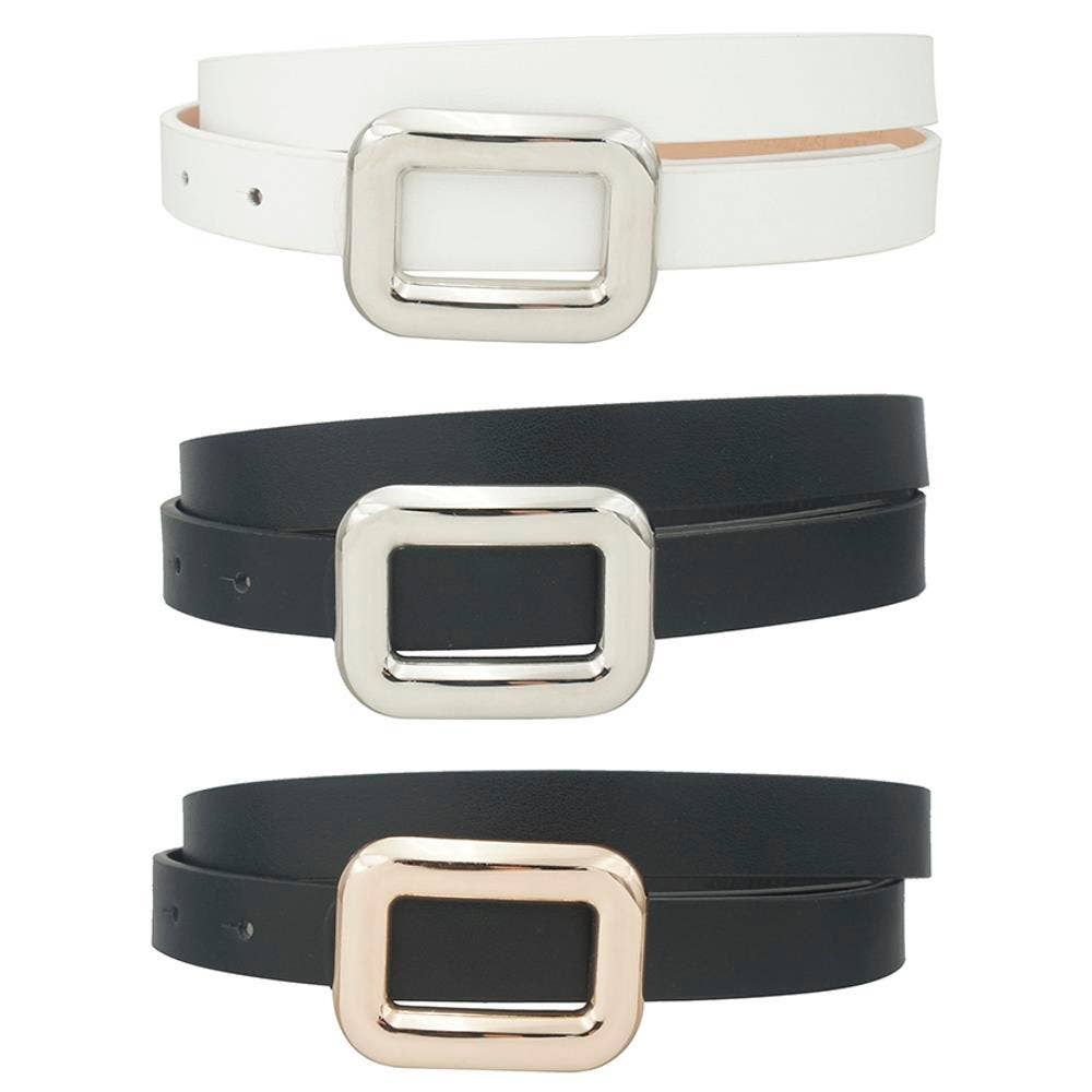 Two black belts - one with a silver buckle, one with a gold buckle and a white belt with a silver buckle.