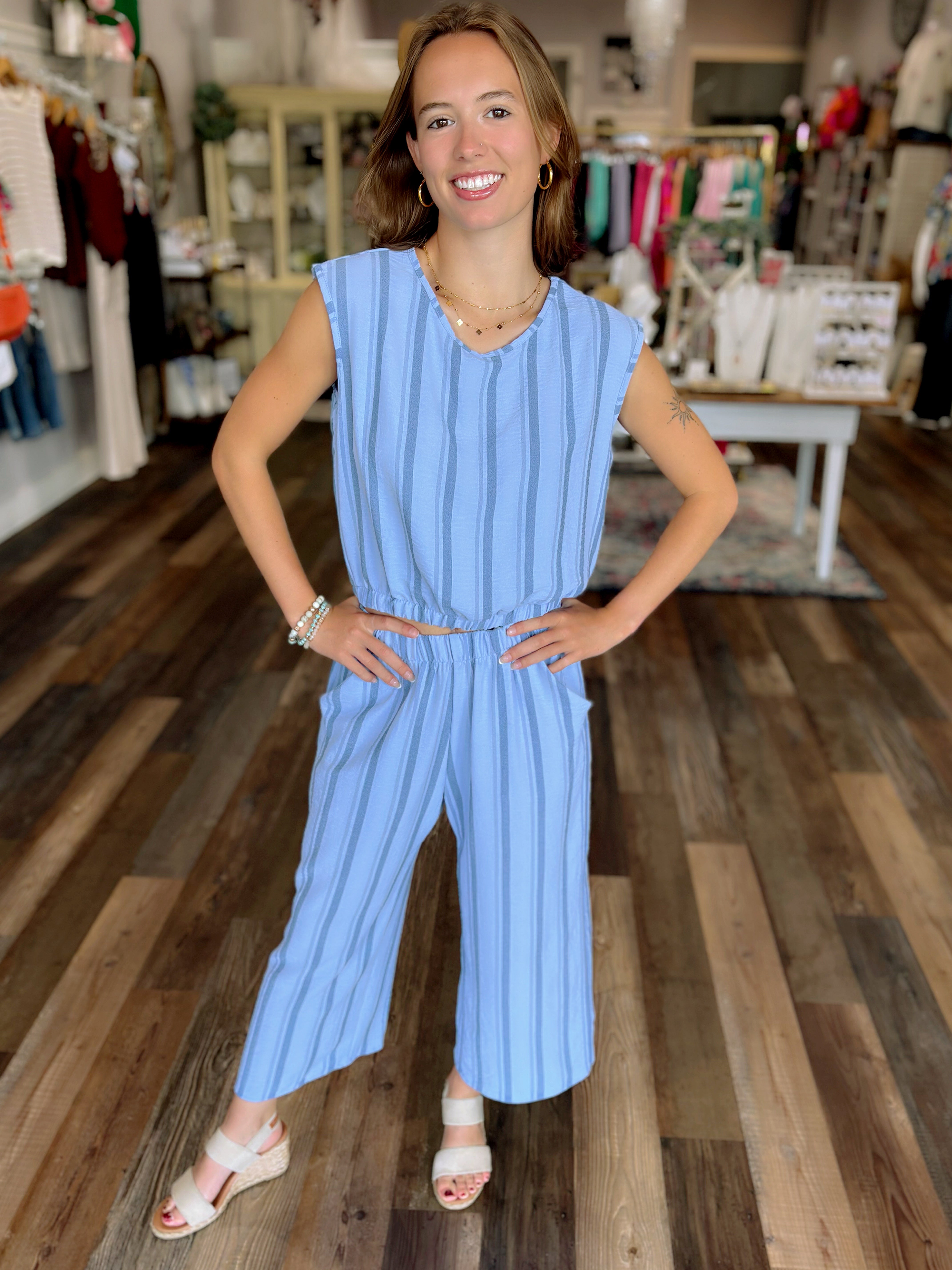 These sets feature an adorable elastic waist and cap sleeve top. Can wear showing the stomach or pulled down to not. This is a top AND pant set. Pants feature an elastic waist with flattering drapey front pockets. Perfect for any occasion, this stylish set is SO soft, some stretch and cozy you will want to live in it! FABRIC: 77%POLY 19% RAYON 4%SPAN