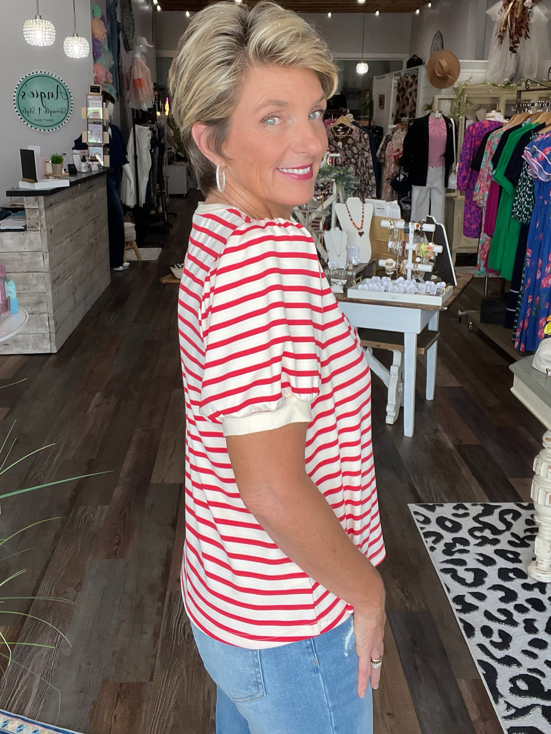 This striped beauty is the perfect everyday top with just enough detail to make it feel special. The timeless stripe keeps it classic, while the short bubble sleeves add a soft, feminine shape that elevates it beyond your basic tee.