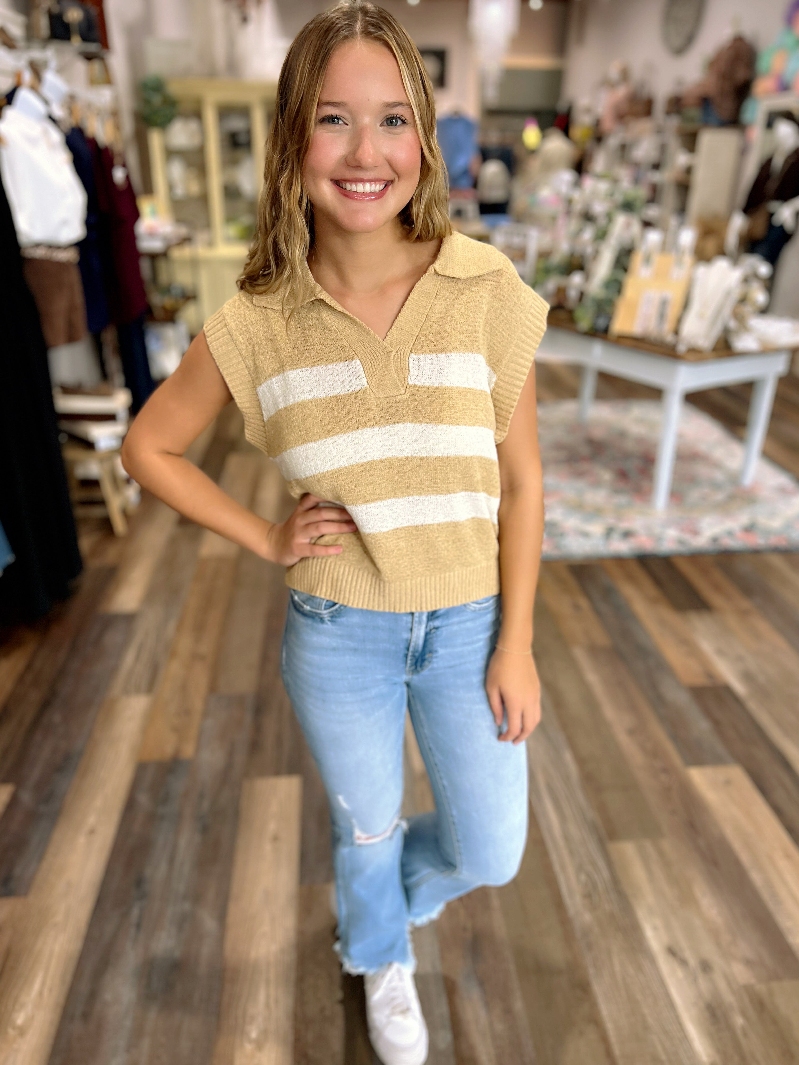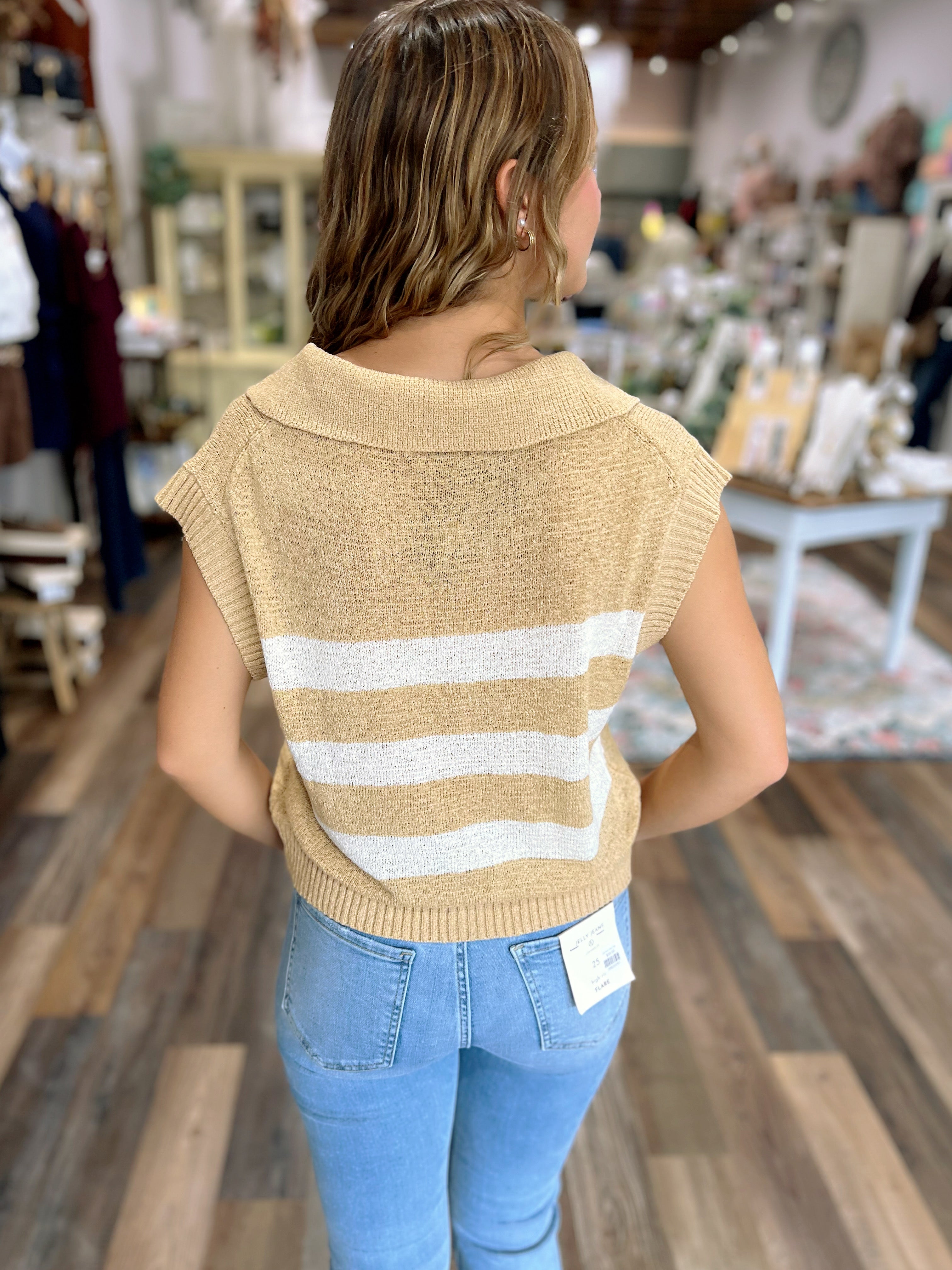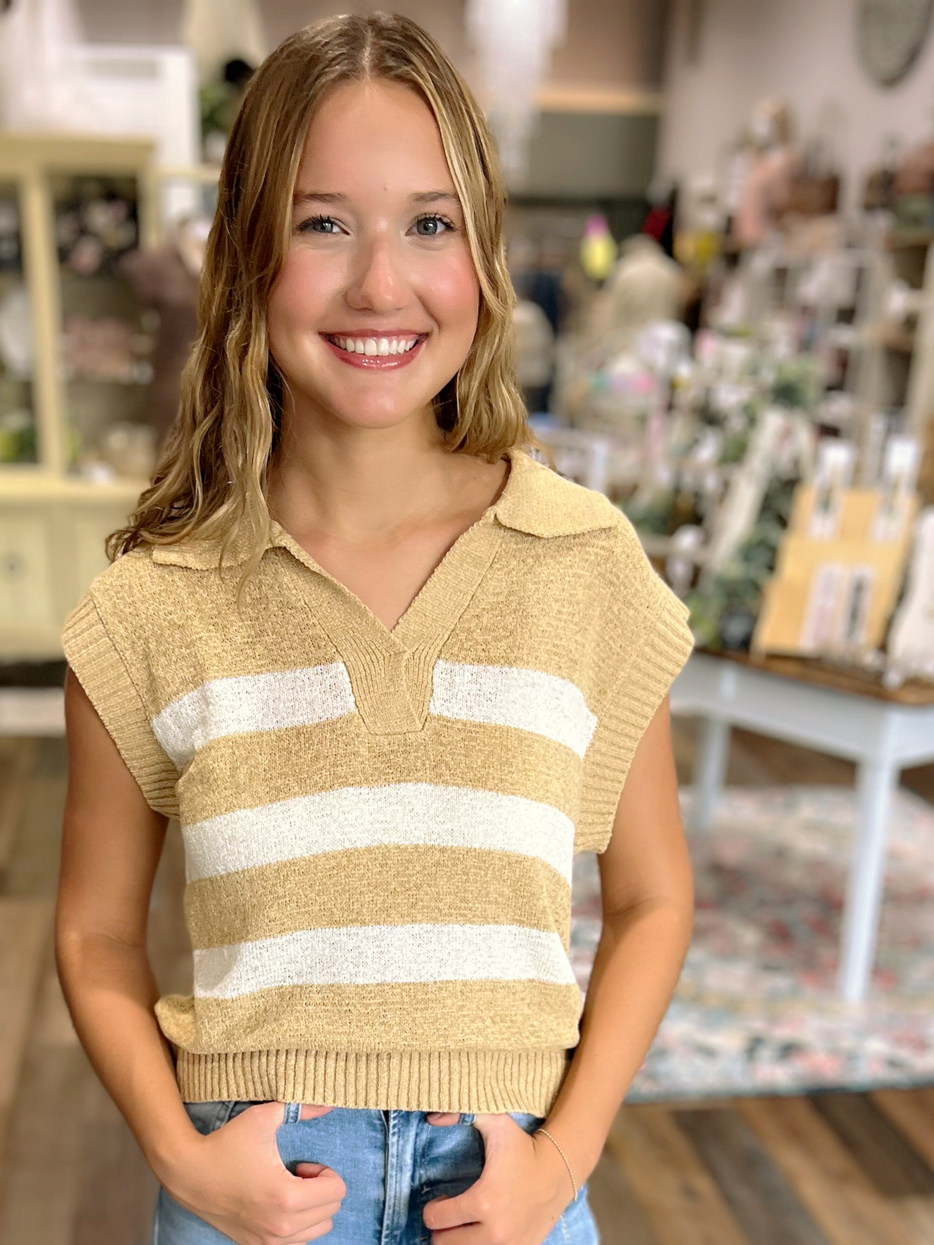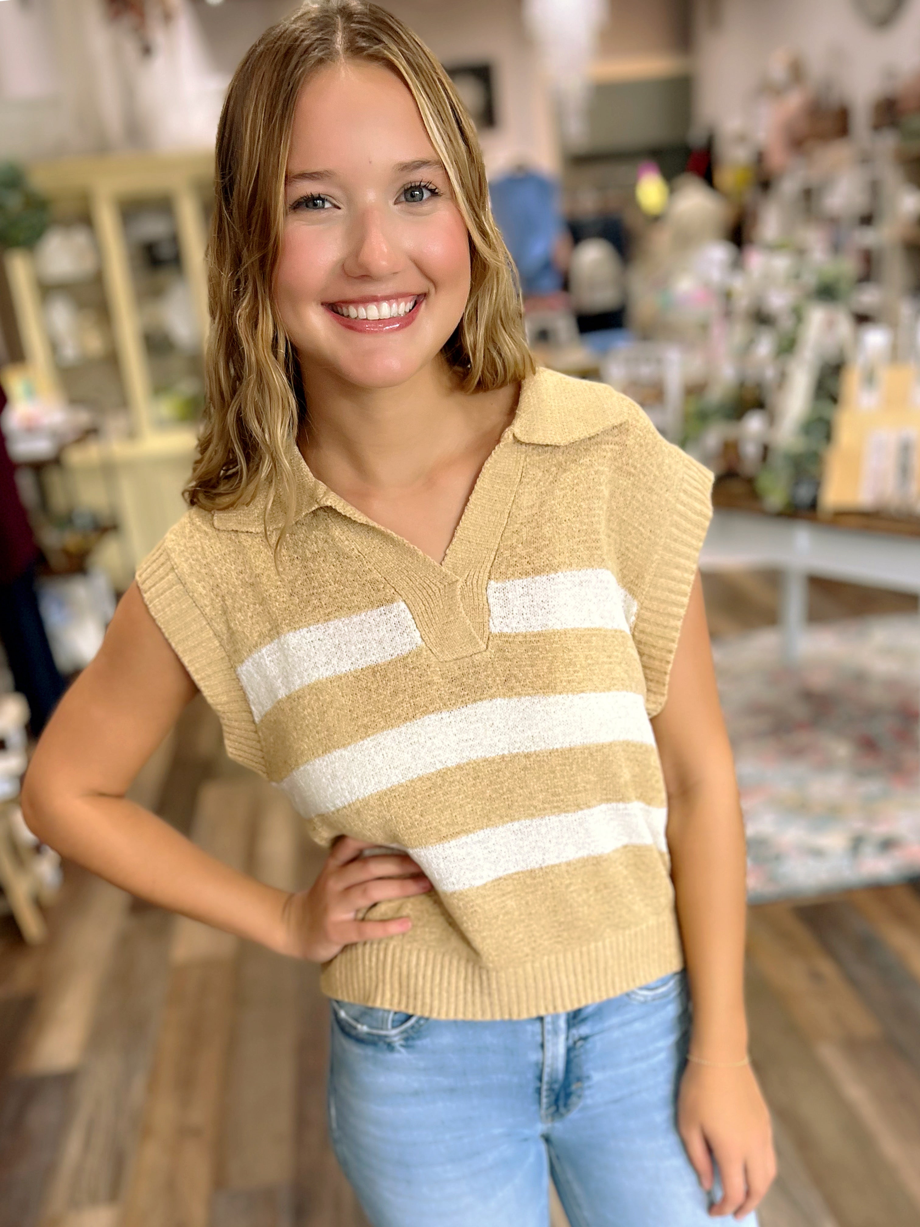 Soft, lightweight knit with a classic polo collar and wide neutral stripes—perfect for layering or wearing solo. Made from a breathable acrylic-nylon blend for year-round style. Very lightweight- best with nude undergarments.