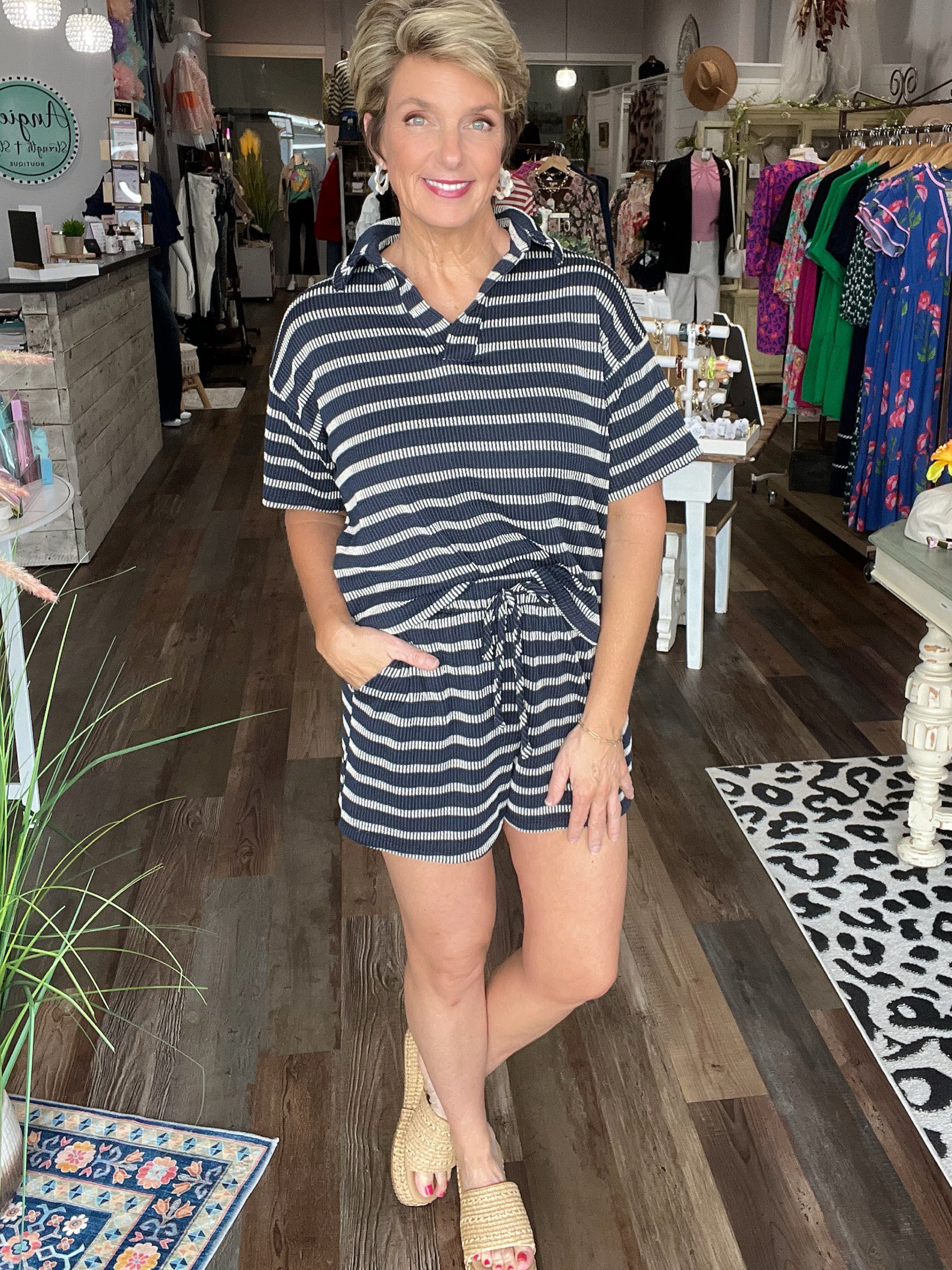 There's nothing like stripes in the sunshine, and this top says it all. A relaxed fit in a textured knit, it has a collared v-neck and short sleeves with drop shoulders. Complete the outfit with the matching shorts and you're ready for a day of shopping, a barbecue or a casual evening at the beach.