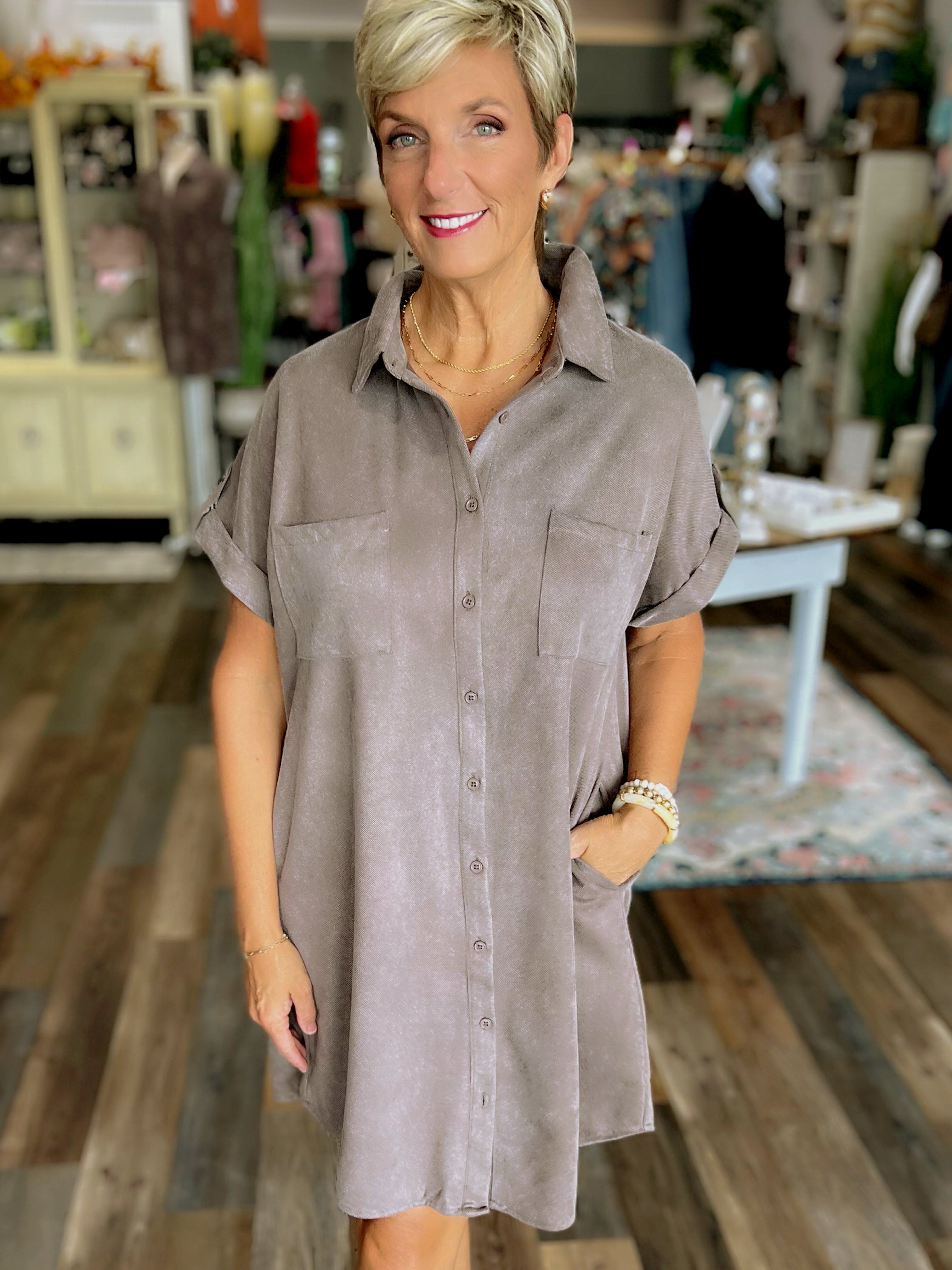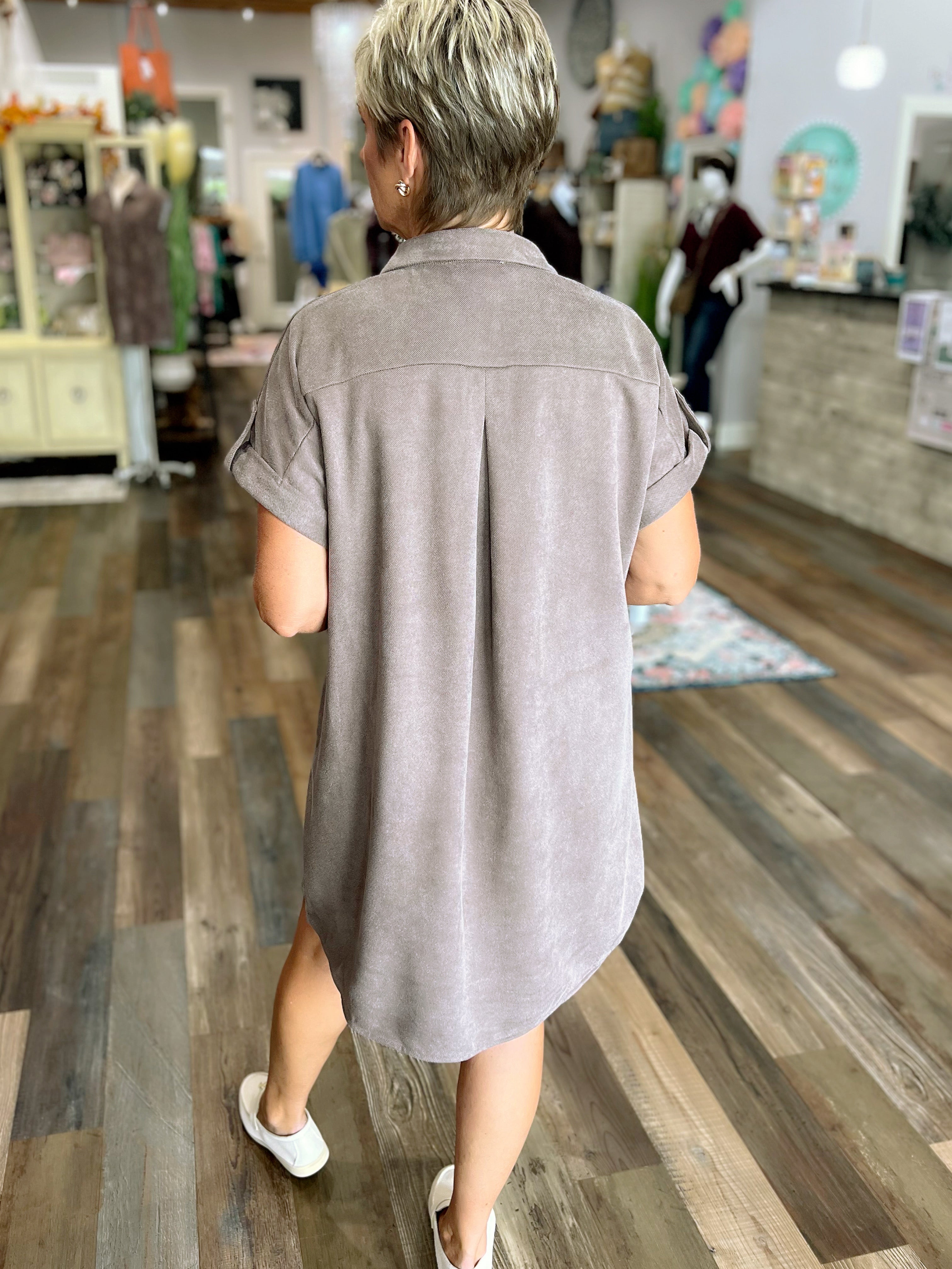 Effortlessly cool with a touch of western charm—our Drop Shoulder Button-Up Faux Suede Shirt Dress is a must-have staple for every season. Designed in a soft faux suede fabric, this dress features a relaxed silhouette with drop shoulders, a collared neckline, chest pockets, and a button-front closure. The versatile design makes it easy to wear on its own or layered as a lightweight jacket.
