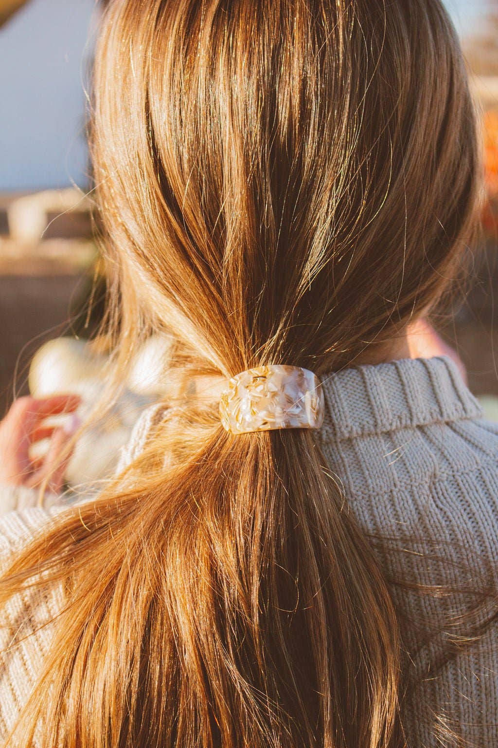 This hair tie will be the best addition to your closet! Made with a brown elastic hair tie and a tan/cream, marbled cuff; It will hold your hair better than your average hair tie, and give it the cutest touch while still feeling so simple.