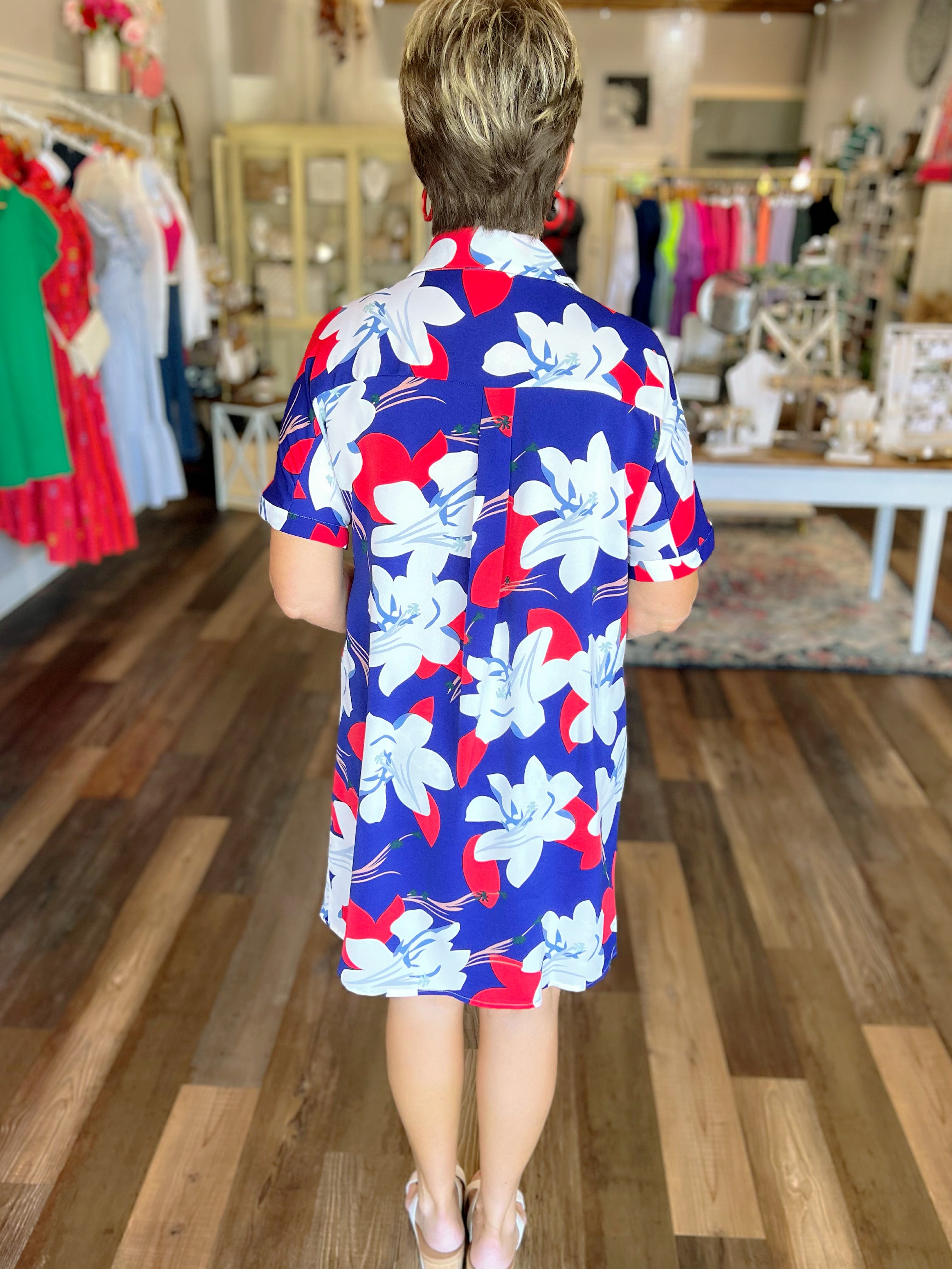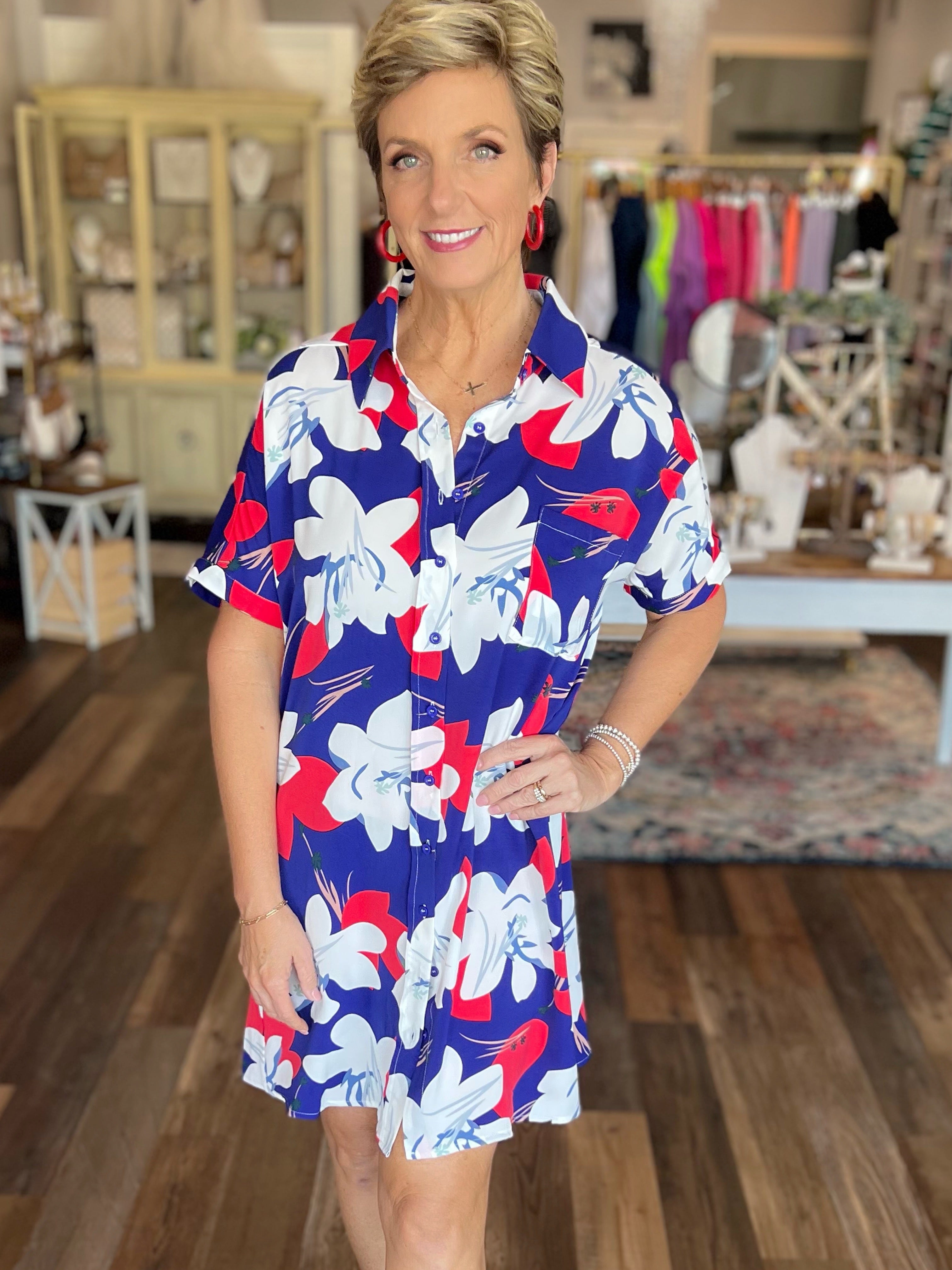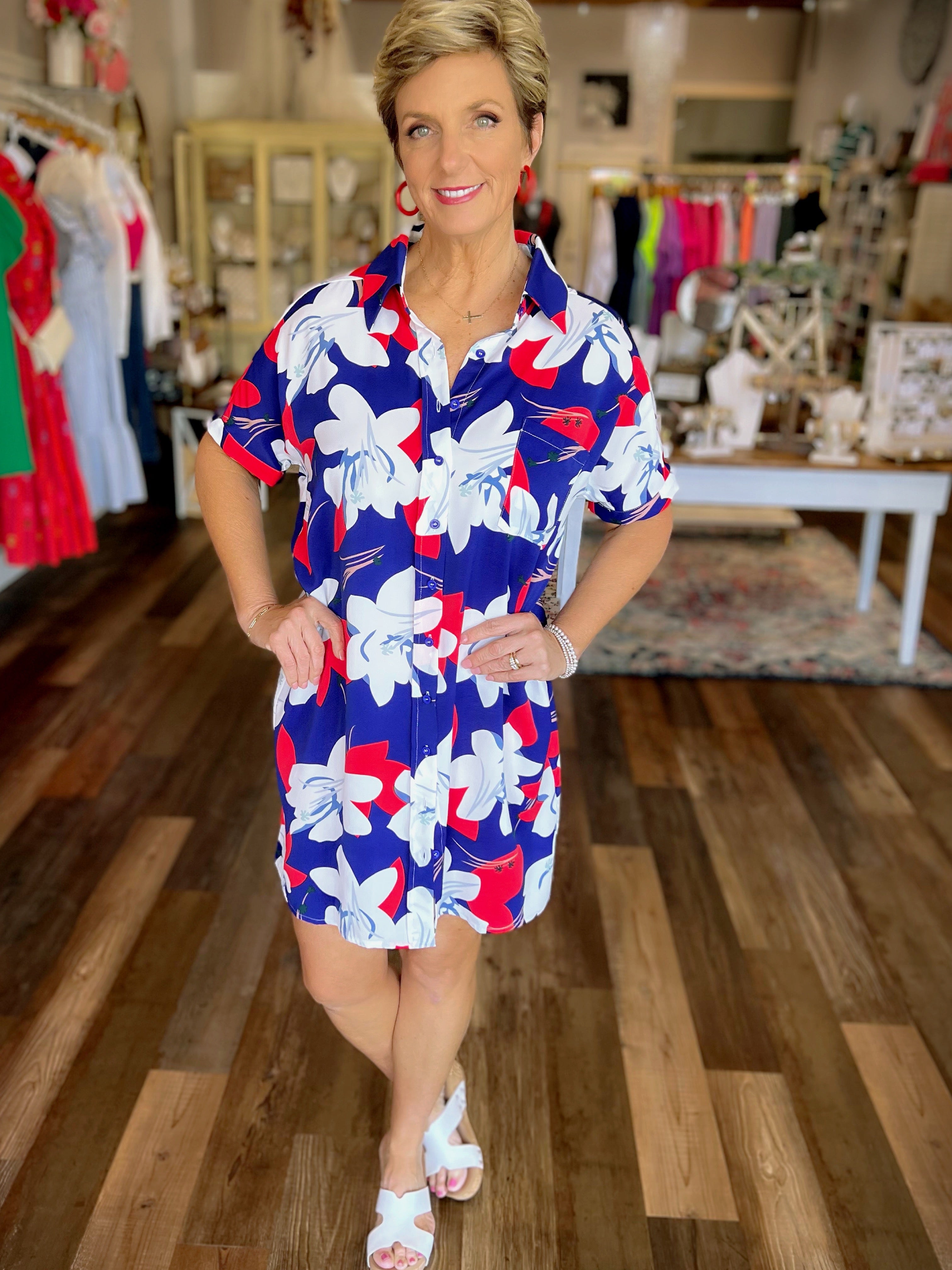 Get ready for some summer fun with this floral dress! Perfect for a day out by the water, a graduation, a fun pool party - this dress can also be worn open as a cardigan or coverup.
