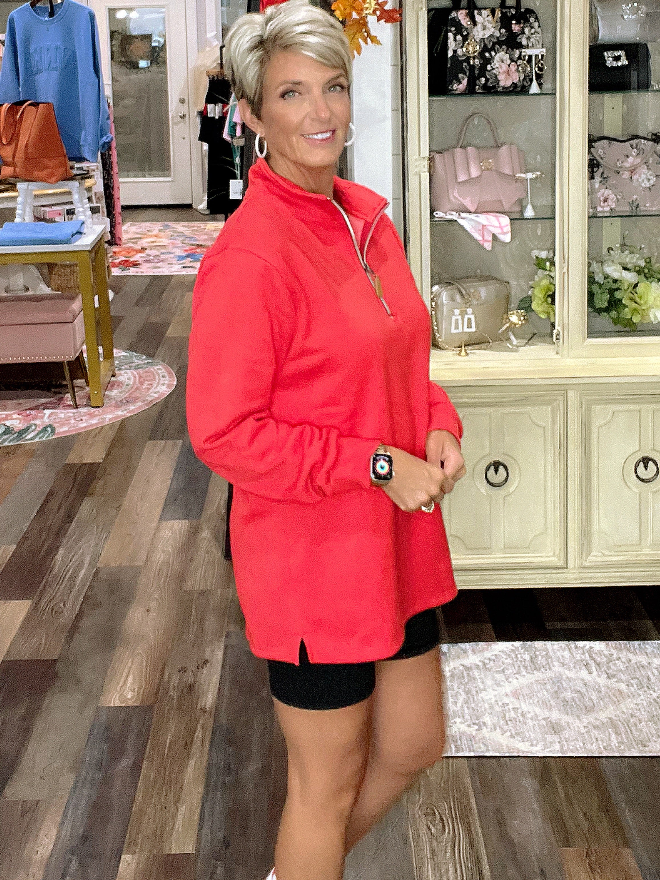 The Miley Quarter Zip Pullover is the perfect comfy and casual piece! You will definitely want to make room in your closet for this one! It features a soft fabric, a foldable collar, side slits, and a quarter zip. It fits slightly oversized. If in-between sizes, size down. Fabric: 65% Polyester, 35% Cotton