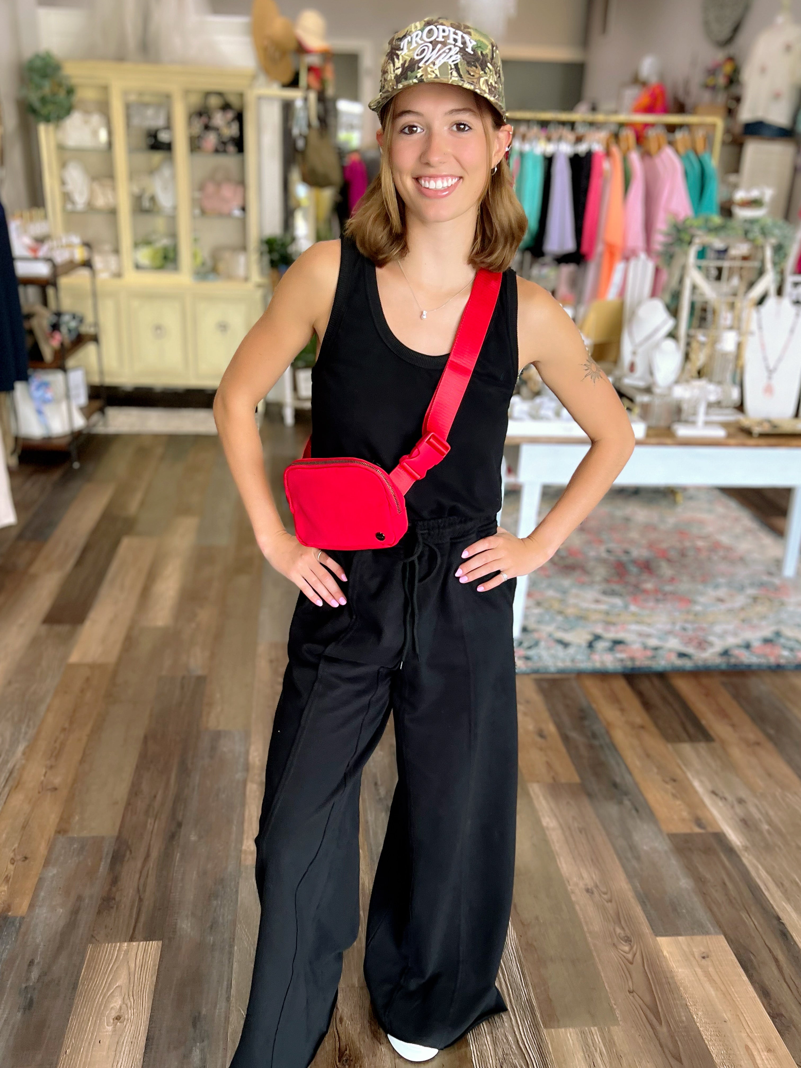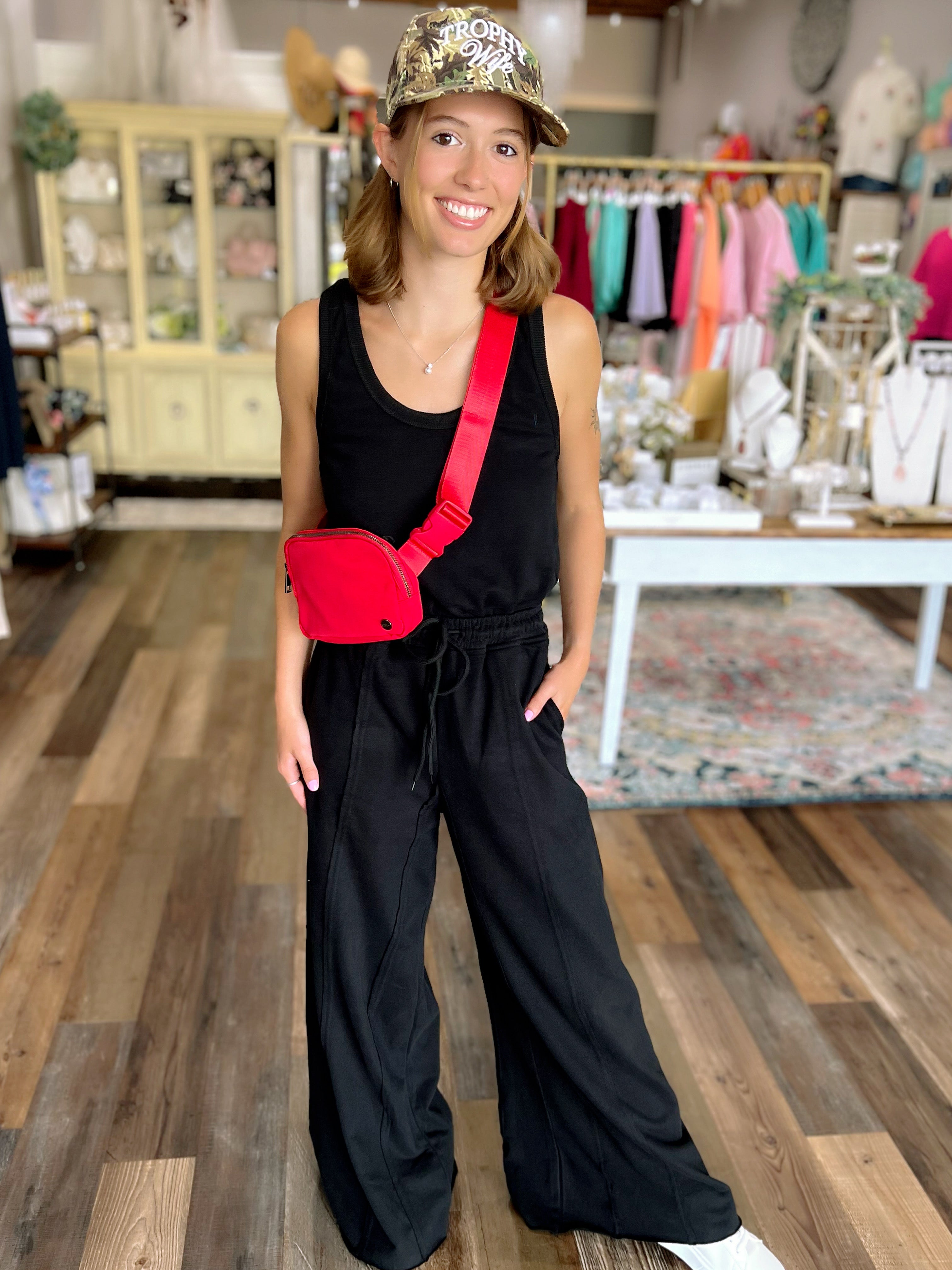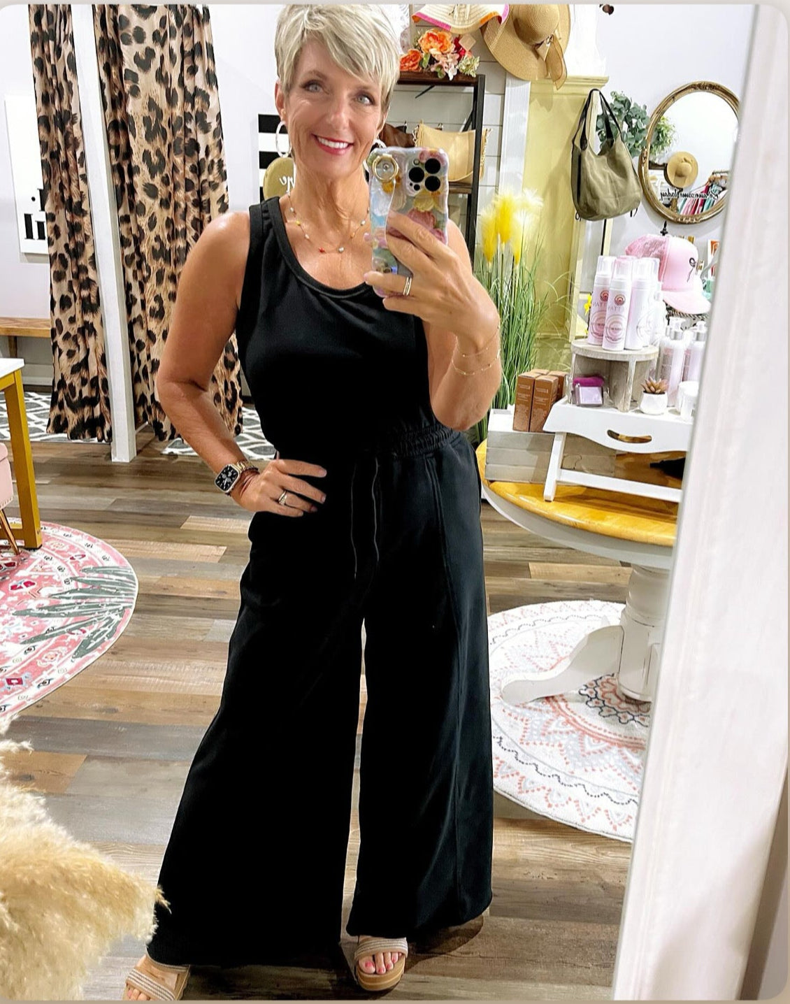 This washed black terry jumper features a soft racerback tank, flattering elastic tie waist, and functional side and back pockets (yes, it has pockets!). With cozy terry contrast on the back and a relaxed wide-leg fit, it's made for movement—perfect for travel, errands, or just living your best comfy life.