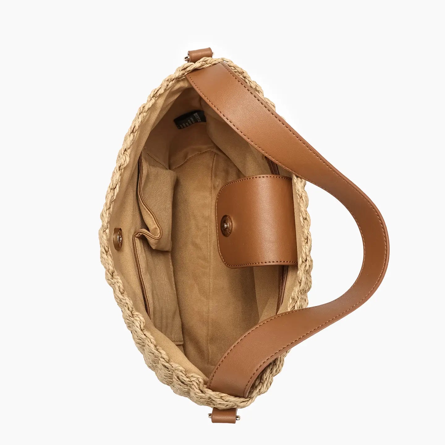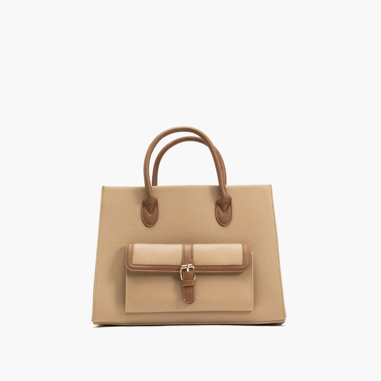 The Veda satchel has a vegan leather body and a smooth polyester lining on the inside. On top of its main storage compartment with a hook closure, the satchel has a magnetic closure front pocket, as well as a zipper-opening inner slide pocket. Two-tone leather work detailing around its adjustable strap, top handle, and front pocket.
