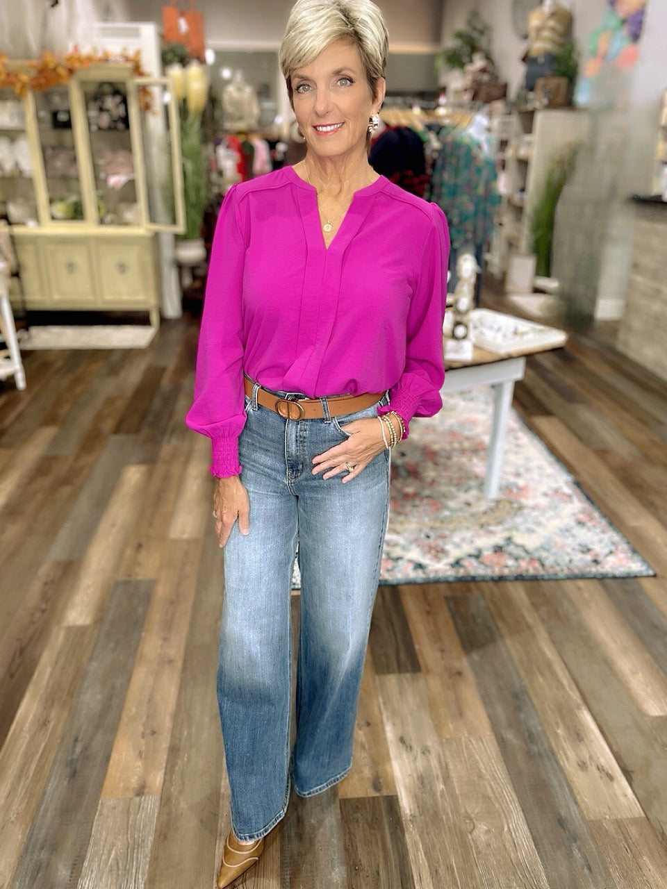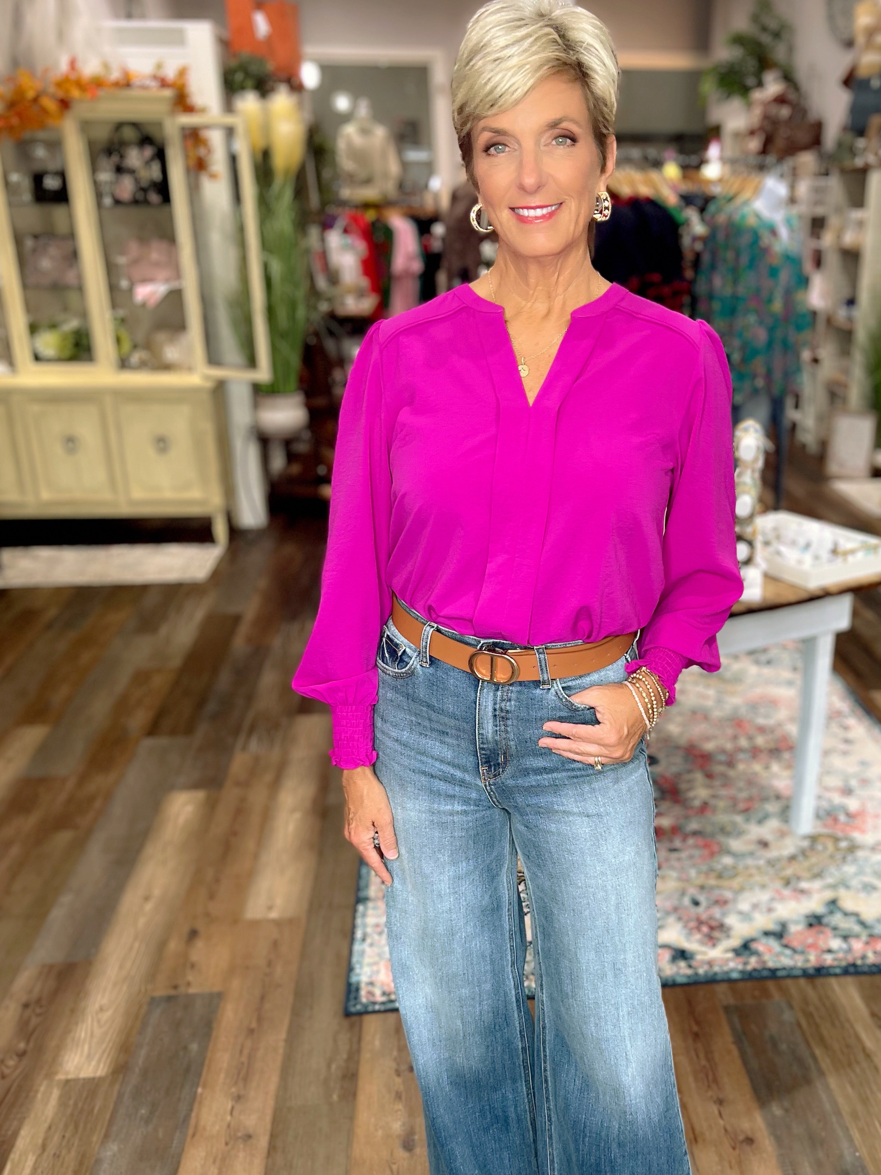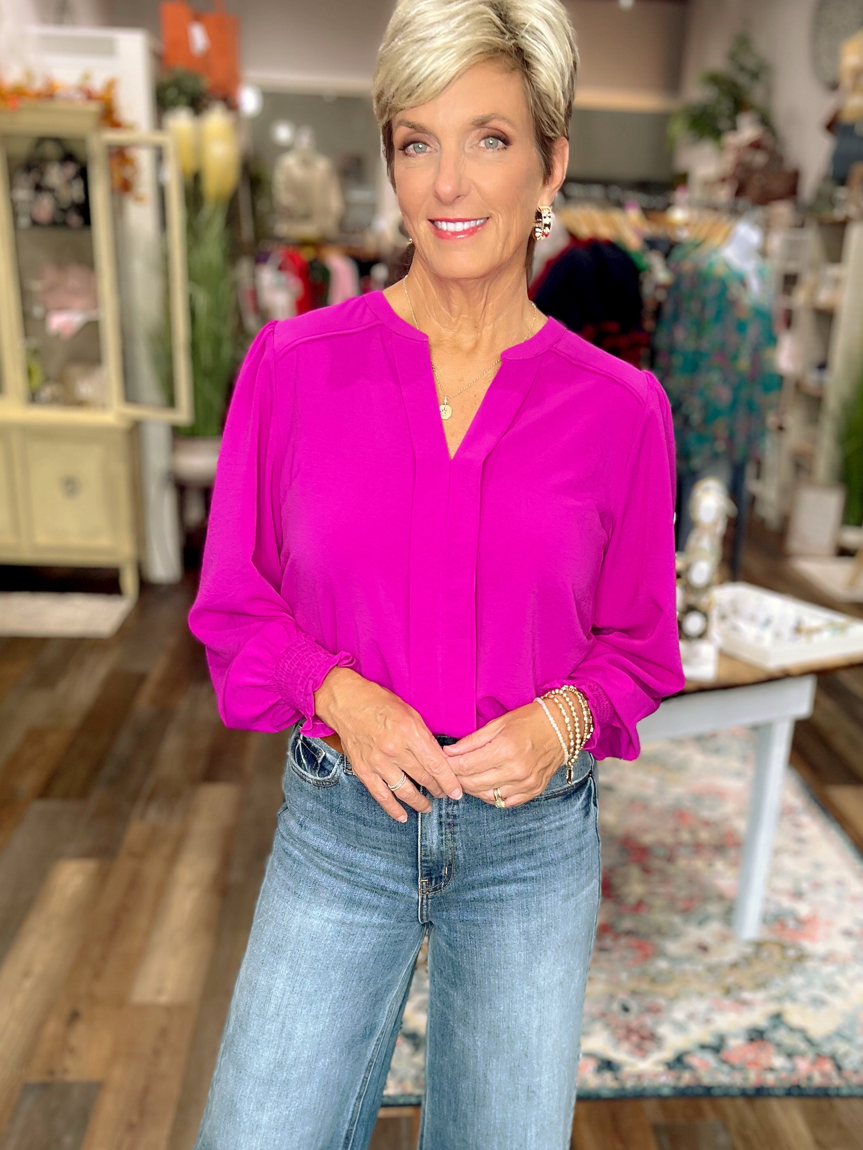 Bright, bold, and effortlessly chic—our Magenta Smocked Sleeve Pleated Blouse is ready to take center stage in your wardrobe. The front pleats create a flowy, flattering drape, while the long smocked sleeves bring just the right touch of fun and feminine detail.