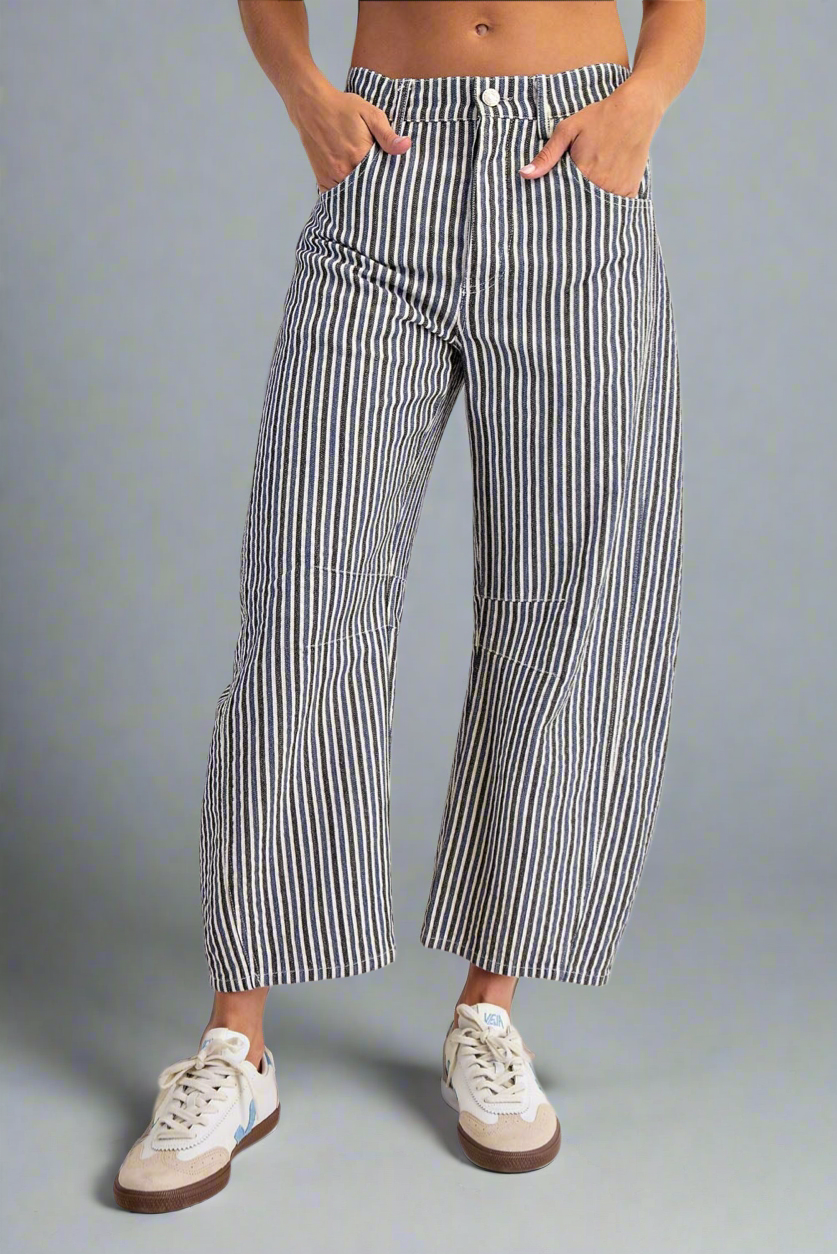 Step into effortless style with our Mineral Wash Striped Barrel Leg Jeans. Designed with a vintage-inspired mineral wash and bold vertical stripes, these jeans deliver both comfort and a flattering fit. The barrel leg silhouette gives them a relaxed, on-trend shape, while subtle knee seam detailing adds a touch of edge.