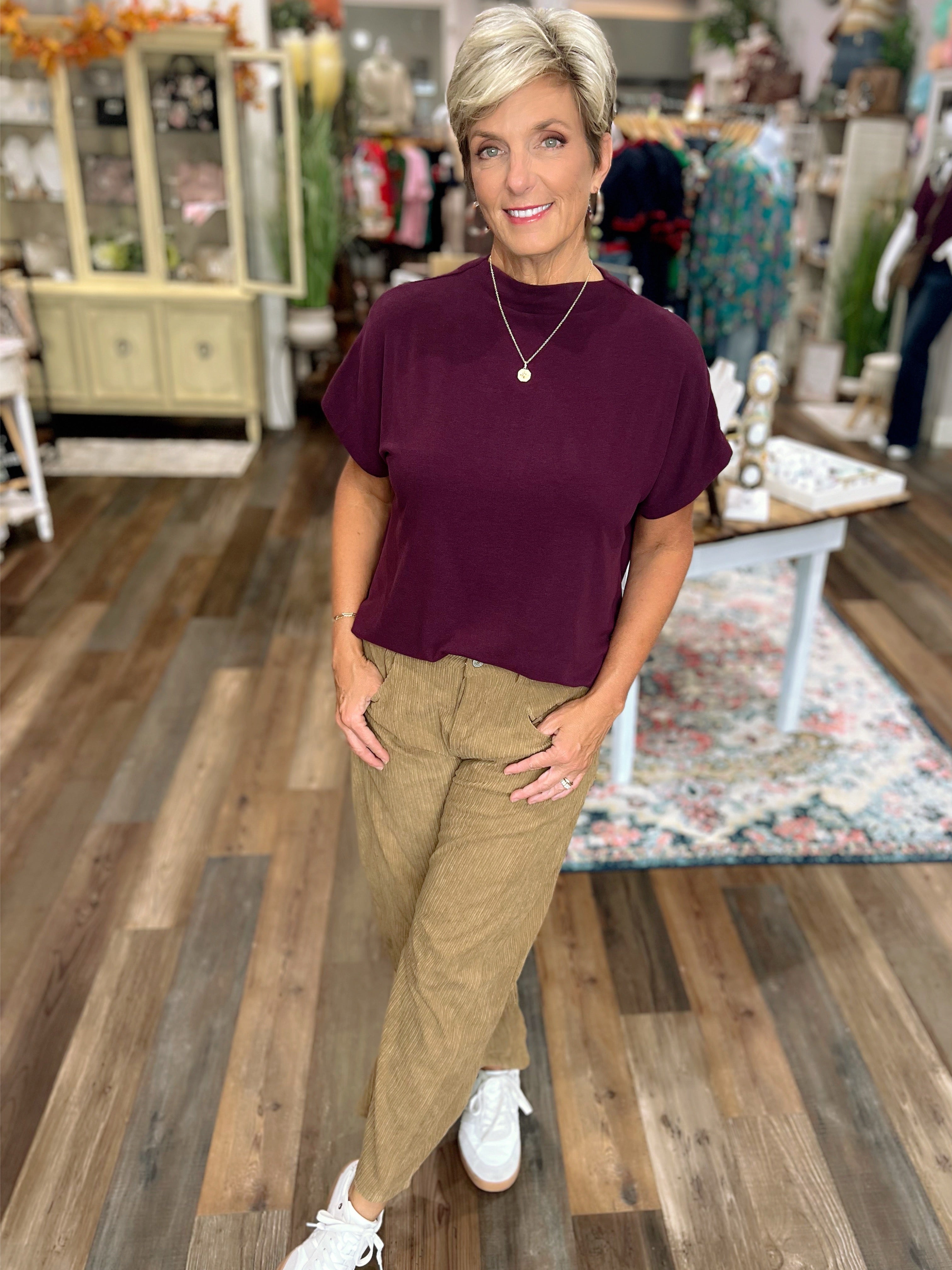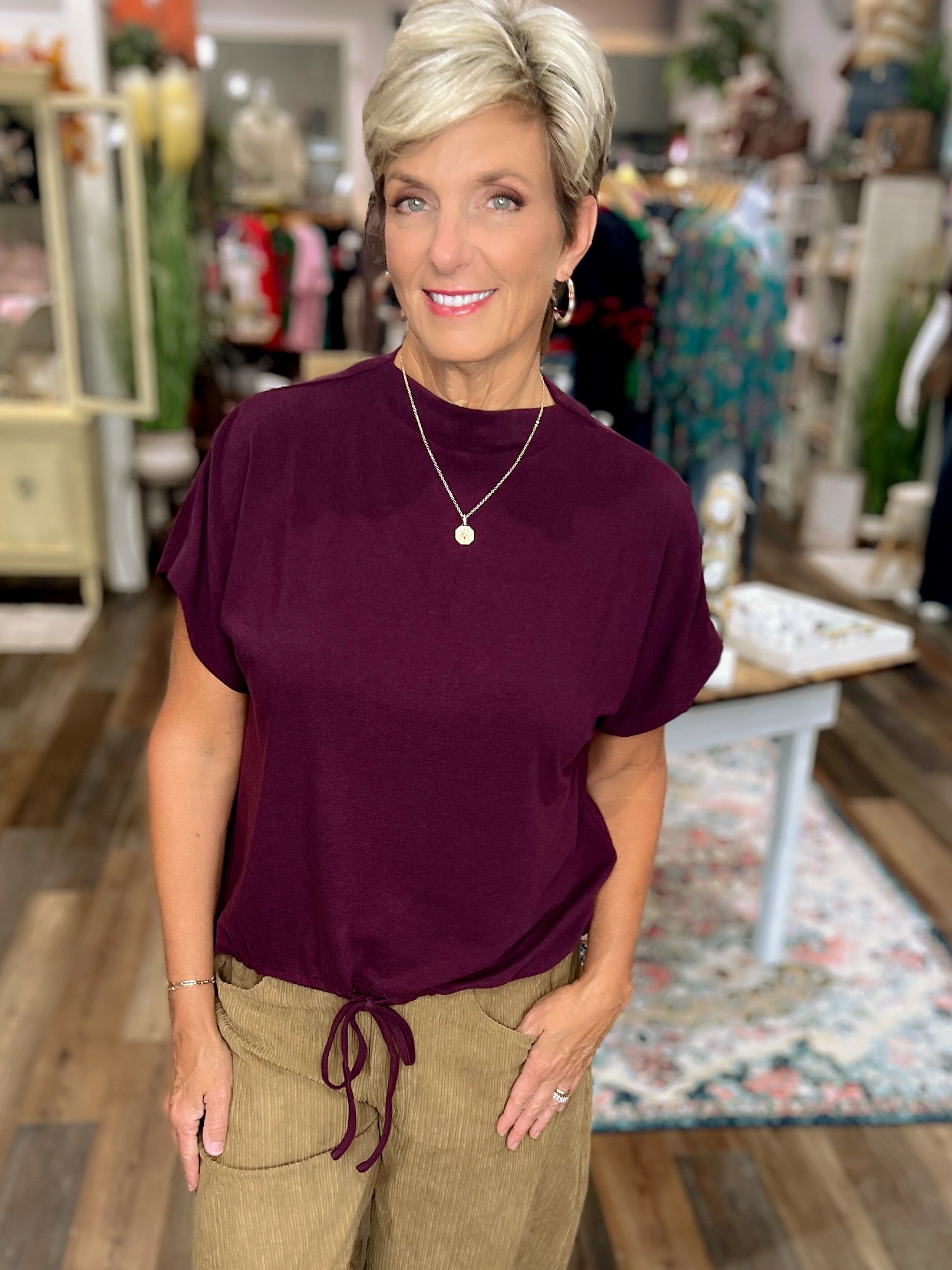 Say hello to the blouse that makes effortless chic actually effortless. The Plum Short Sleeve Drawstring Waist Blouse features a high crew neckline, dolman sleeves, and a soft brushed fleece feel that’s cozy yet polished. The subtle drawstring hem lets you cinch it for shape or leave it relaxed for an easy drape—because options are everything. Seriously, so soft!