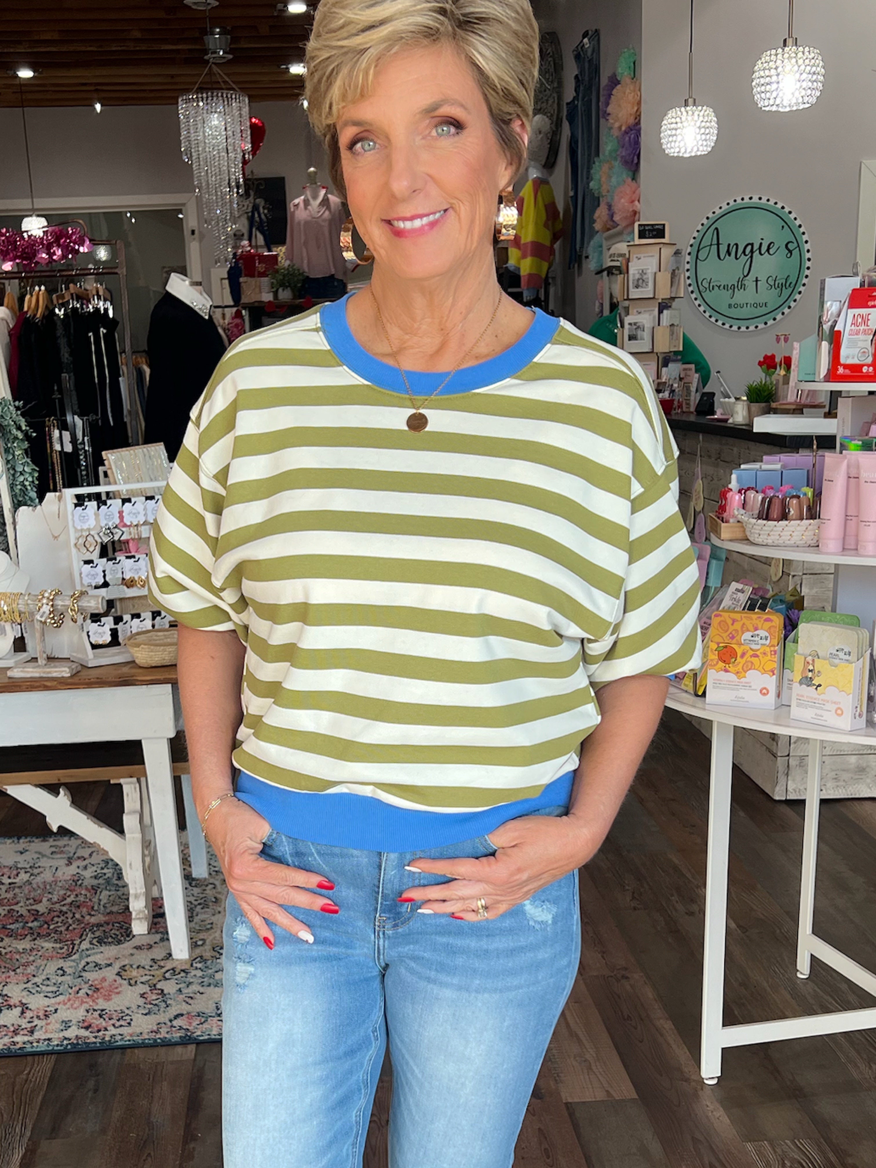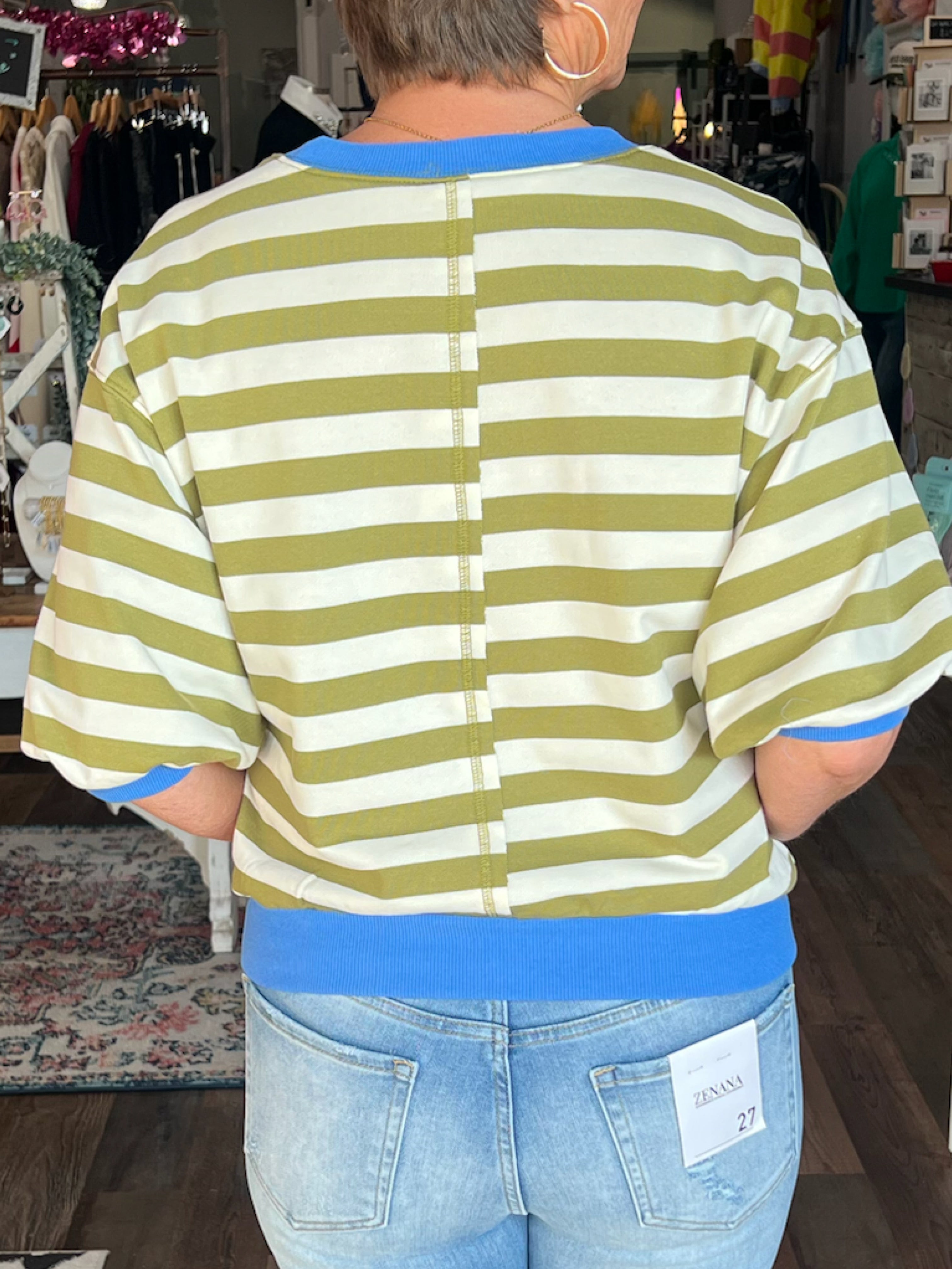 Get ready to turn heads with this oversized sweatshirt that's bursting with personality. The playful cream and olive stripes are anchored by a striking blue round neckline and matching cuffs, while puffy bubble sleeves steal the show with their bold, dimensional flair. Made from a comfortable cotton-polyester blend (60% cotton, 40% polyester), it's the perfect grab-and-go piece for anyone who refuses to choose between comfort and style.