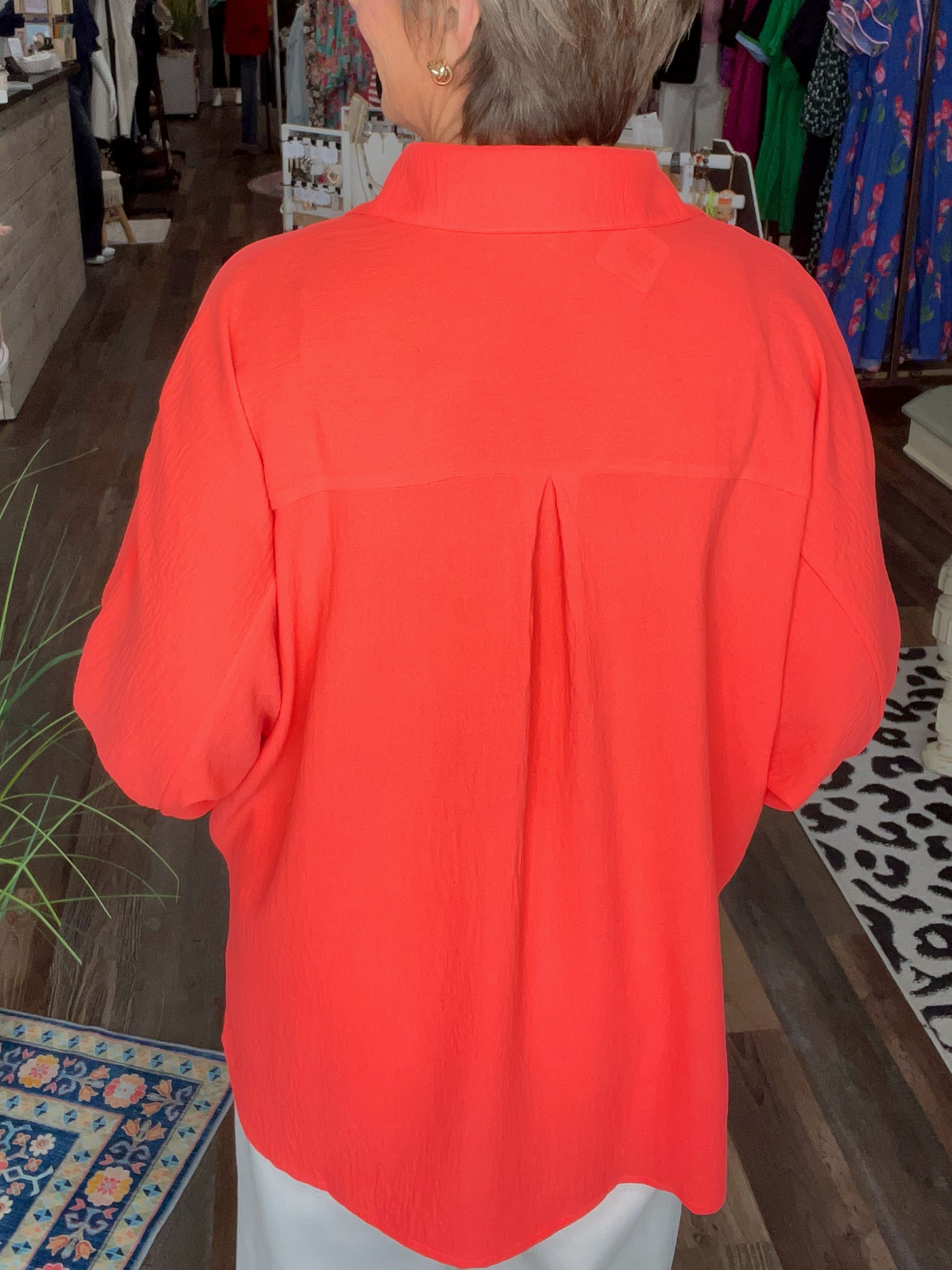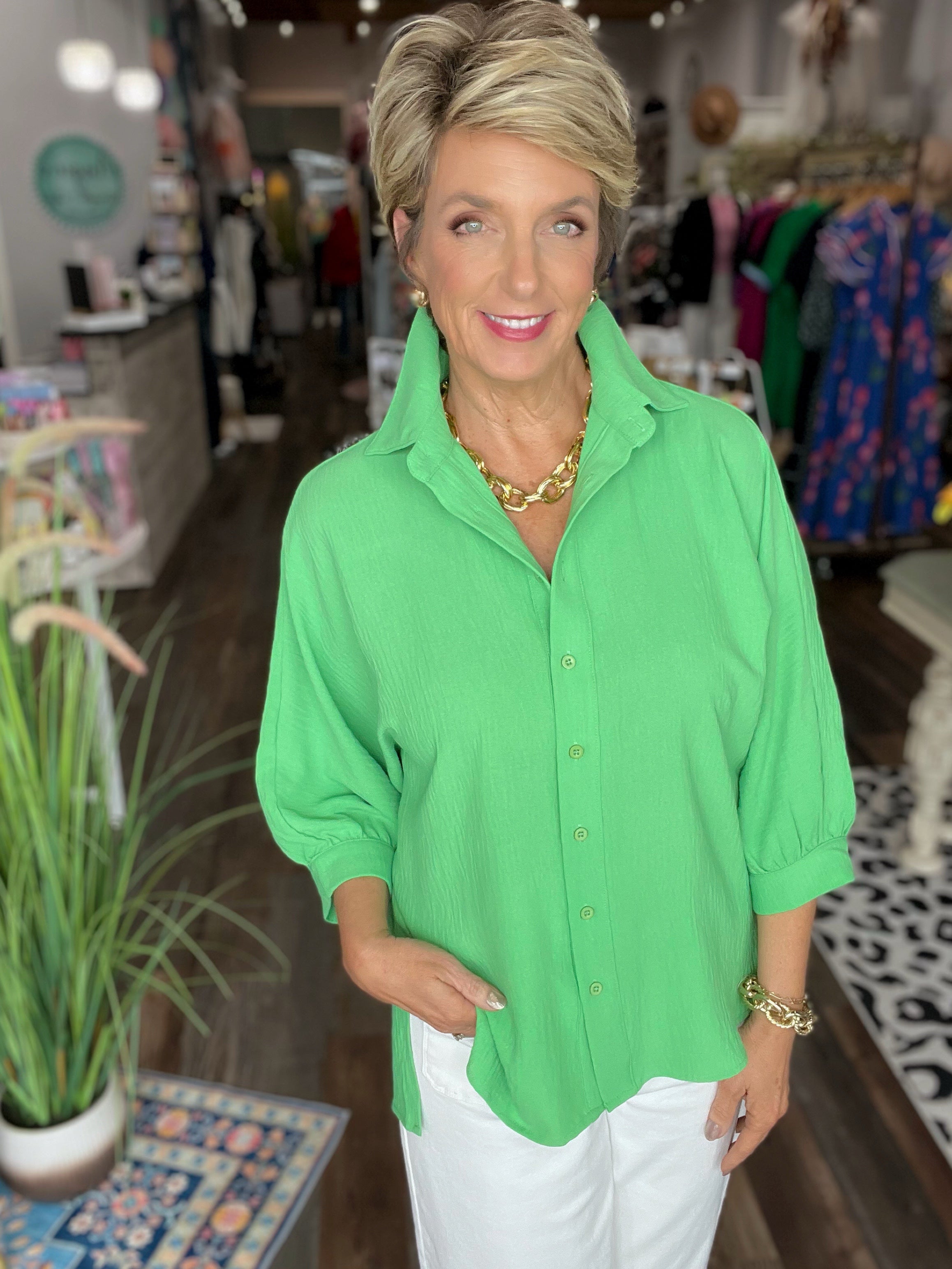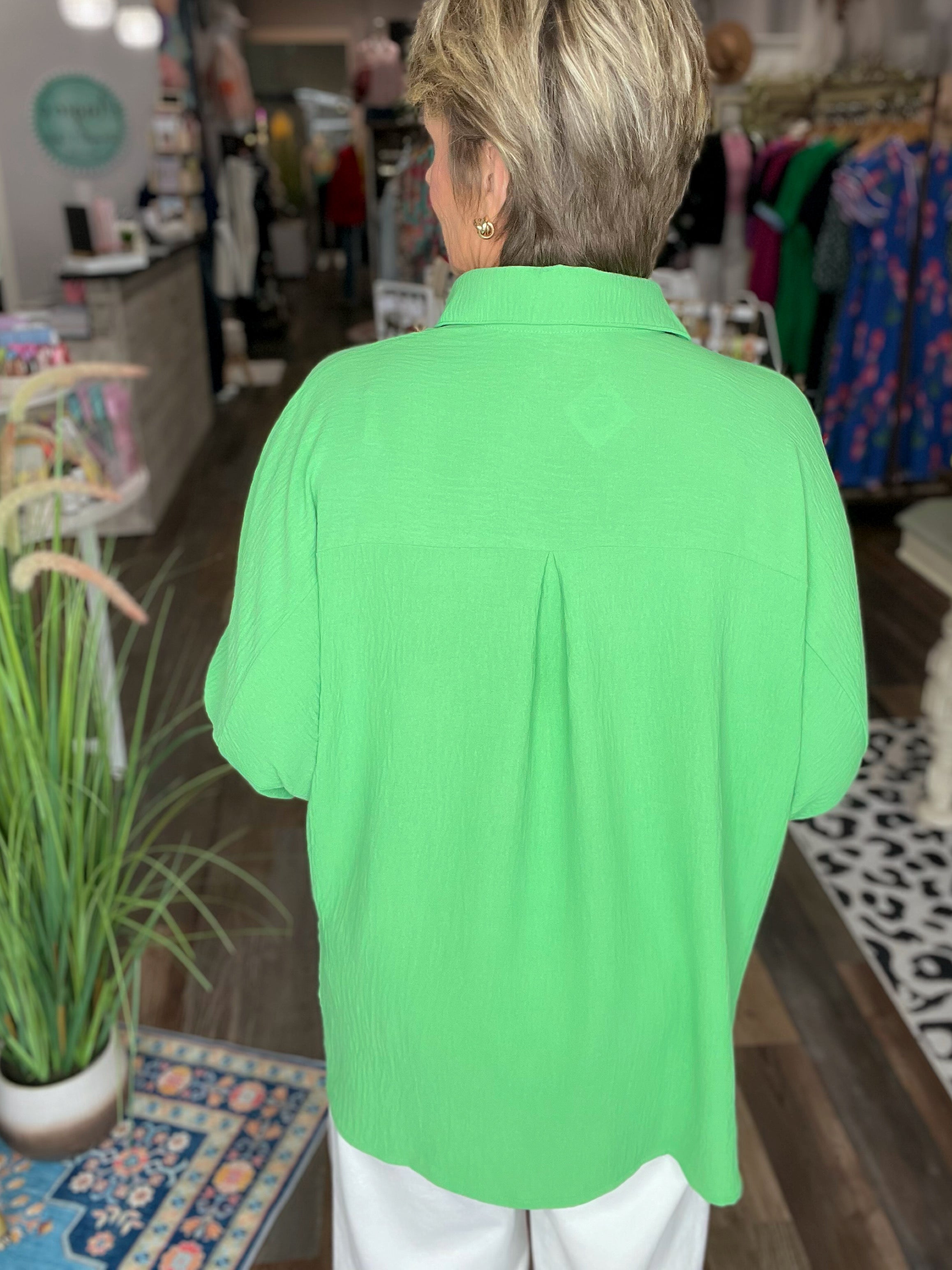 Cozy meets chic in the Sloane Button-Up Top —your new go-to for effortless spring and summer fashion. This oversized, relaxed-fit blouse features a classic collared neckline, functional buttons, and stylish half-length sleeves that make layering a breeze. Crafted in a soft, lightweight fabric blend, the Sloane offers both comfort and polish for any occasion.
