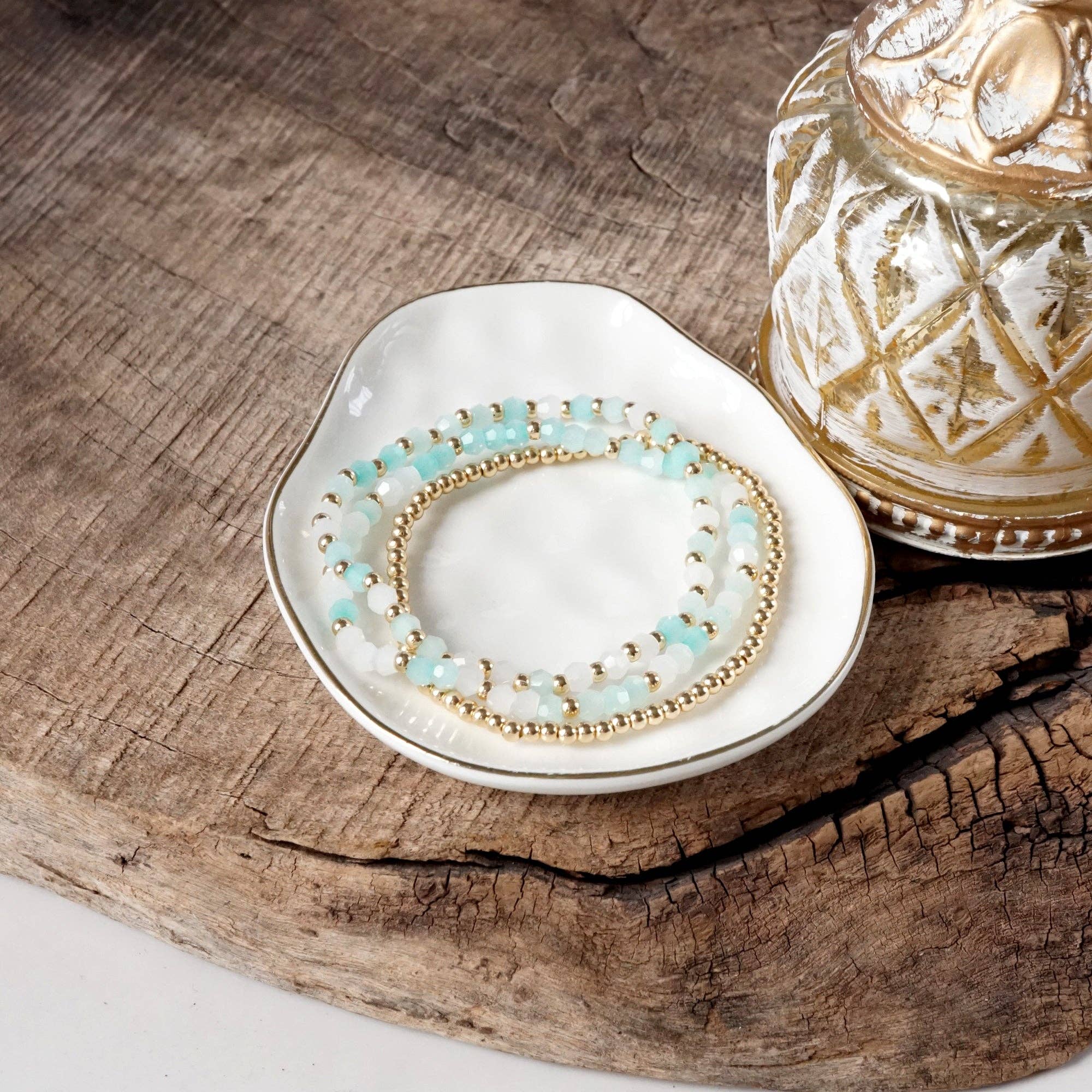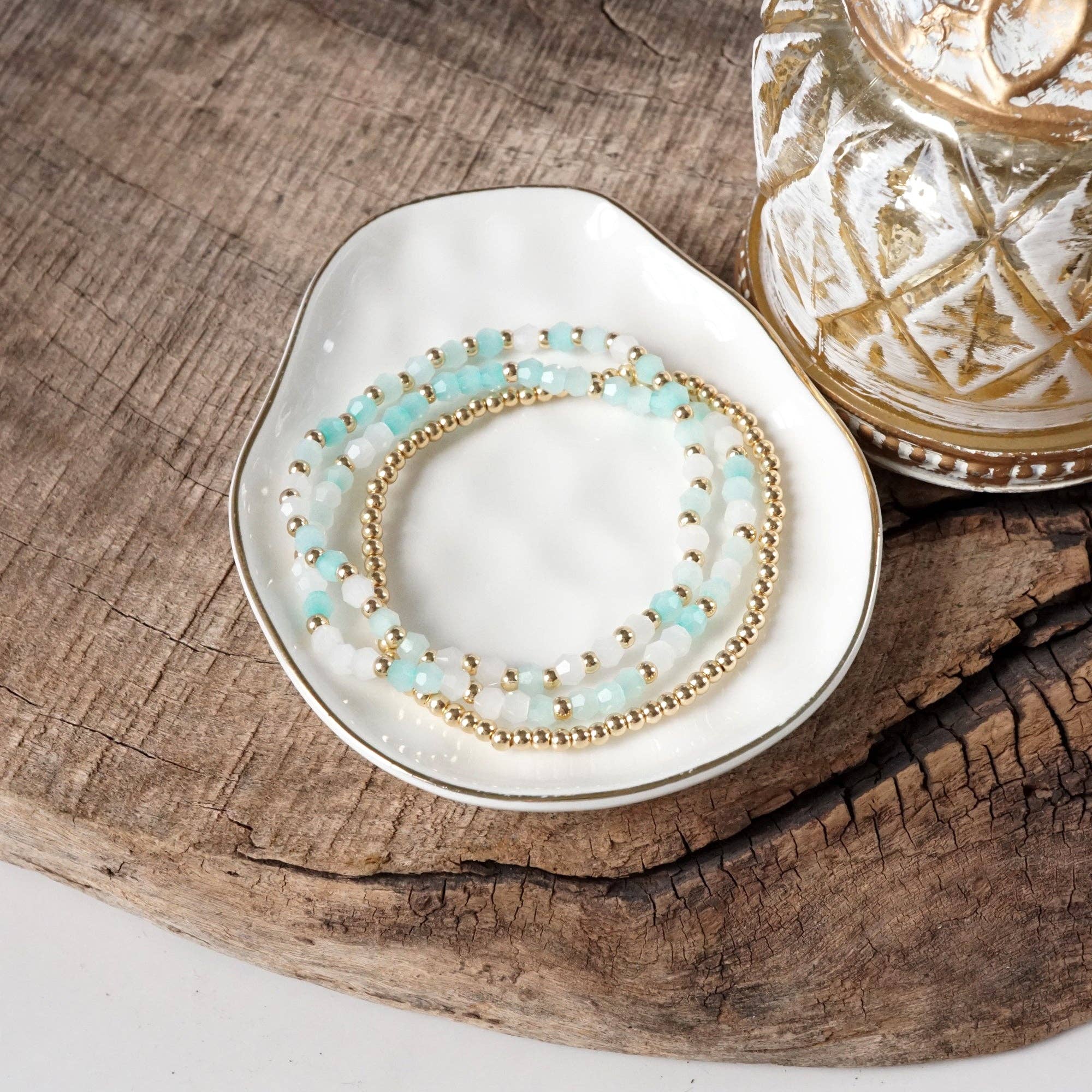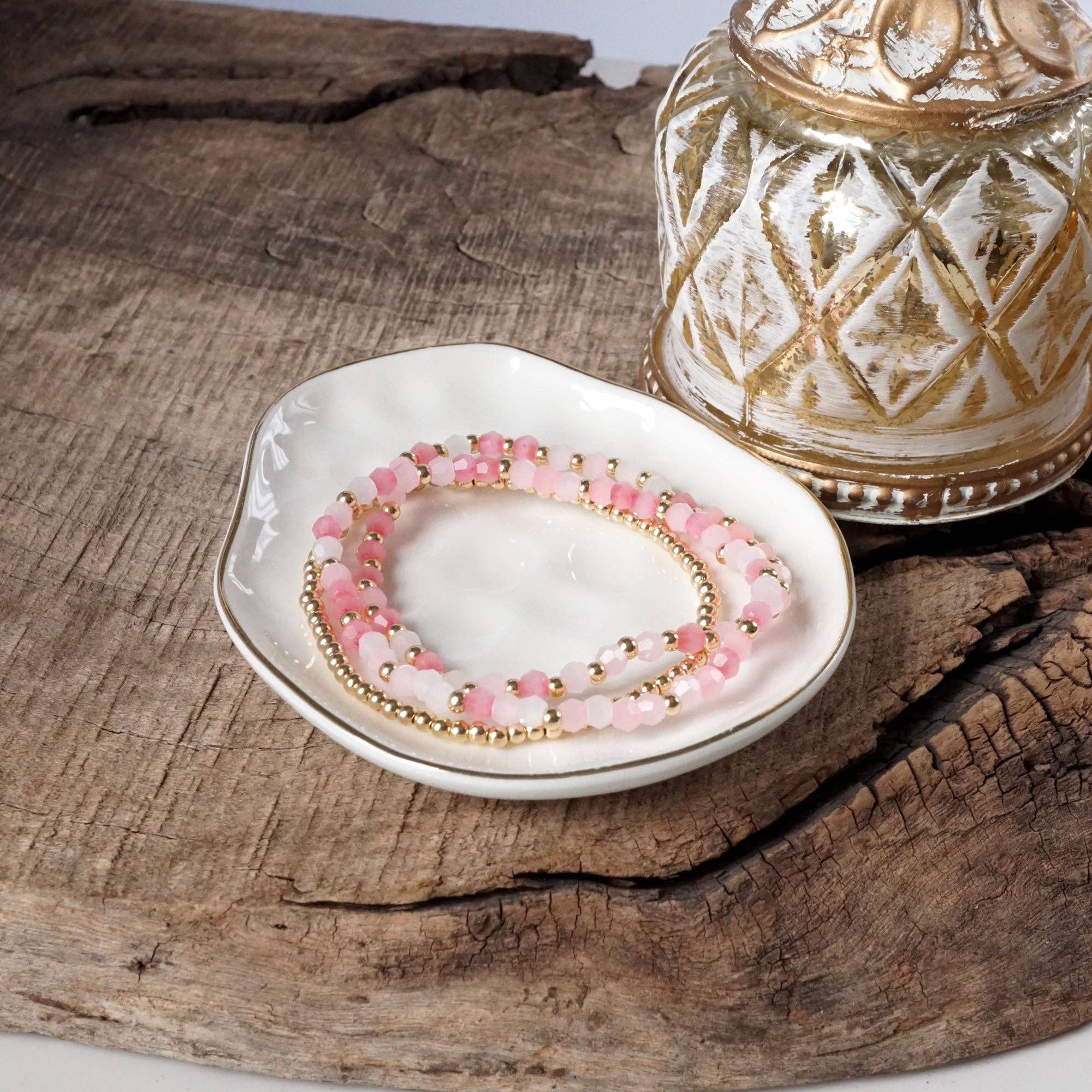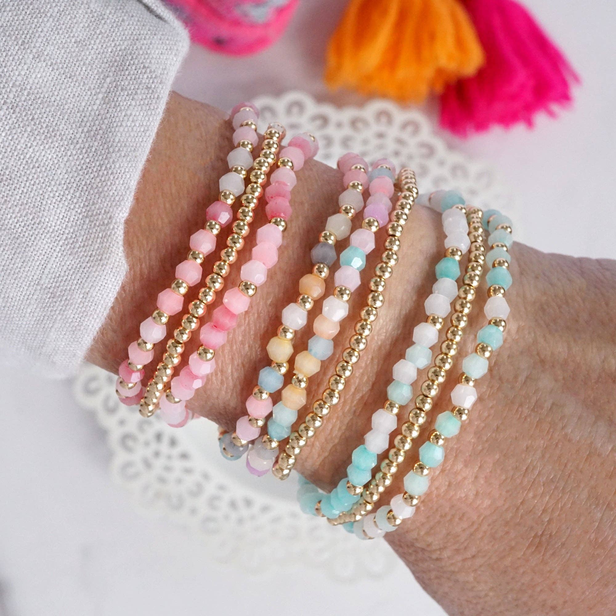 Small Gold tone and Glass beads bracelet stack of 3 bracelets - Pink ,Mint or Multi colored. Set of 3 bracelets in gold tone and color glass bead. This set of three stretchy bracelets blends delicate gold-tone beads with faceted glass beads in soft, dreamy hues. Whether worn solo or layered, these lightweight beauties bring an effortless charm to any look. Perfect for stacking and layering with other favorites