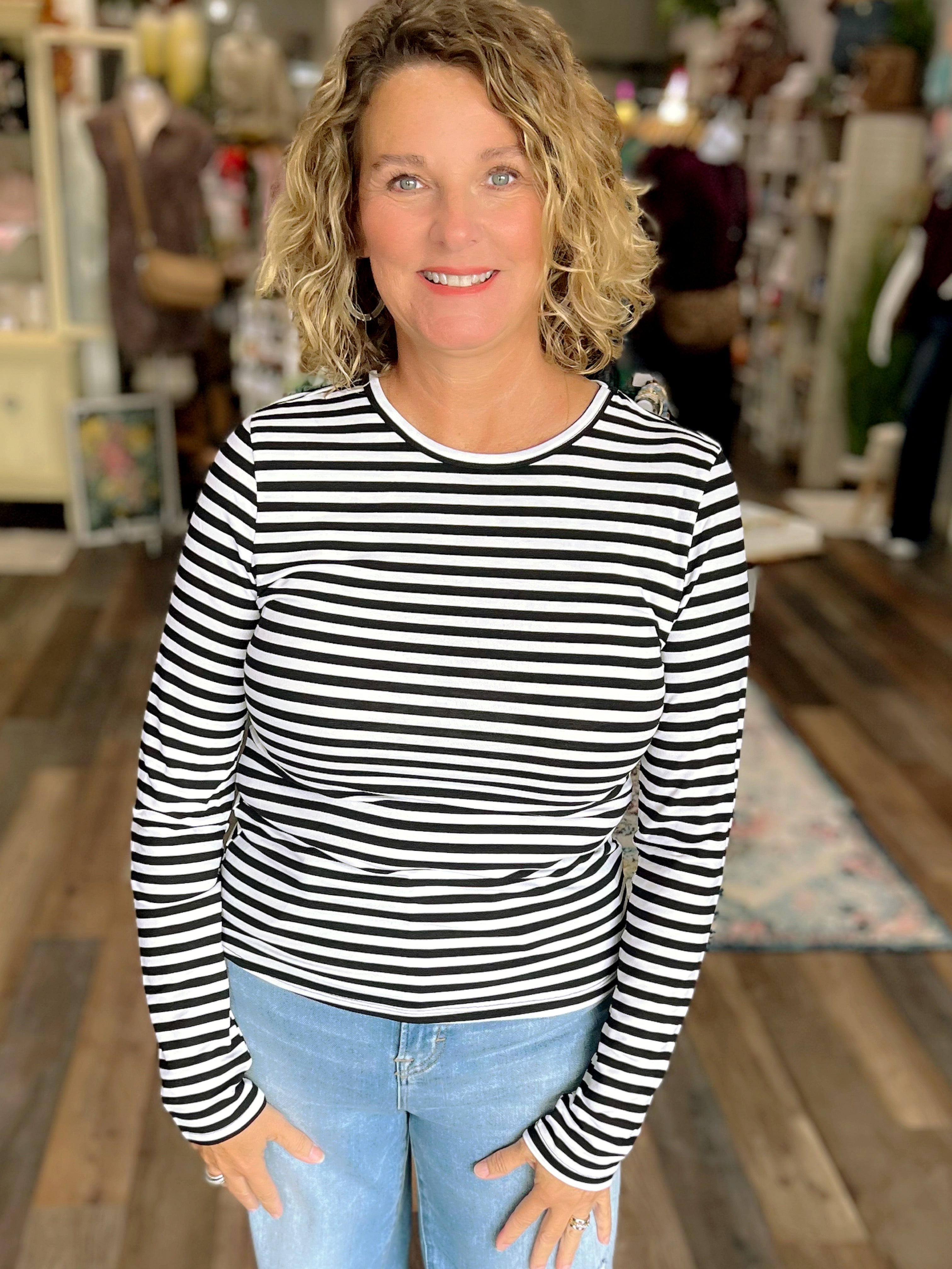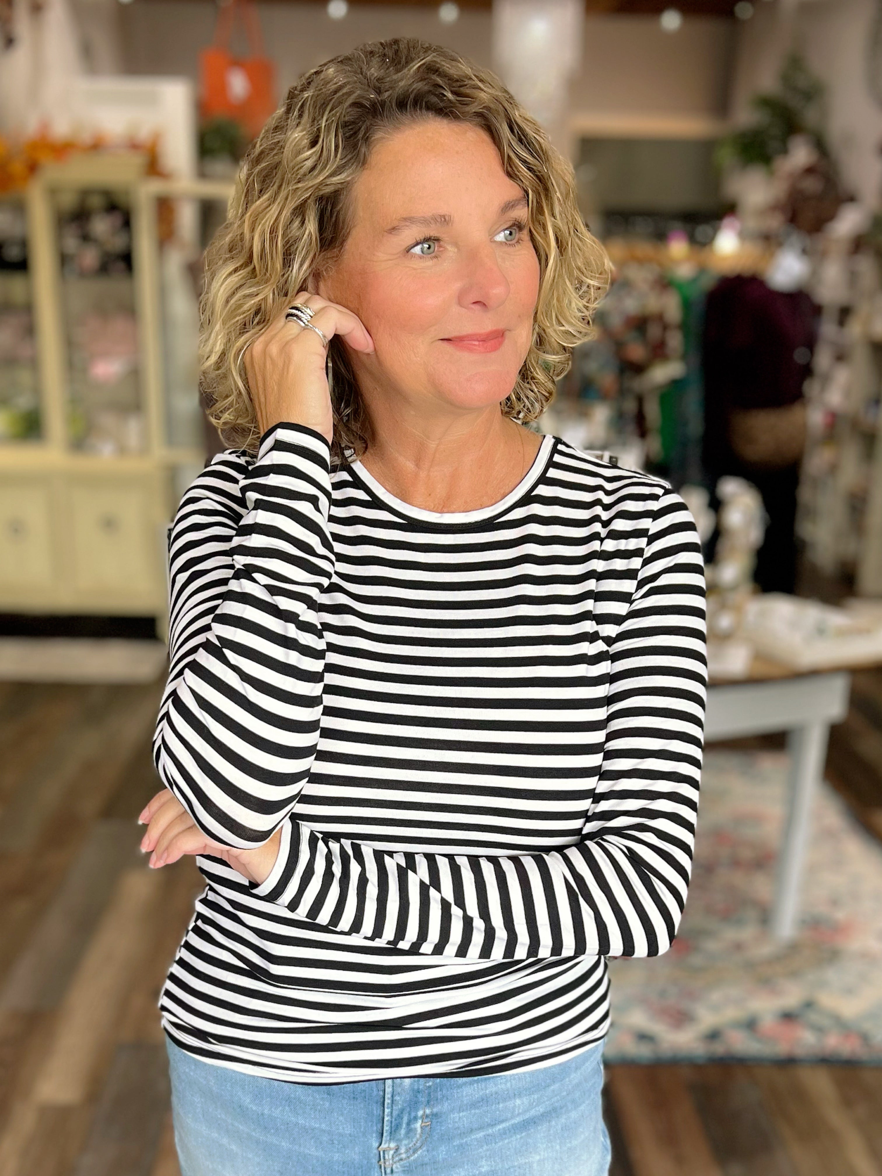 Classic, versatile, and oh-so-chic—this Striped Long Sleeve Crew Neck Top is a wardrobe essential you’ll reach for again and again. The timeless black and white stripes add effortless sophistication, while the soft stretch fabric ensures all-day comfort. Designed with a flattering crew neckline and a sleek fit, it’s the perfect piece for layering under jackets, cardigans, or wearing on its own.