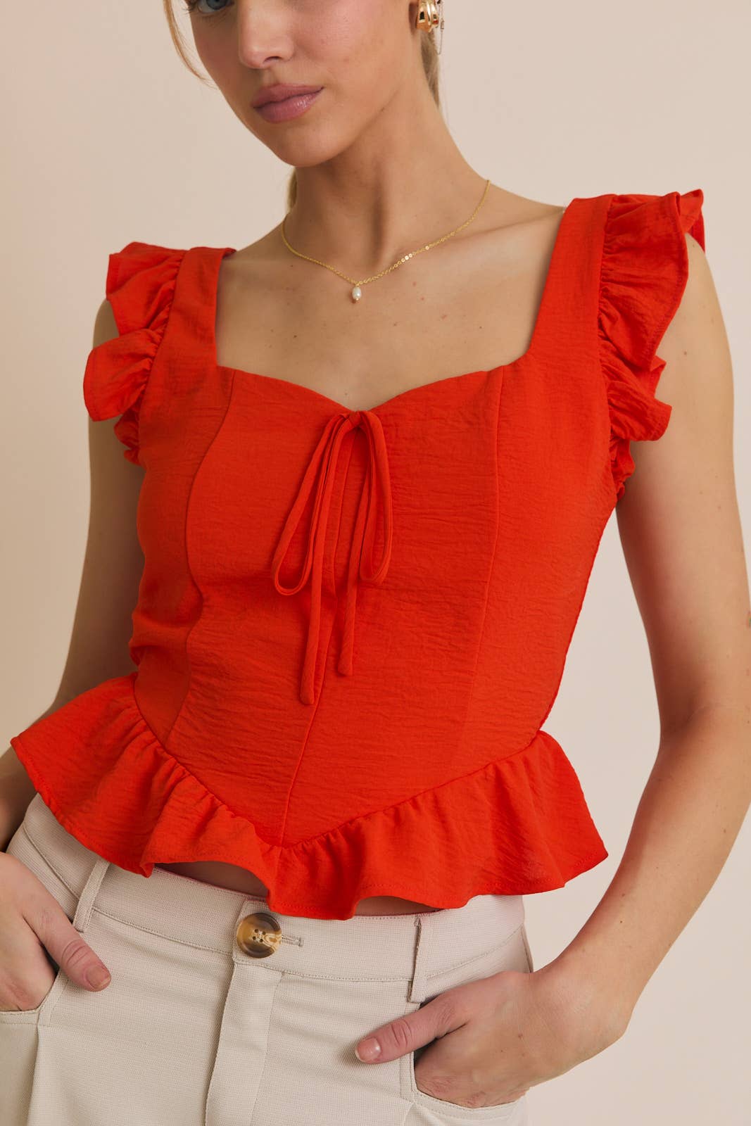 Featuring a flattering sweetheart neckline and delicate front tie detail, this top creates a soft, feminine silhouette that feels both playful and polished. The ruffle sleeves add a little extra movement and interest, while the peplum-style hem gives a flattering shape through the waist.