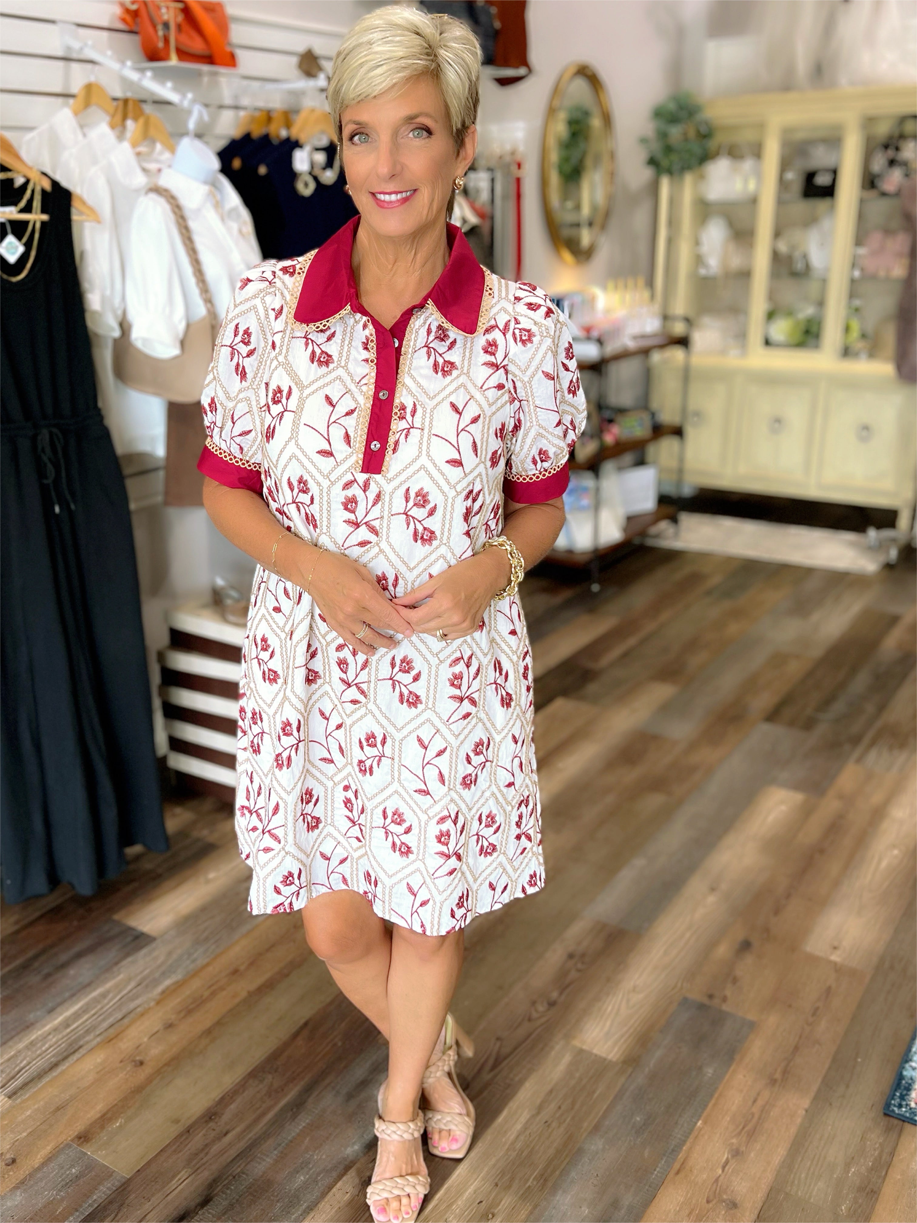 Turn heads in this timeless embroidered mini that blends vintage charm with modern flair. The Cottage Bloom Dress features an intricate floral pattern in rich brick red tones, framed by a geometric honeycomb design. Puff sleeves add a touch of drama, while the contrasting collar and button placket bring a bold pop of color. Finished with delicate trim accents and side pockets for a functional twist, this woven mini is fully lined, non-sheer, and lightweight—made to keep you cool and classy heading from Sunmer right into the fall season.