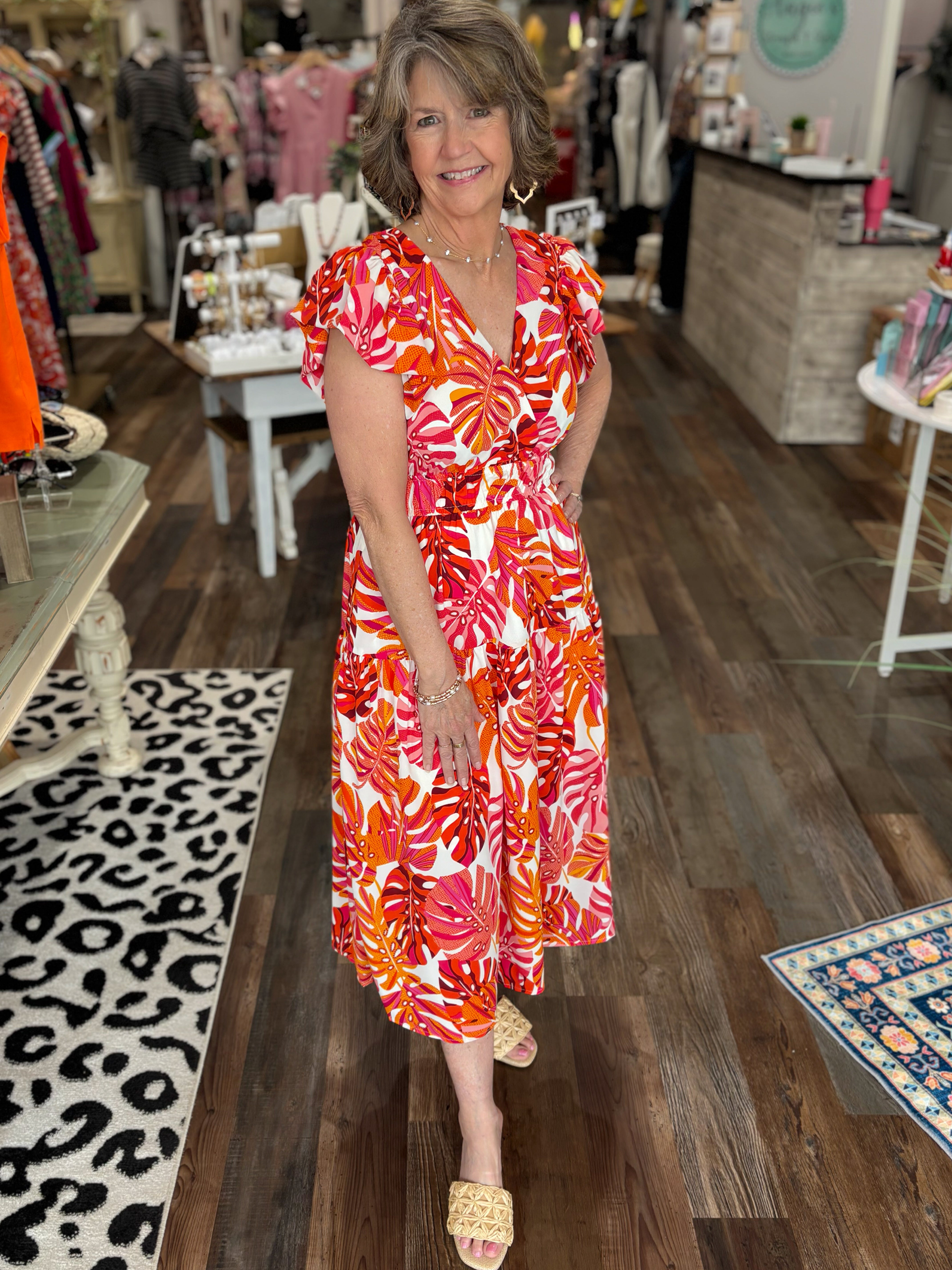 The Sunset Palm Midi Dress is that feel-good piece your closet’s been waiting for. With its vibrant tropical-inspired print and flattering silhouette, it brings just the right amount of color and confidence to your day—without feeling overdone.