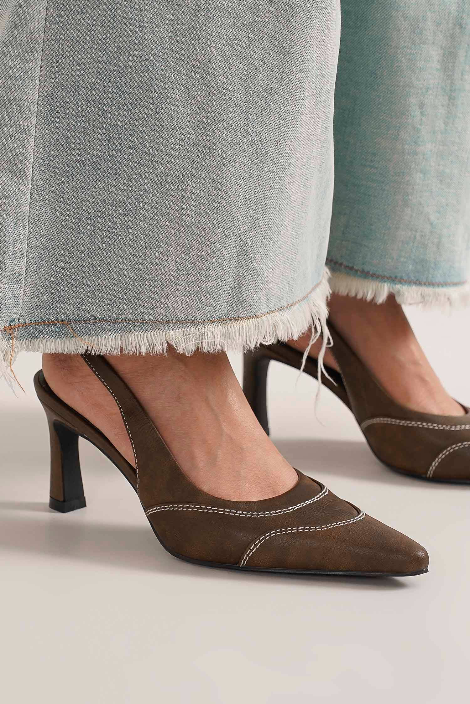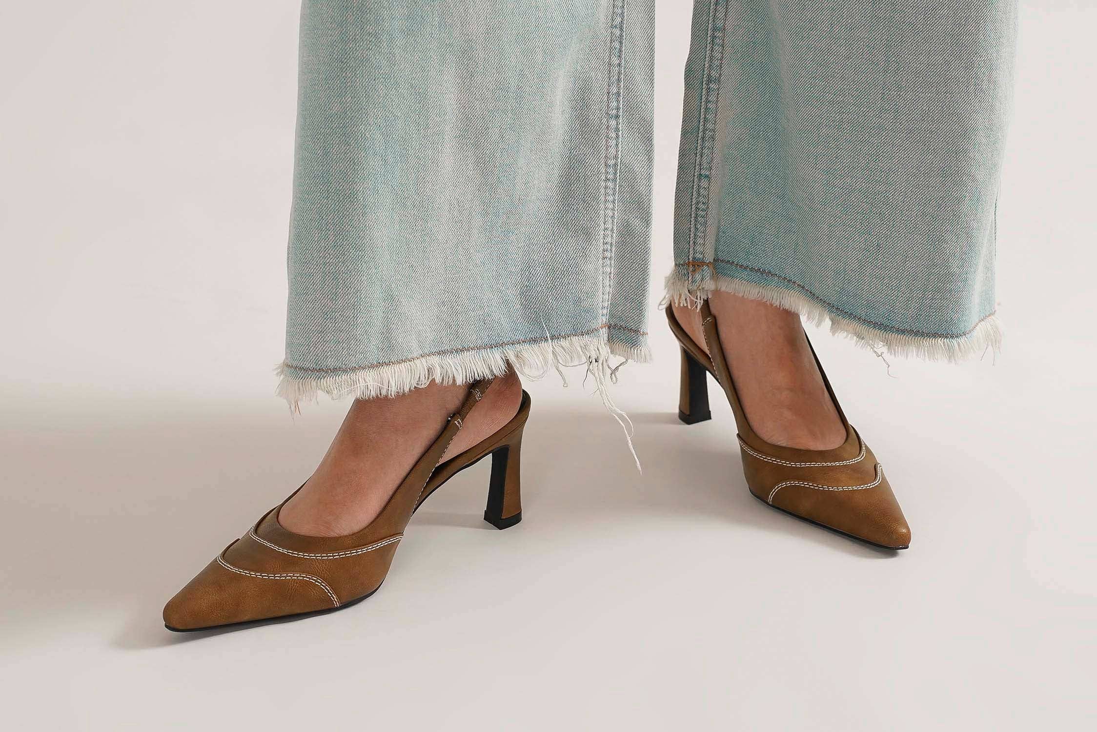 Elevate your style with the Trinee Slingback heels. Featuring a pointed toe and elegant contrast stitching, these heels offer a modern twist on a timeless design.