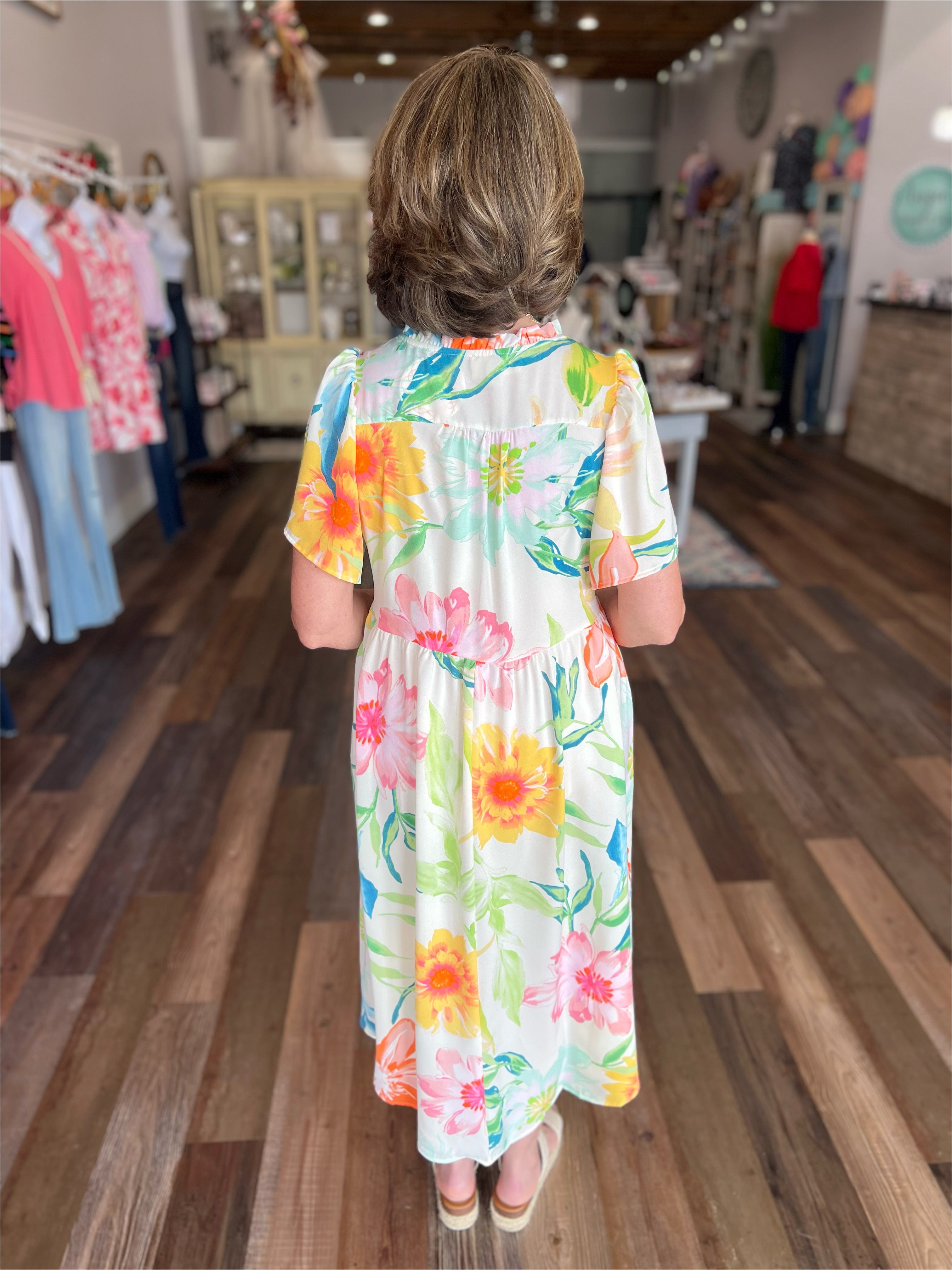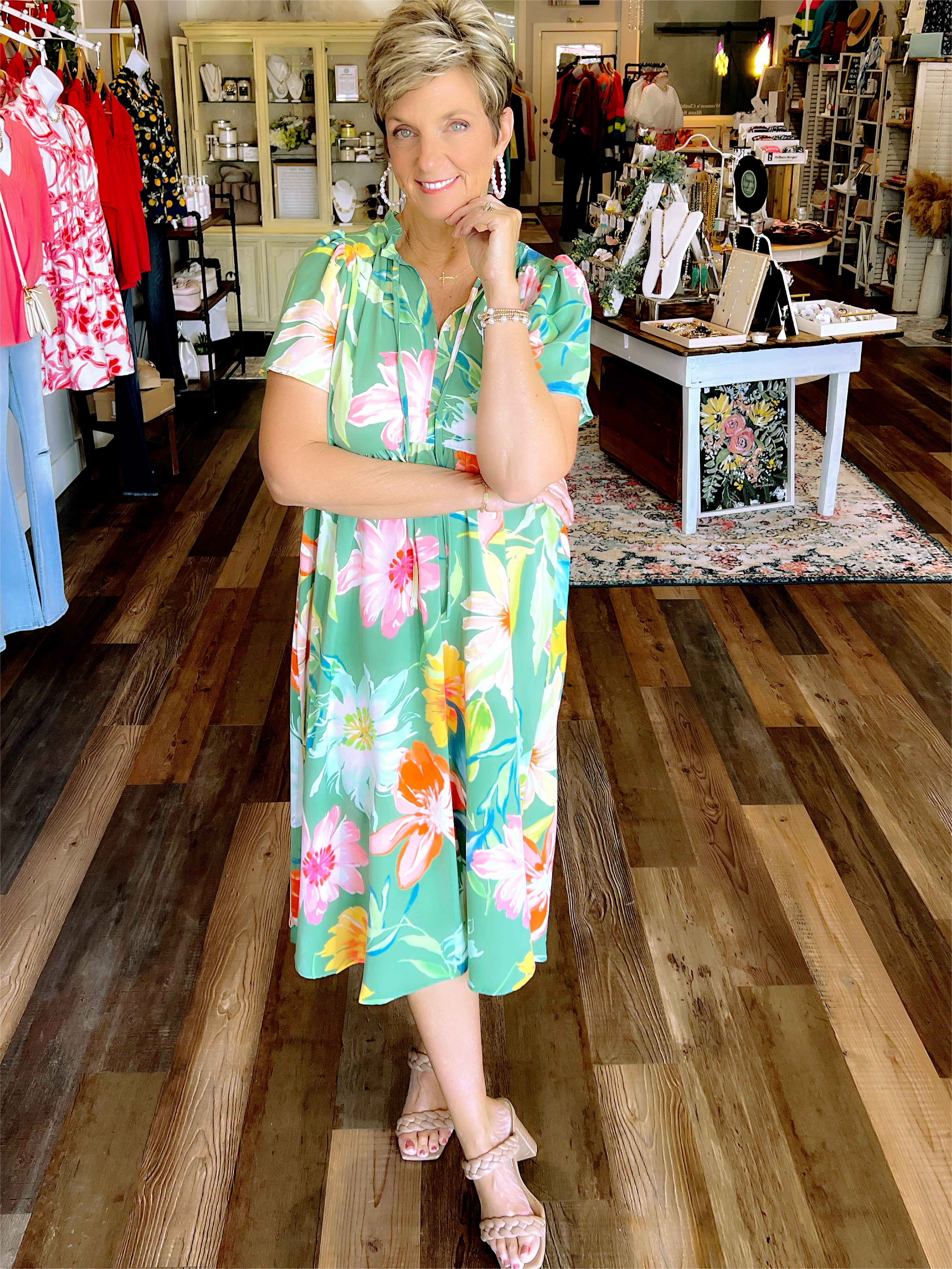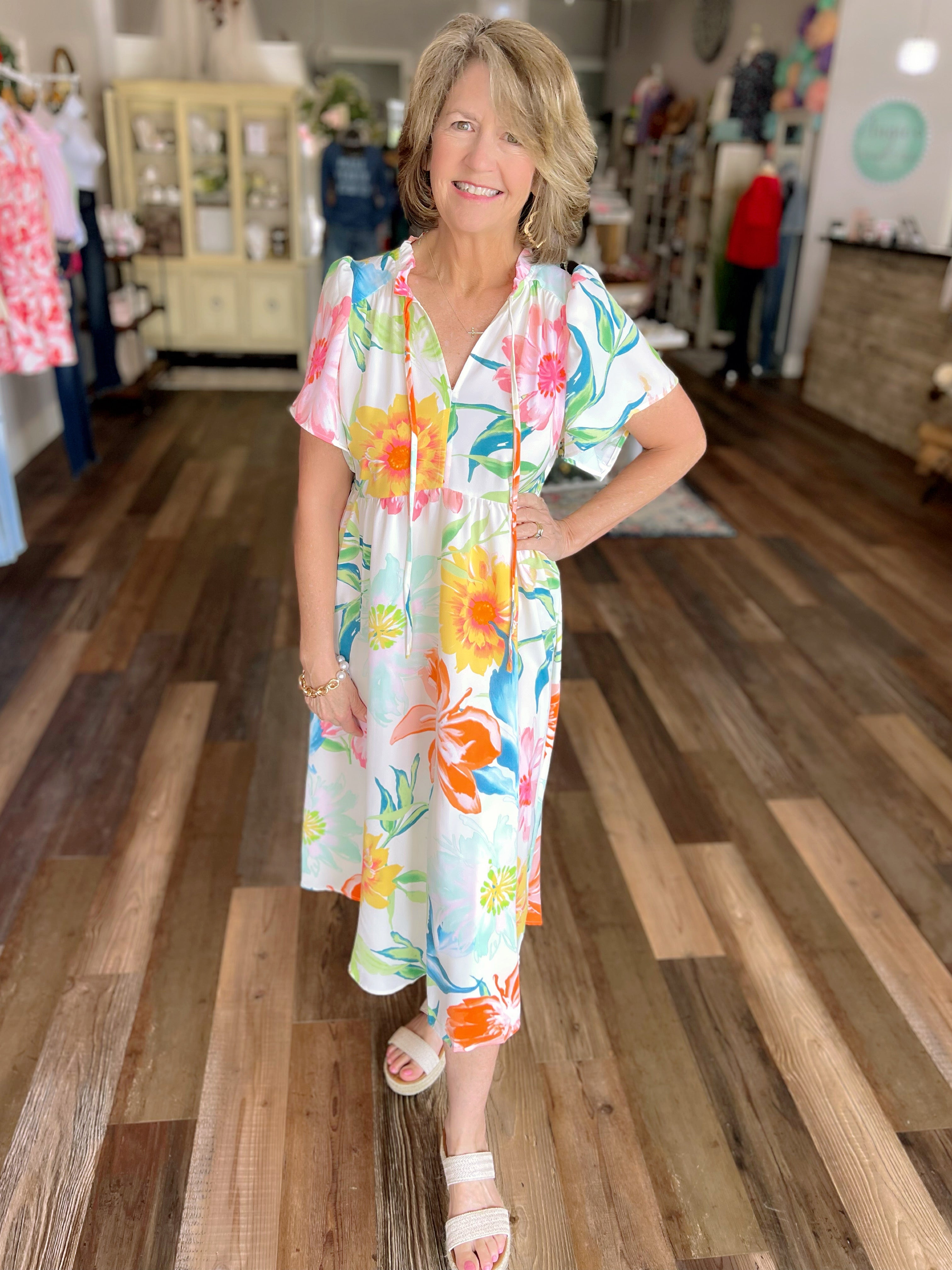 Choose from two lovely spring shades in our beloved style dress - featuring a charming floral print. Flattering fit with a tie-neck and delicate ruffle accents, made with 100% polyester.