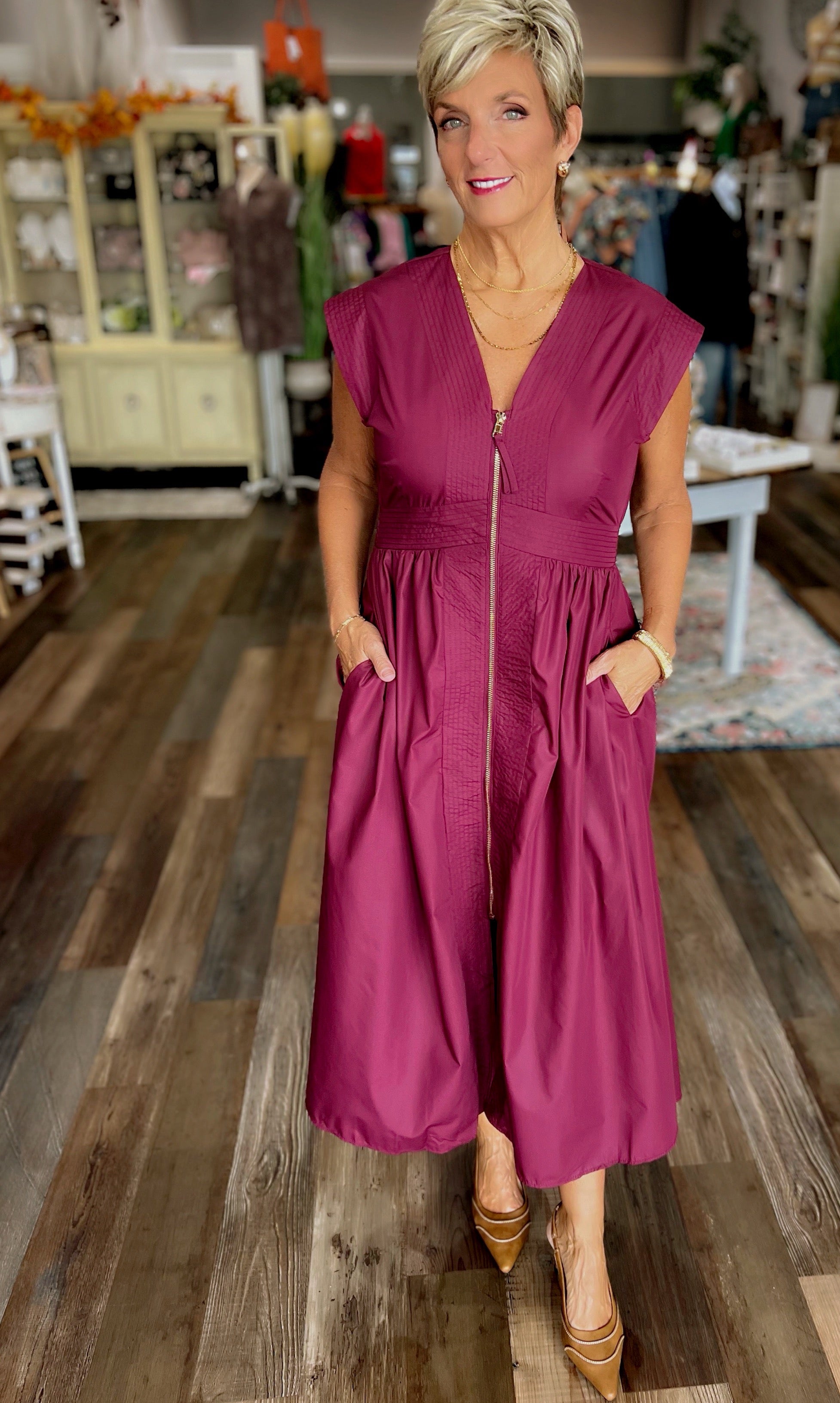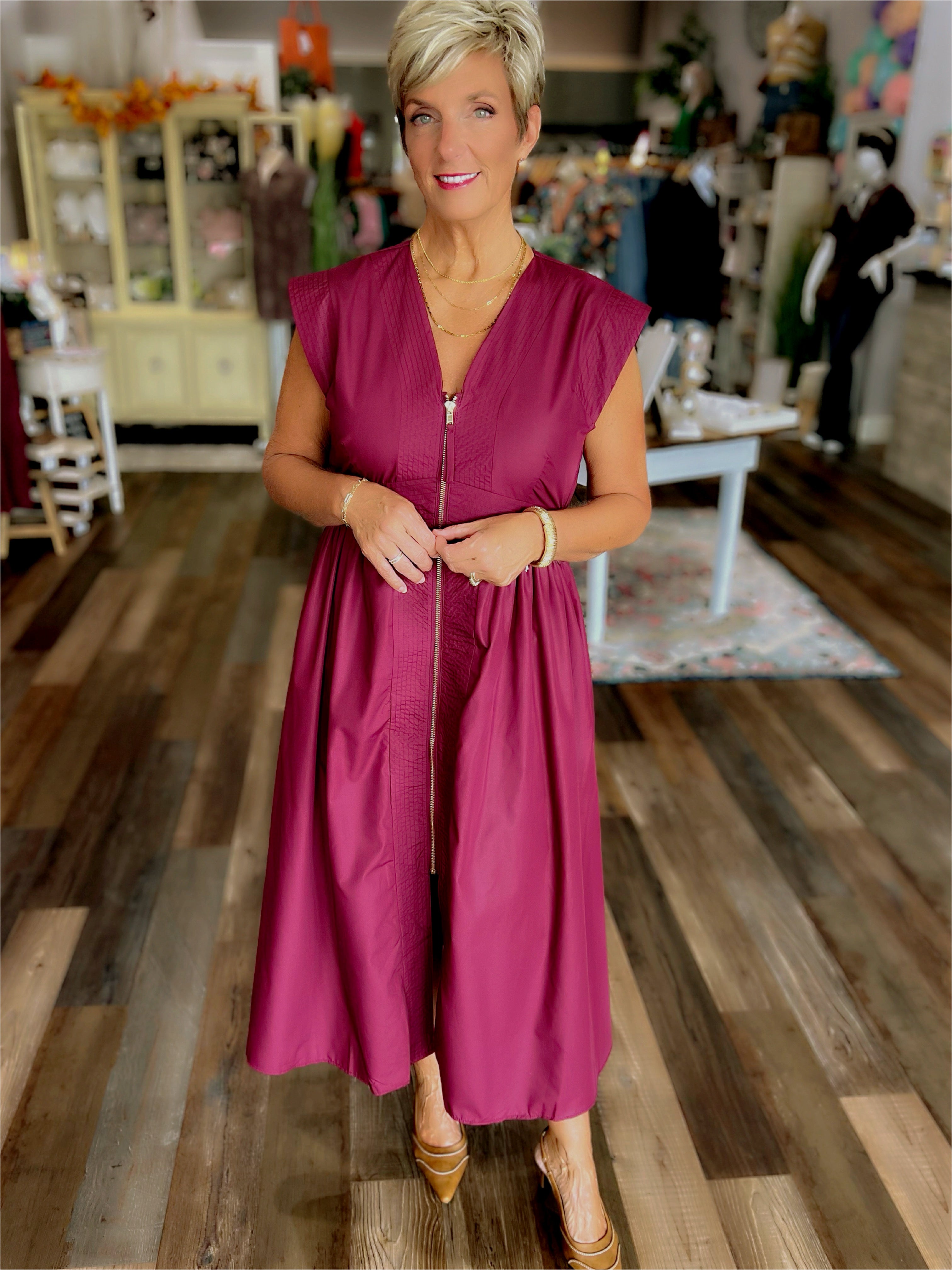 Effortless sophistication meets everyday comfort in our Zip-Front V-Neck Midi Dress. Designed with a flattering fit-and-flare silhouette, this dress features textured stitching bands and cap sleeves for a modern yet timeless touch. The zip-front detail adds a hint of edge, while the smocked waistband at the back ensures a comfortable, flexible fit.