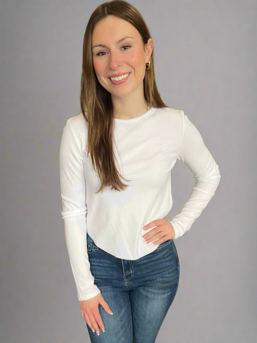The cutest most form flattering curved hem ribbed top! Features a high-low, front-back with curved sides that form fitting, small waist appearance! Features thumbhole sleeves.