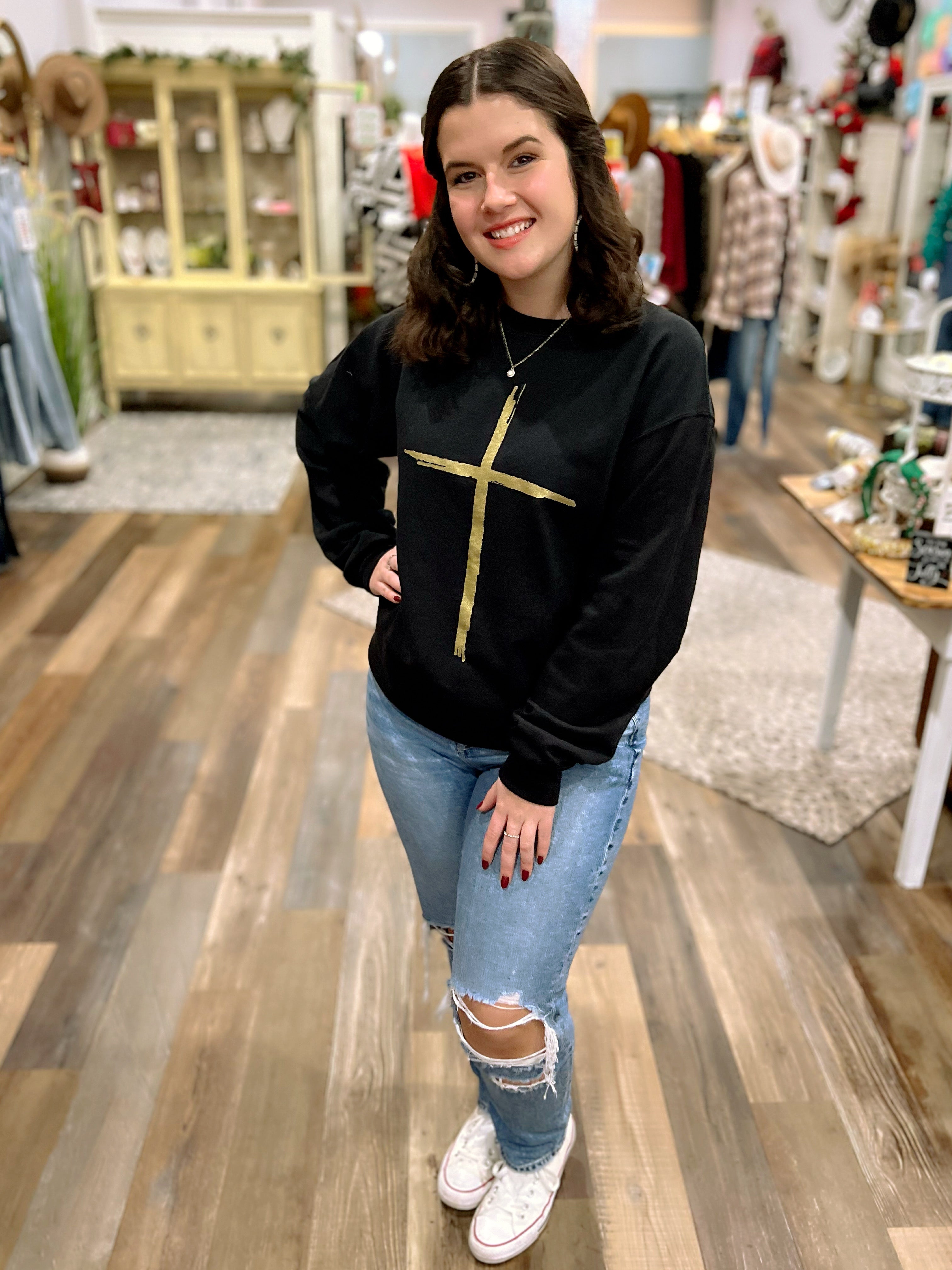 Stylish and cute black crewneck- this sweatshirt also features a striking gold cross graphic design. Its soft and comfy material is perfect for everyday wear with its faith-inspired message.