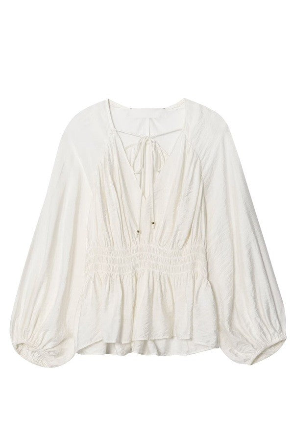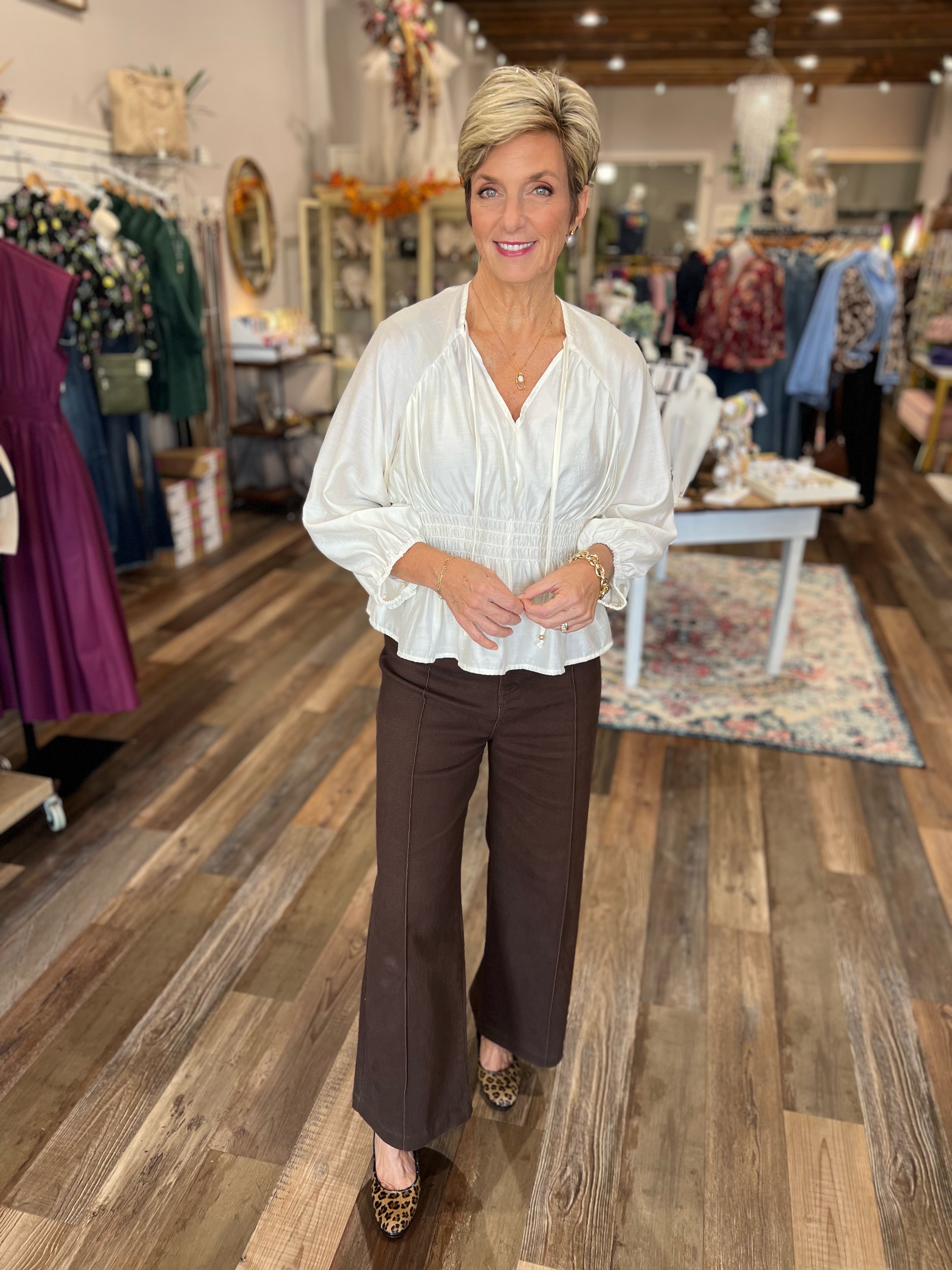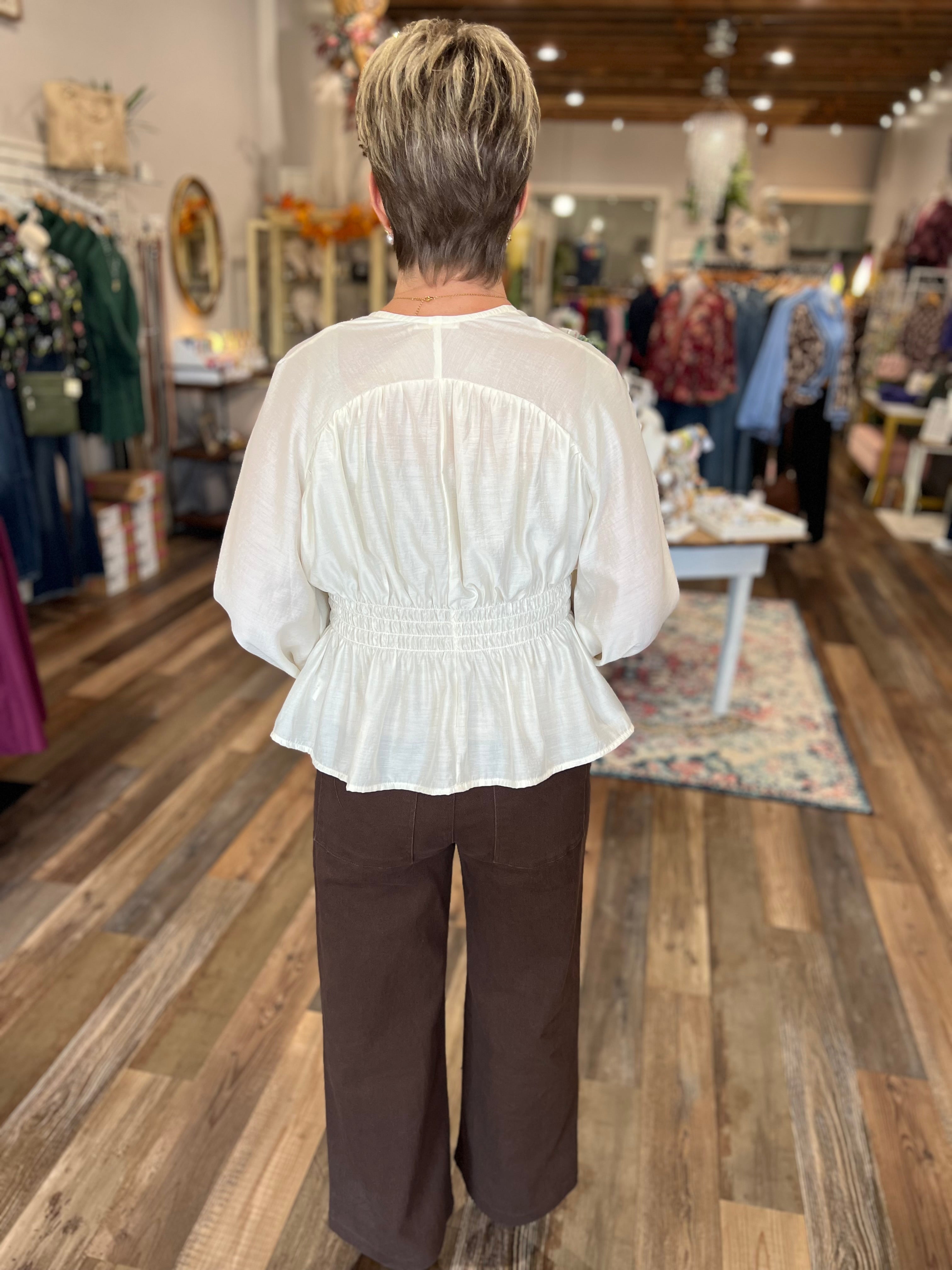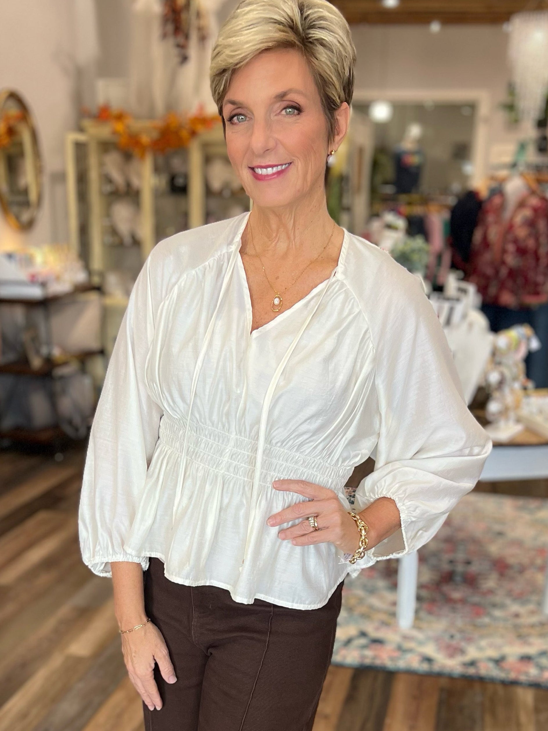 Soft, feminine, and effortlessly chic — our Ivory Smocked V-Neck Blouse is a must-have for every season. This pretty top features a flattering smocked waist that defines your shape while maintaining a relaxed, easy fit. The front tie detail and billowy balloon sleeves add that boutique-style charm you’ll reach for again and again.