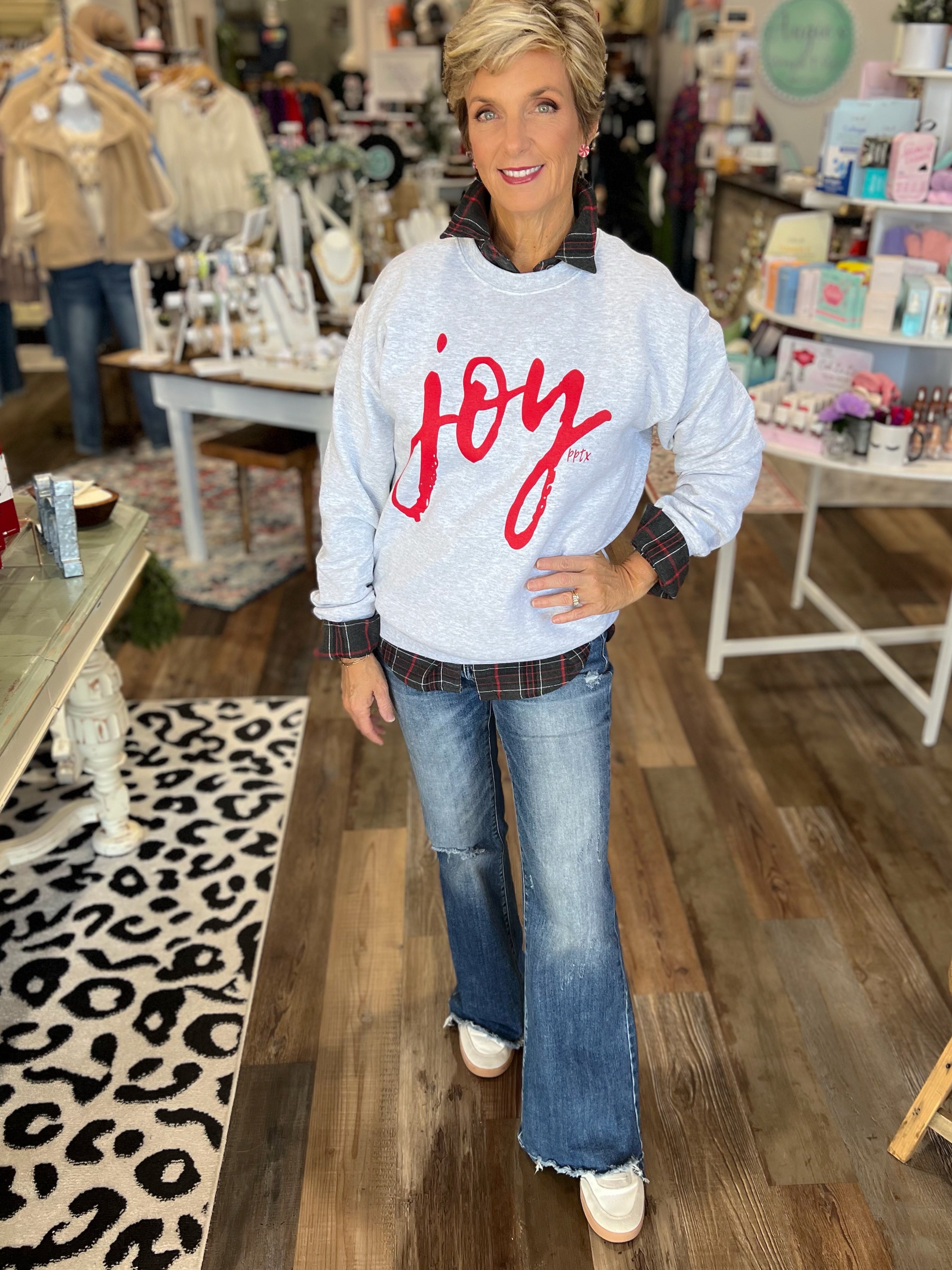 Introducing the Joy Sweatshirt, perfect for layering with your favorite flannel. This ash colored sweatshirt features a bold red "joy" print, adding a pop of color to any outfit. Embrace the joy of comfort and style with this playful sweatshirt.