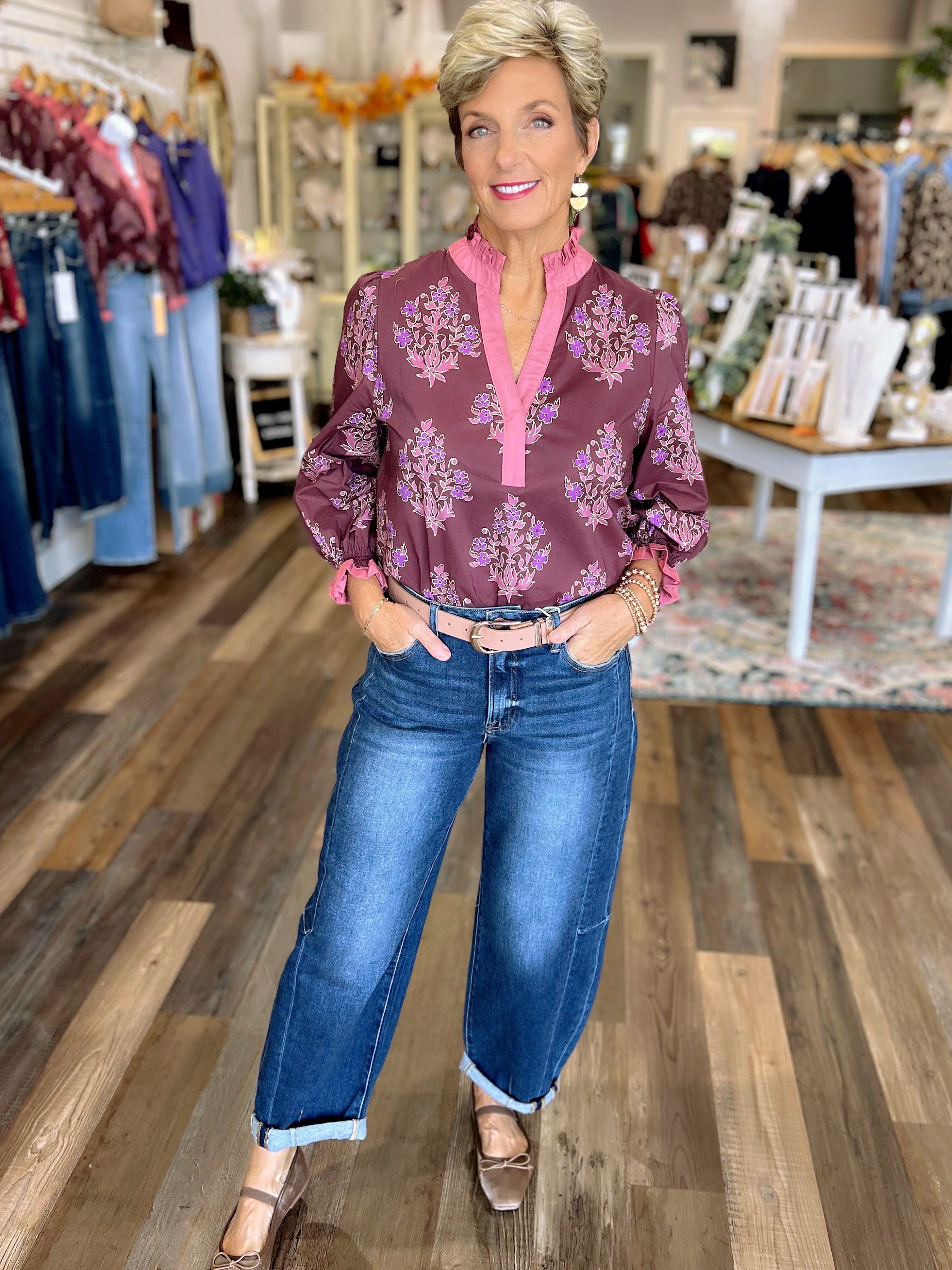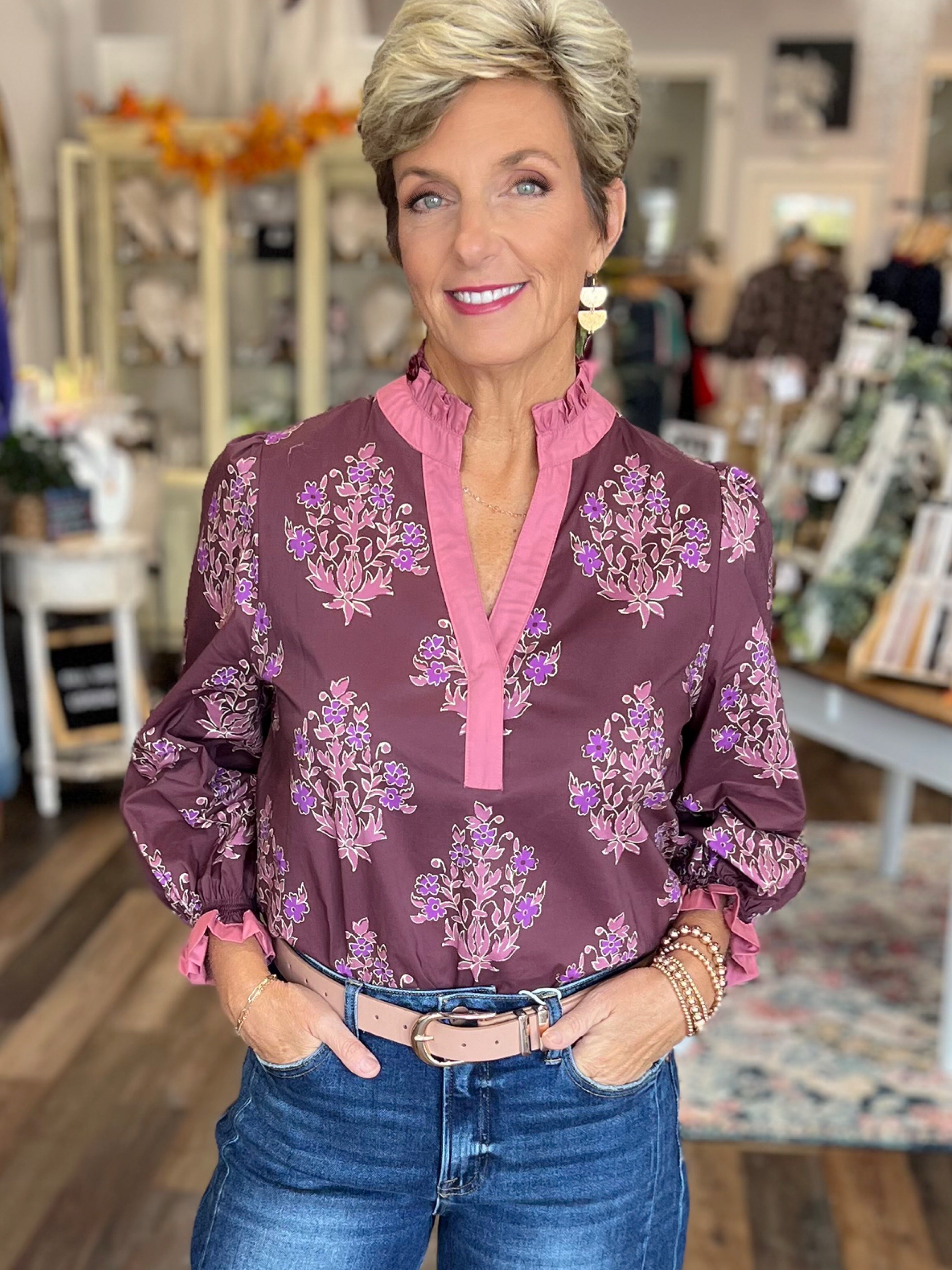 Sweet with a touch of sophistication, The Blossom Lane Blouse brings a fresh take on florals with its rich mauve tones and contrast pink trim. The ruffled neckline and subtle smocking at the cuffs add a feminine finish, while the soft and light cotton fabric keeps you feeling comfortable and confident. The hidden snap closure is a great detail, too, keeping it modest even when bending down. It’s the kind of top that looks just as lovely for Sunday brunch as it does under a blazer for workday charm.
