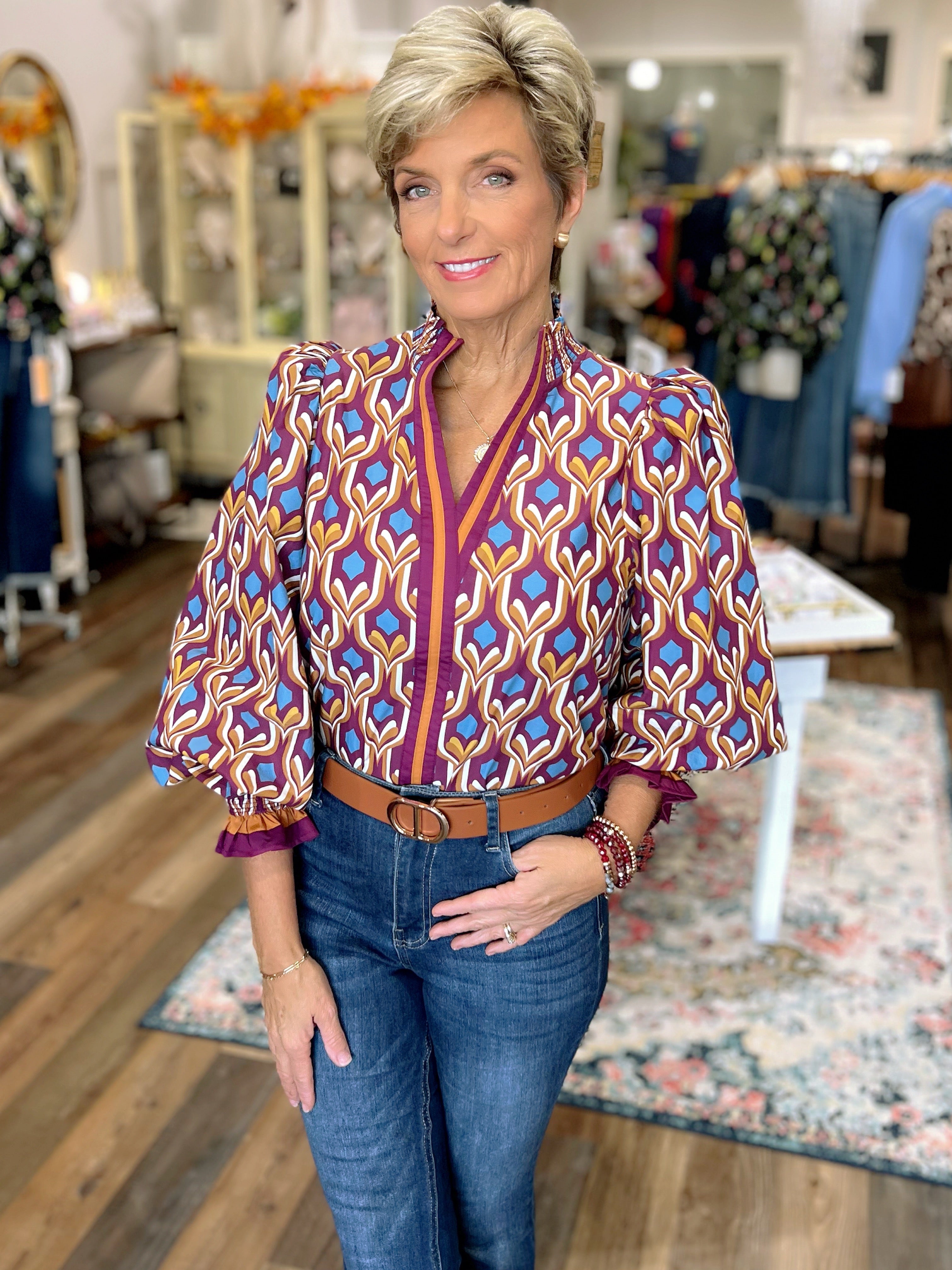 Make a statement without saying a word in The Bold Geometry Blouse. Bursting with vibrant color and retro-inspired print, this top turns every outing into a moment worth remembering. The smocked mock neck and cuffs add just the right touch of texture and feminine flair, while the split neckline and contrast trim give it that extra pop of personality. Lightweight and breathable, it’s perfect for everything from workday meetings to weekend brunches.