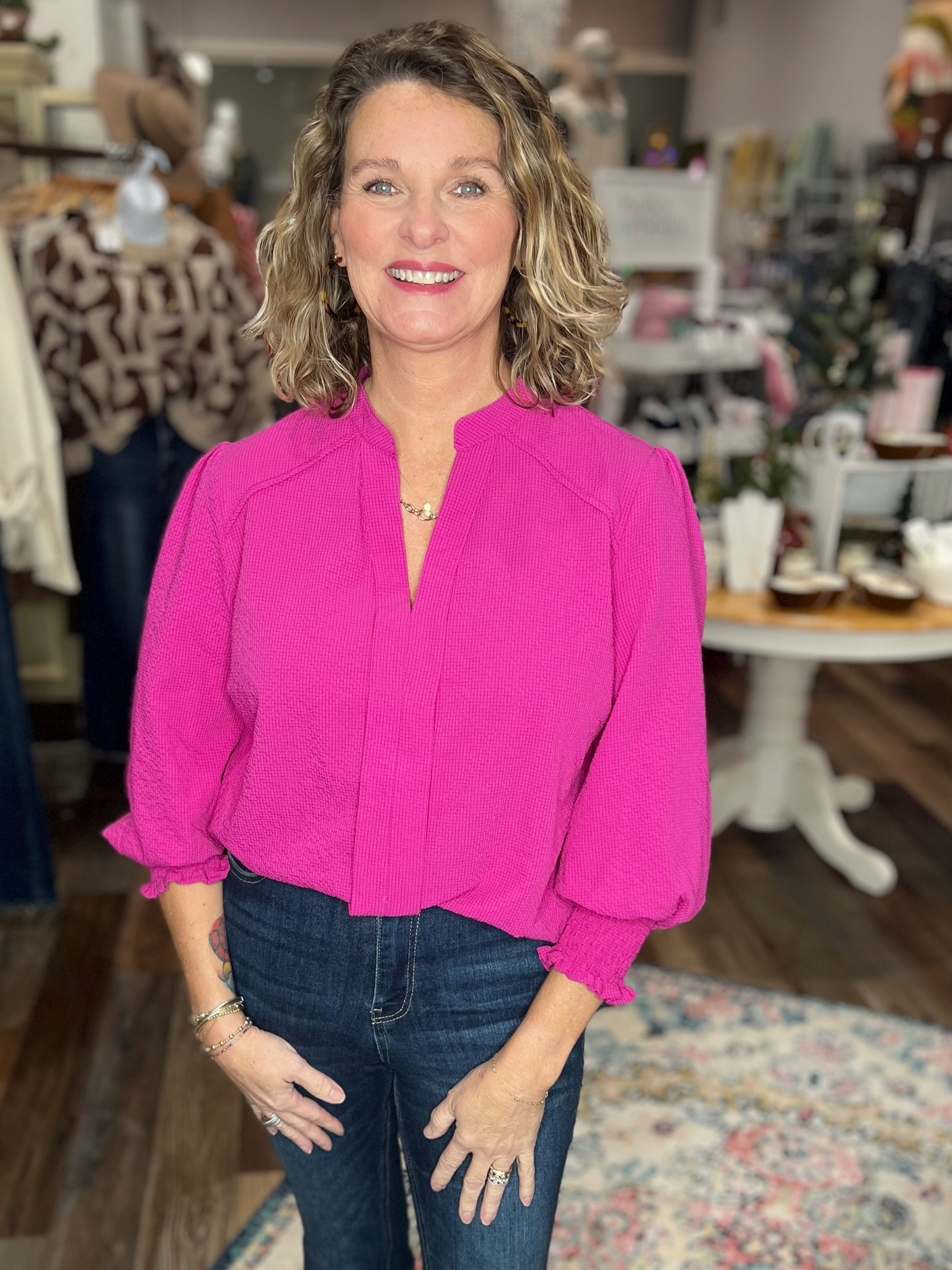 Bright, feminine, and effortlessly polished, The Uptown Grace Blouse is the kind of top that instantly elevates your outfit. Made from a lightly textured woven fabric, it features a soft V-neckline, subtle piping detail, and billowed 3/4 sleeves finished with flattering smocked cuffs. The relaxed, flowy fit makes it easy to wear — comfortable enough for everyday, yet refined enough for dinner out or the office.