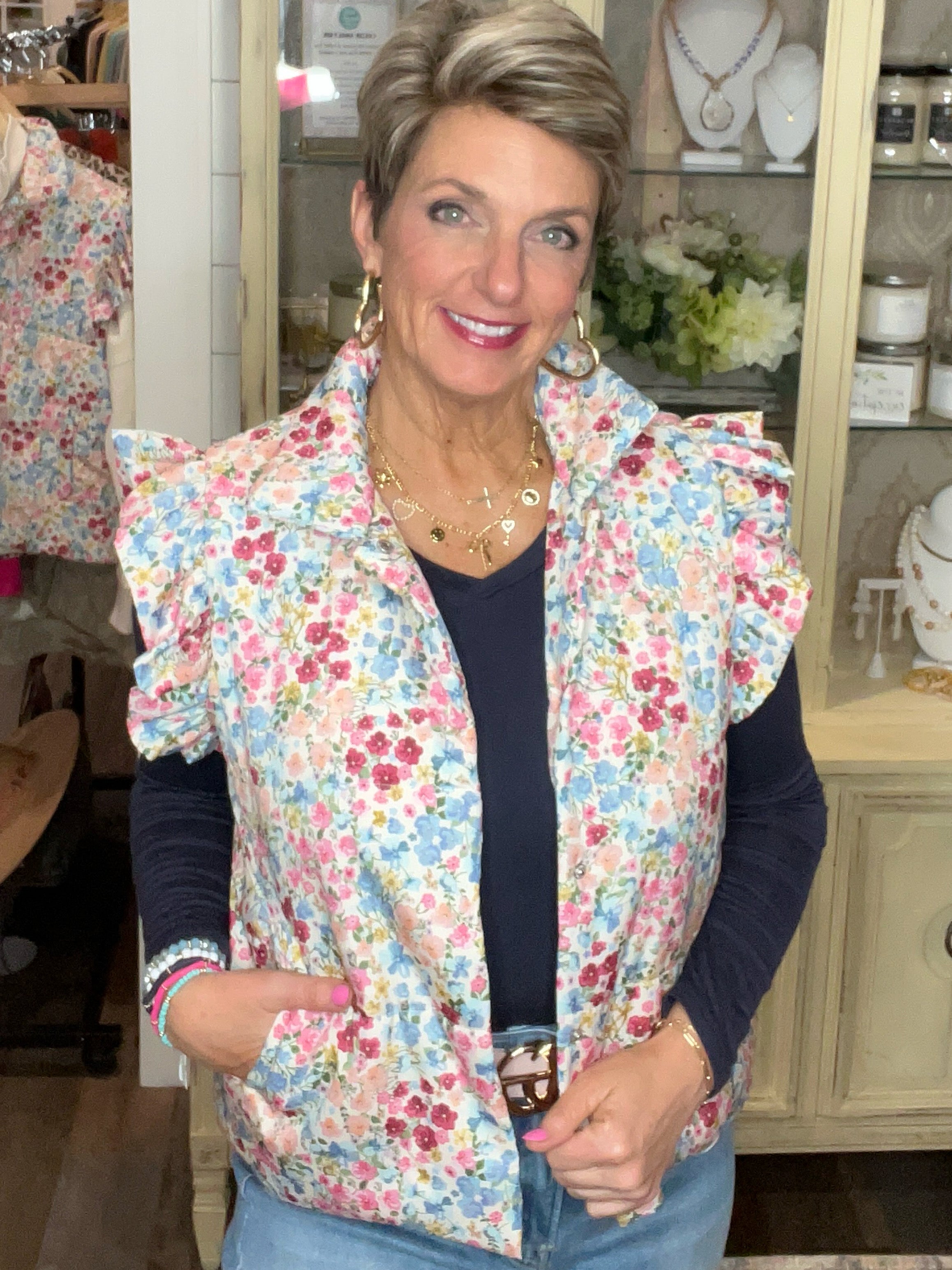 Introducing the Liana Floral Puffer Vest - a beautiful, stylish addition to your wardrobe! This puffer vest features a gorgeous floral pattern and playful ruffle sleeves, making it the perfect choice for those looking to add a touch of color to their outfit.