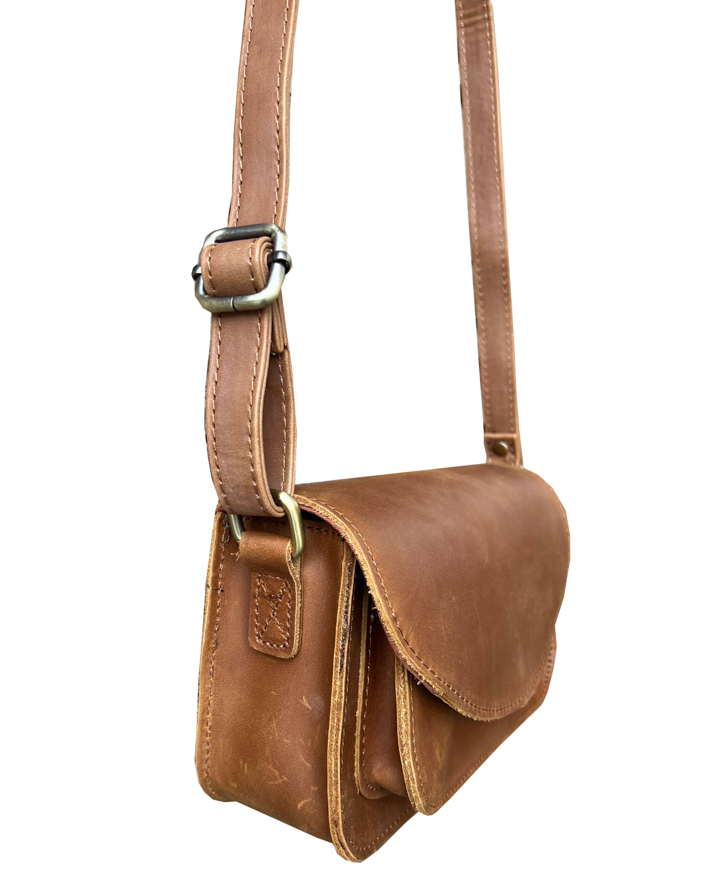 This crazy horse genuine leather crossbody is your perfect partner for travel, work, school, or a night out. Chic and practical, it features three compartments to keep your wallet, phone, keys, and little treasures neatly in place. You'll find two open pockets under the flap, a zipper pocket inside, plus a handy 7" zippered pocket on the back. The adjustable strap lets you switch from crossbody to shoulder style, with a drop from 12” to 24”. Crafted from durable crazy horse leather with a PU leather strap, it measures a compact 8” L x 5” H x 2” W.